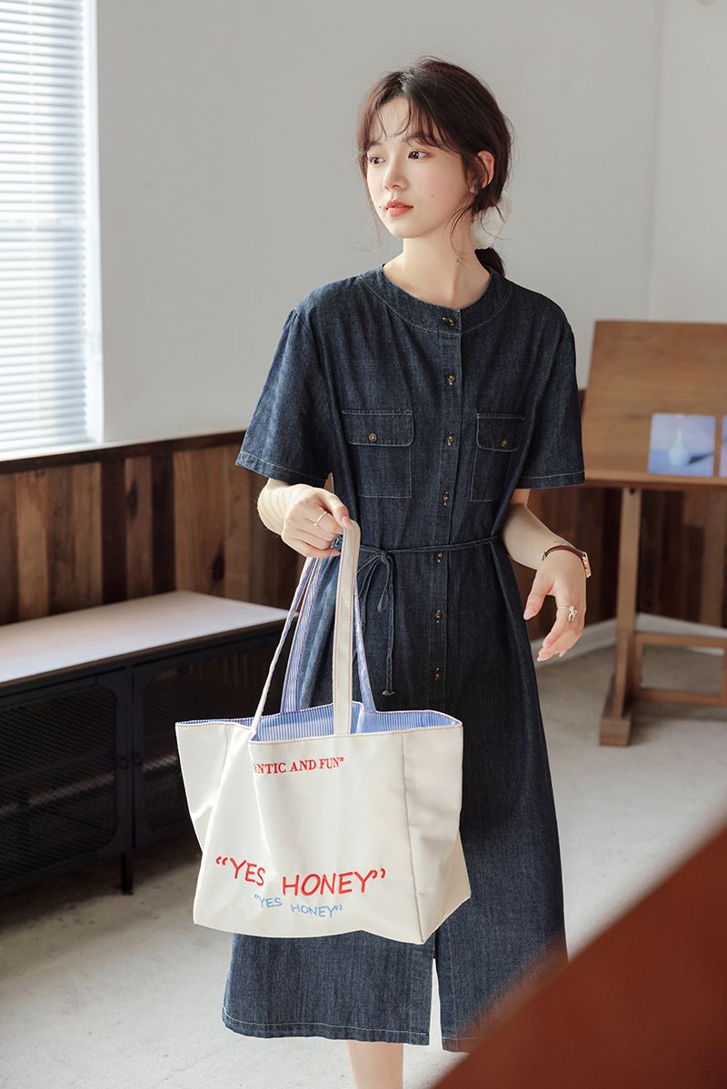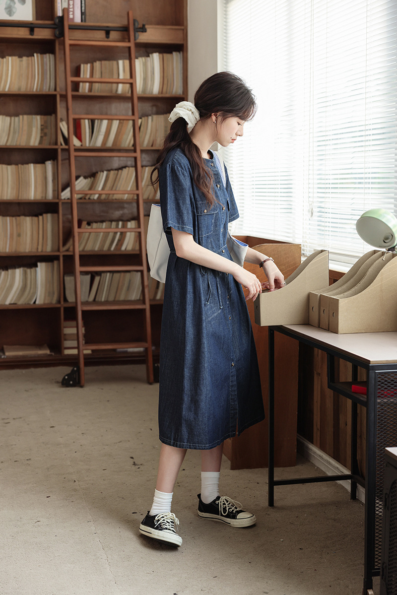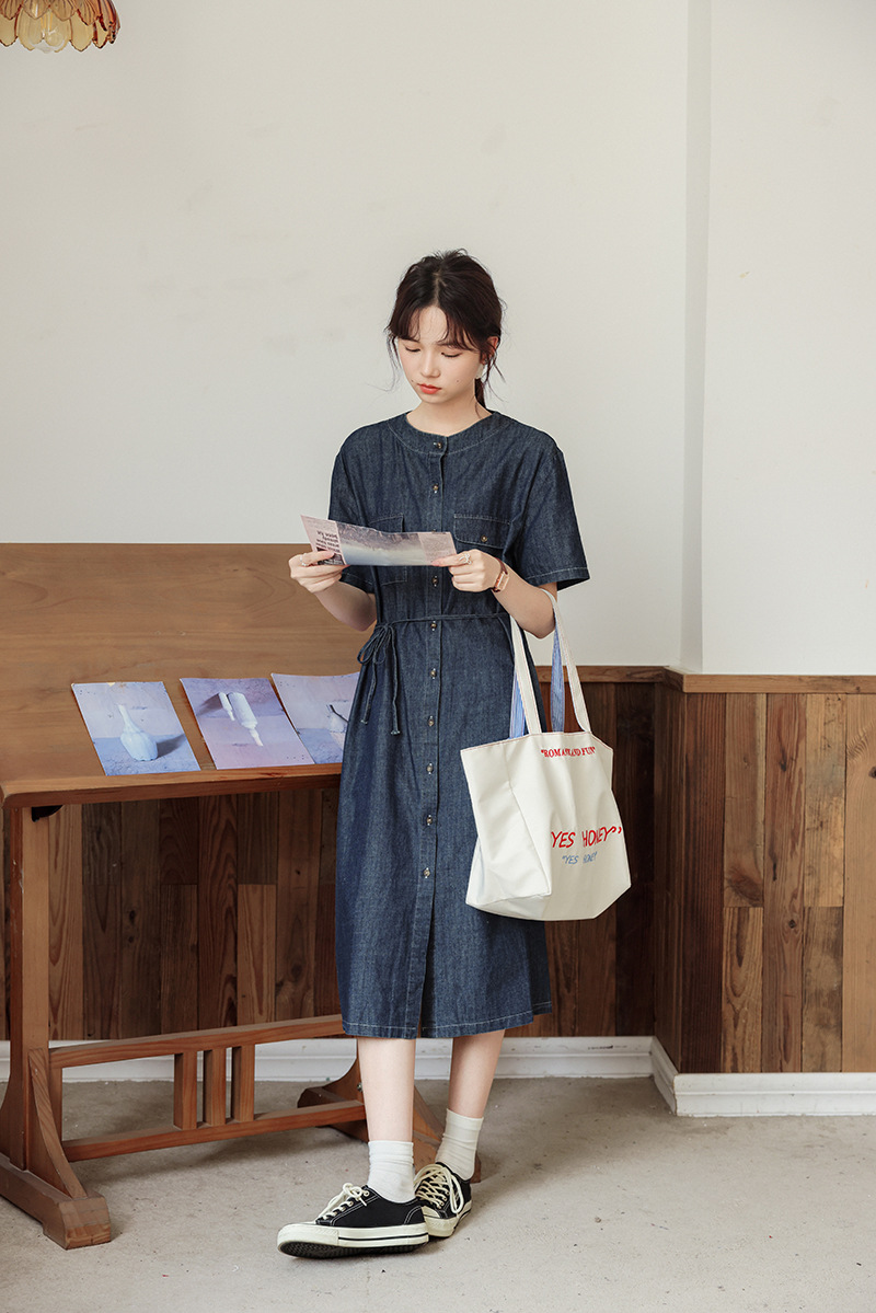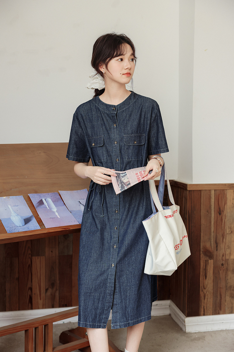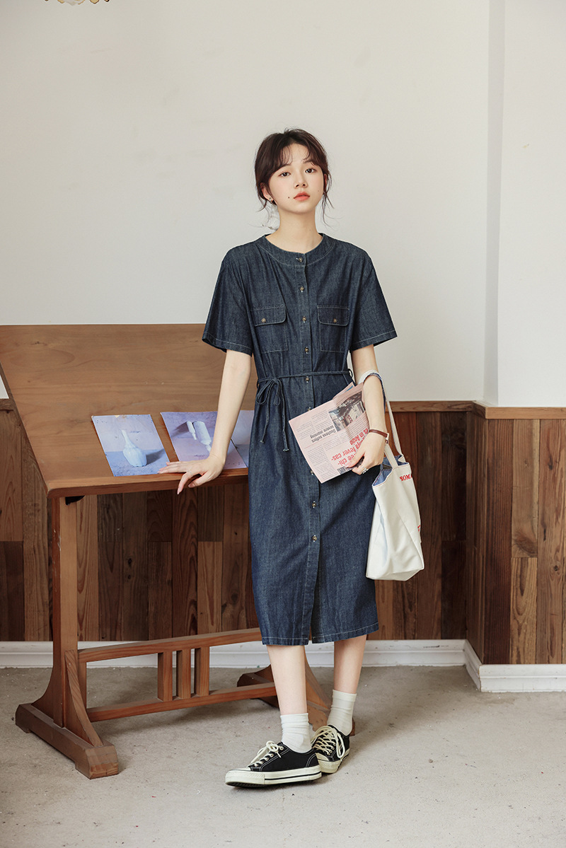 2025 년 여름 새로운 한국 패션 레트로 예술적 타이트 허리 슬리밍 우아한 데님 반팔 둥근 목 원피스 여성