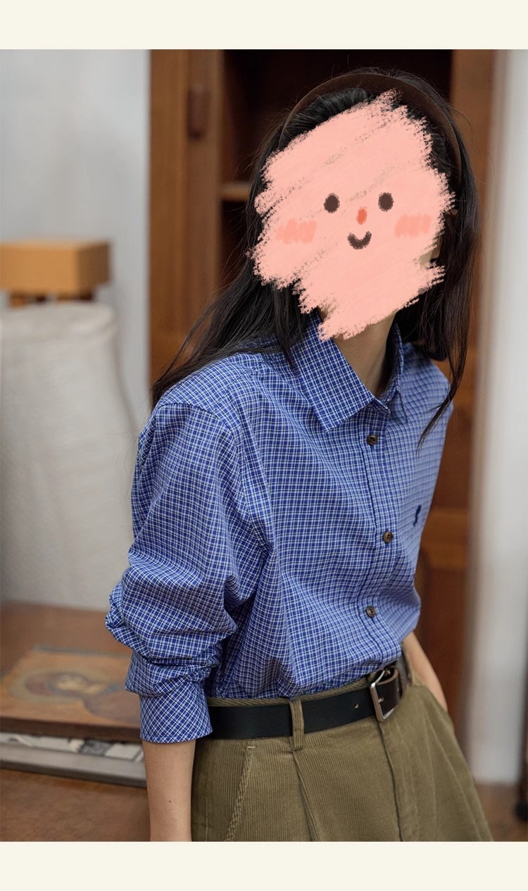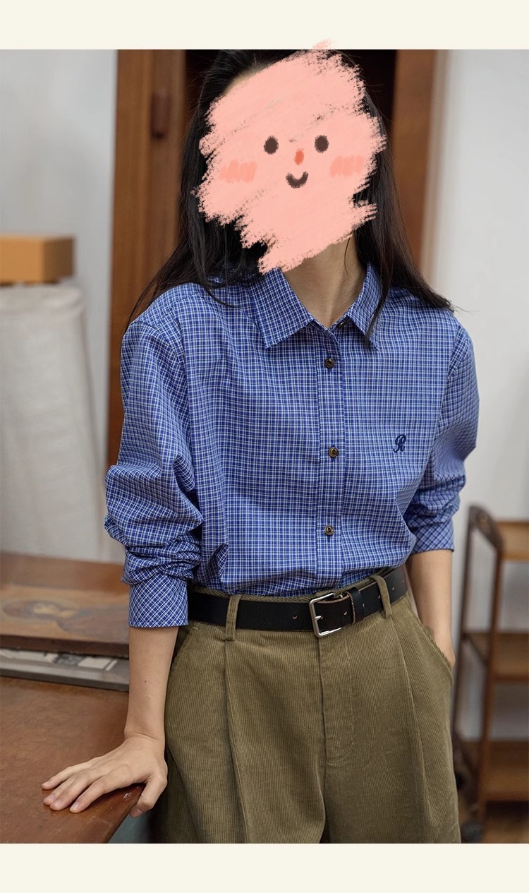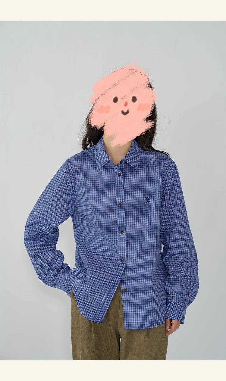 Sea Salt Diary 한국 스타일 다목적 MIU 블루 체크 무늬 셔츠 여성 봄, 가을 새로운 복고풍 통근 셔츠 탑
