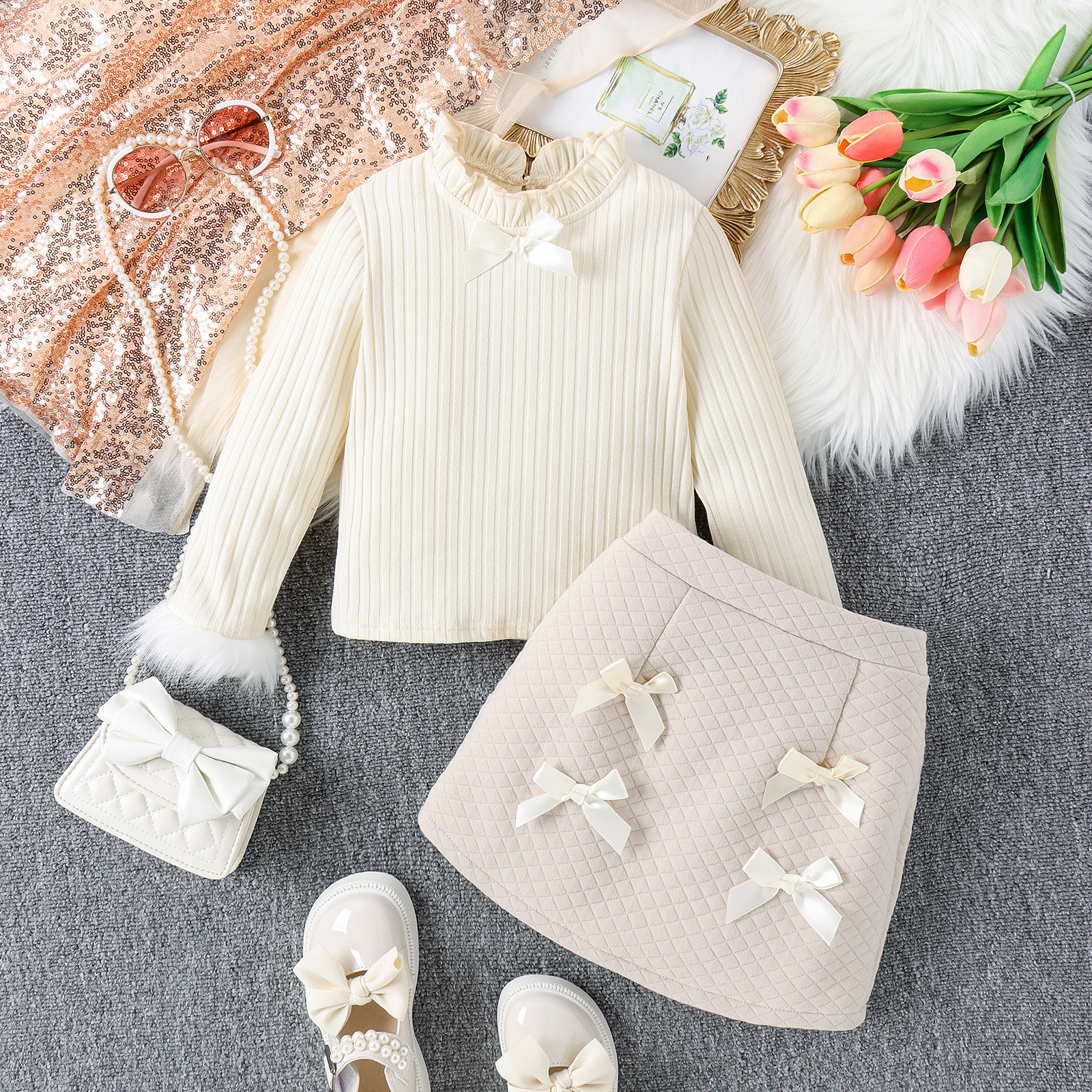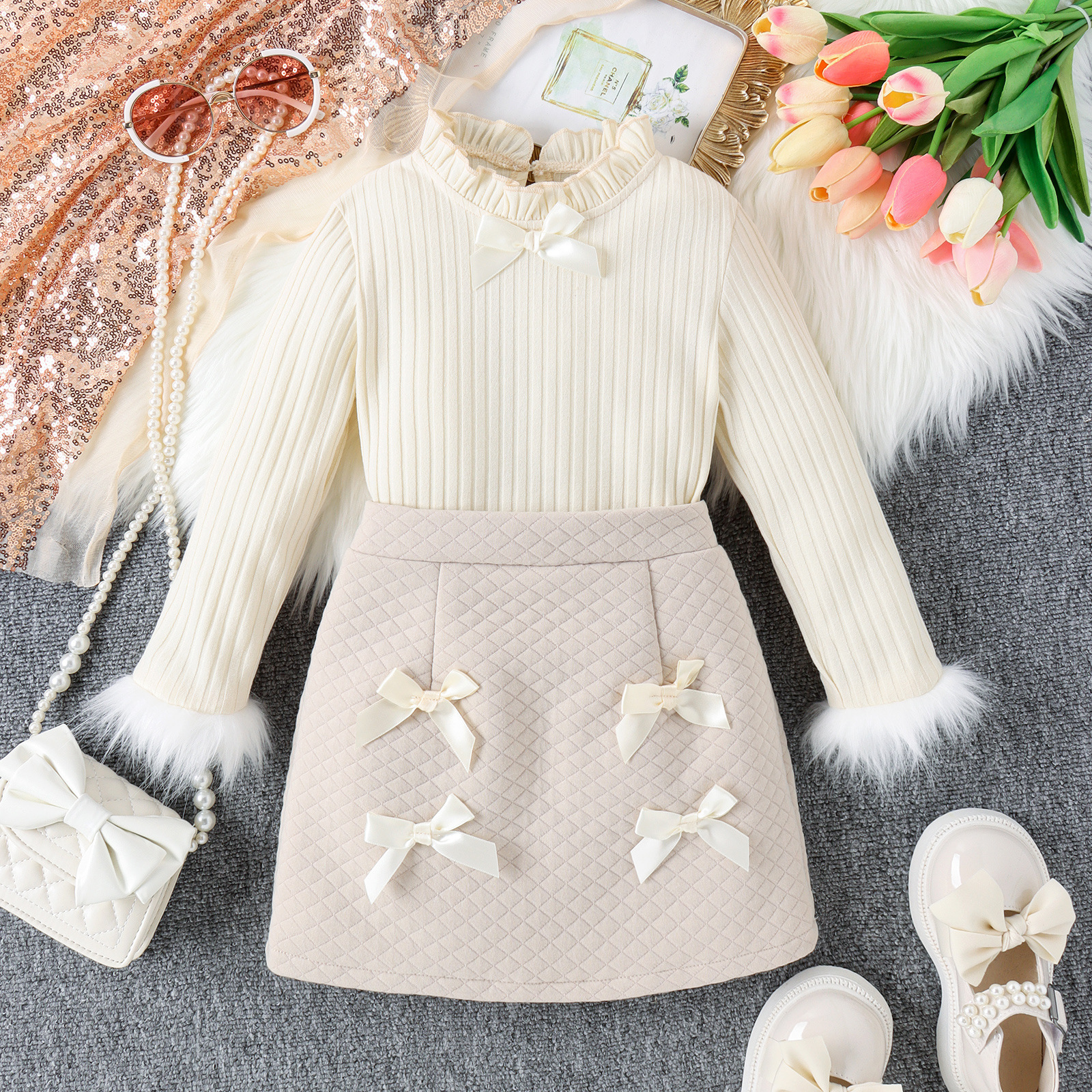 어린이 착용 소녀 치마 세트 봄과 가을 어린이 아기 니트웨어 활 공주 스커트 투피스 코튼 세트
