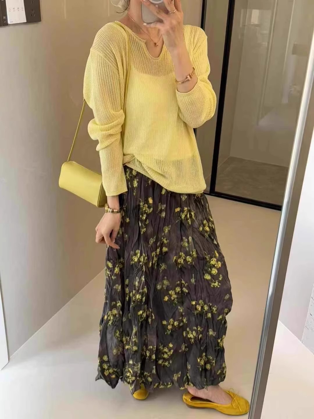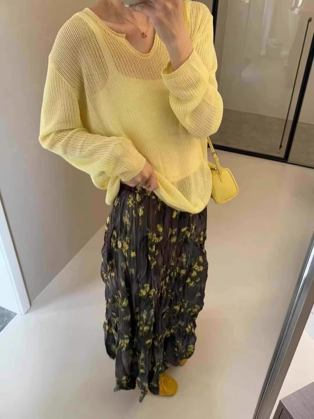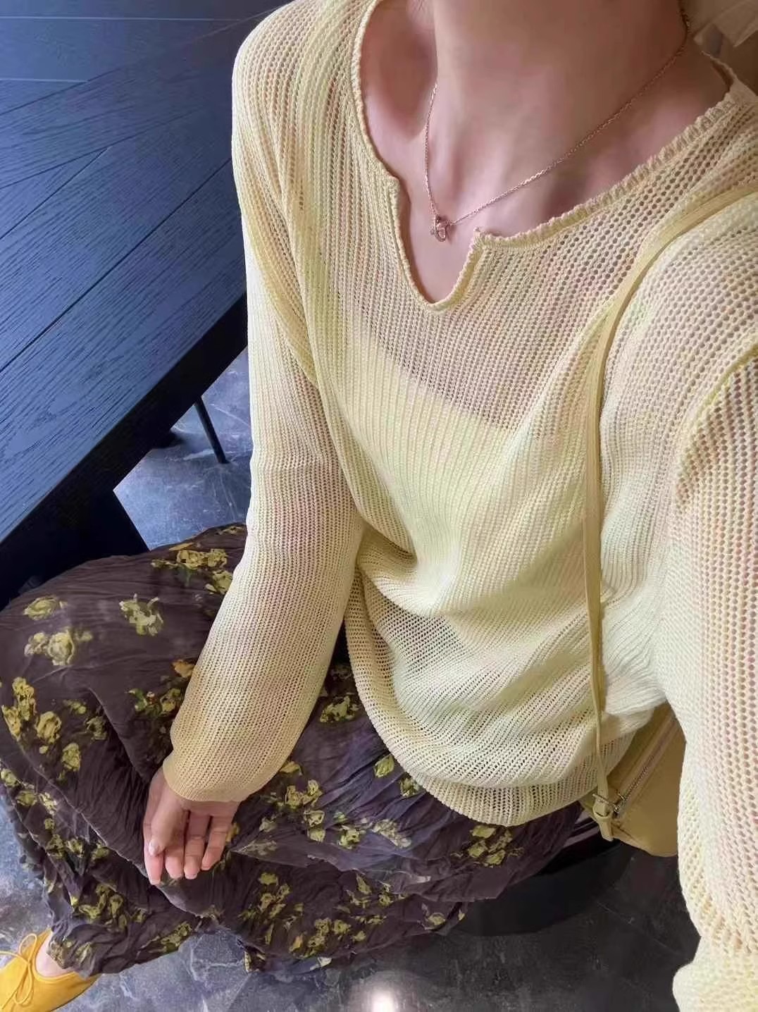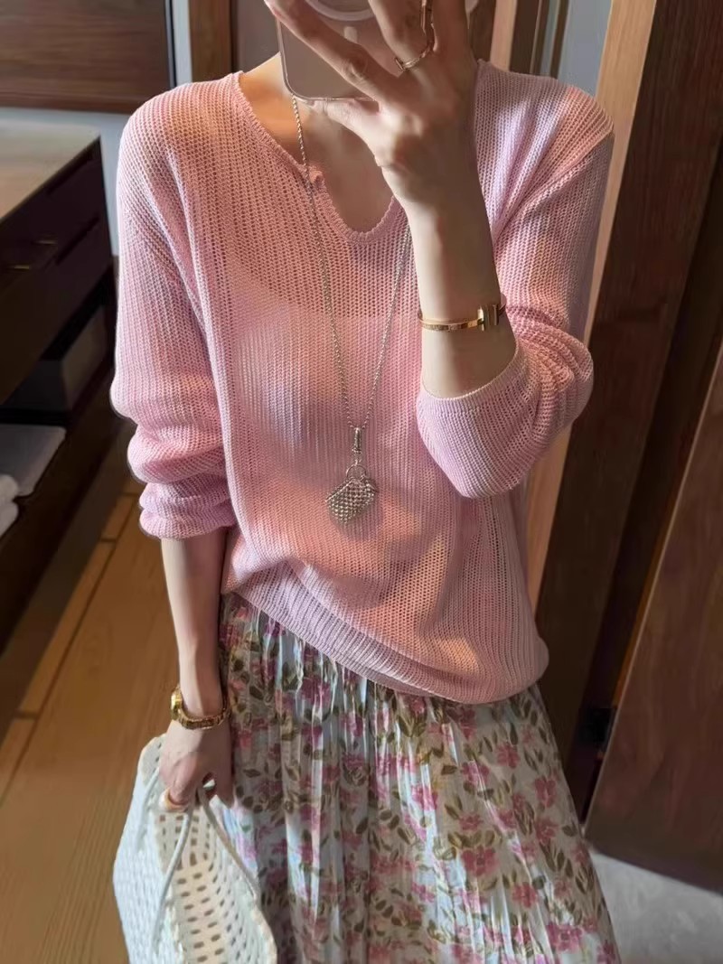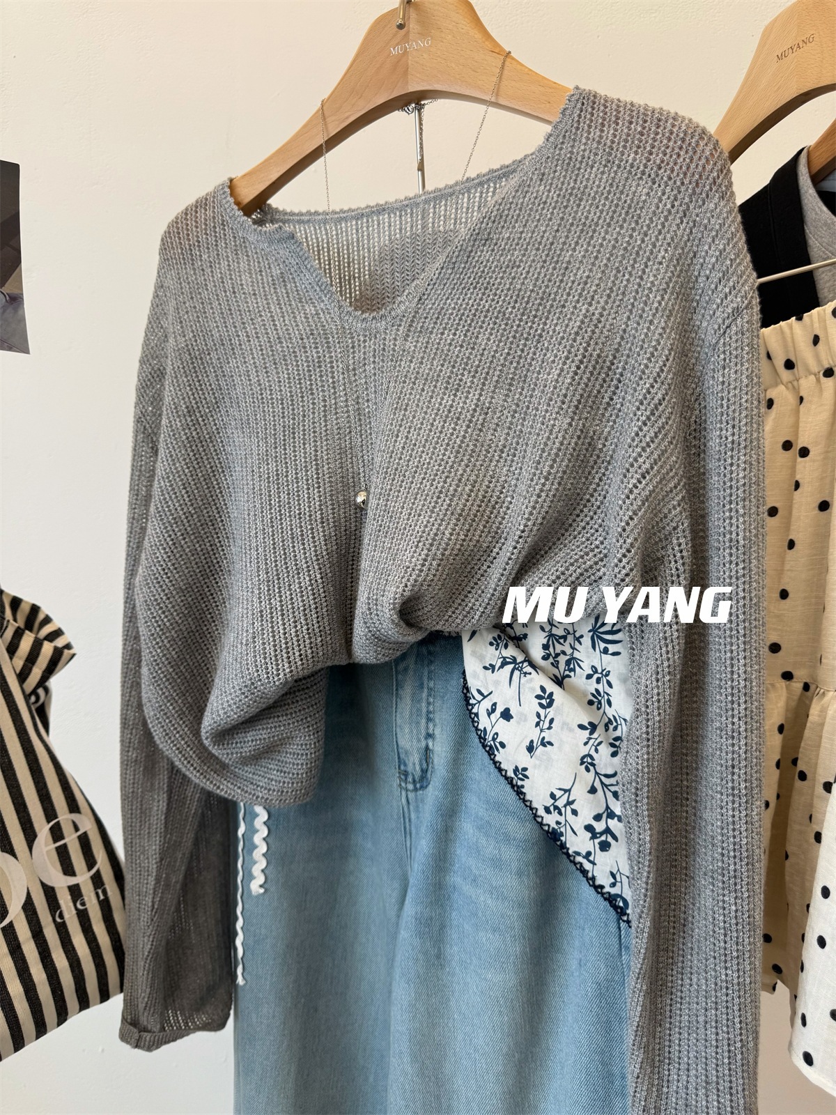 한국 V 넥 얇은 빈 스웨터 여성 여름 작은 외부 아이스 실크 선 스크린 셔츠