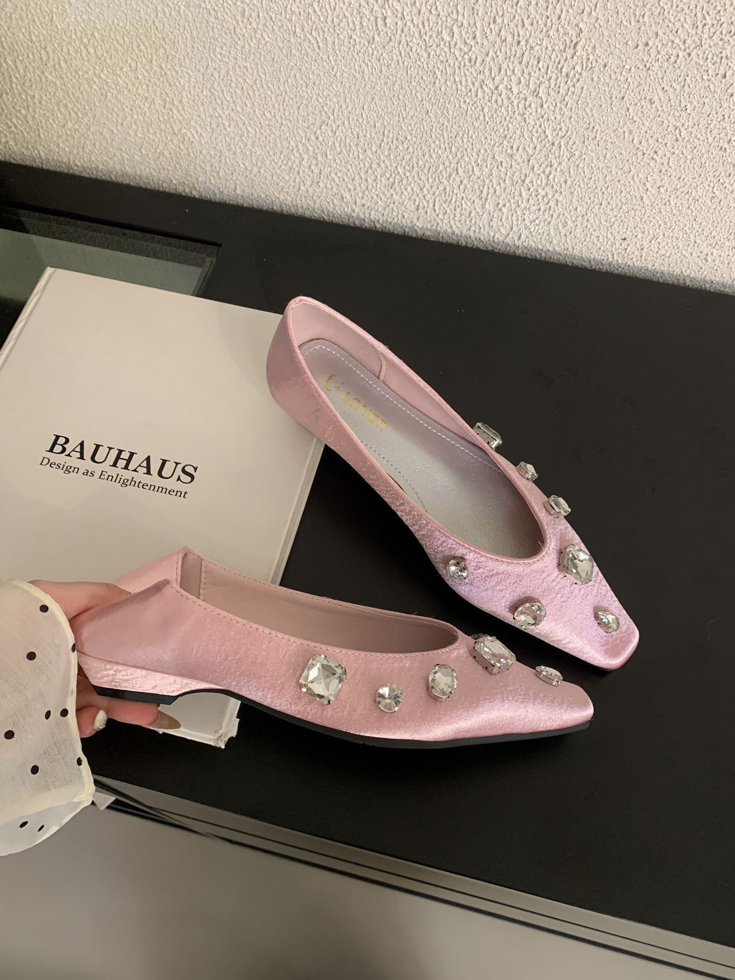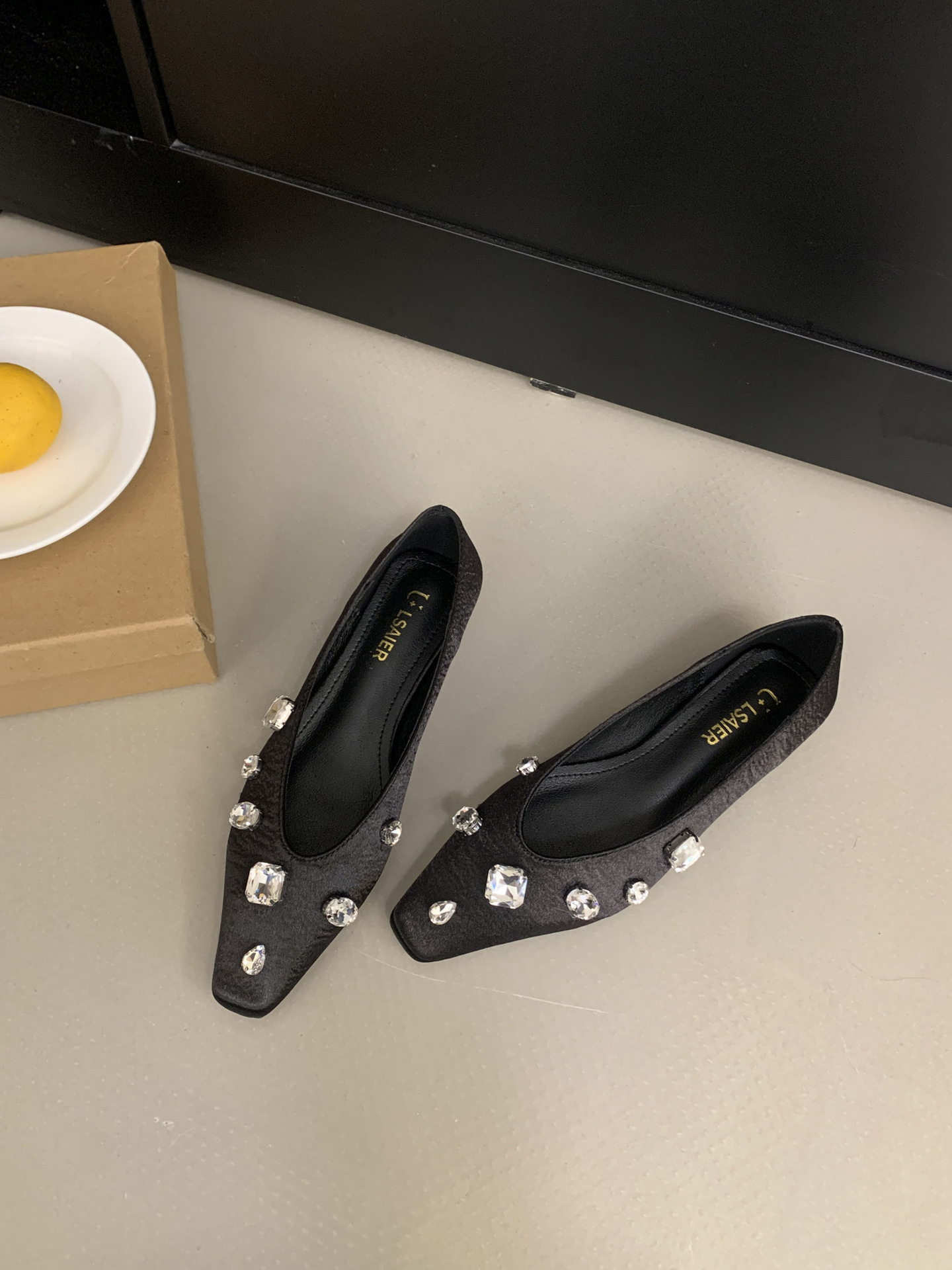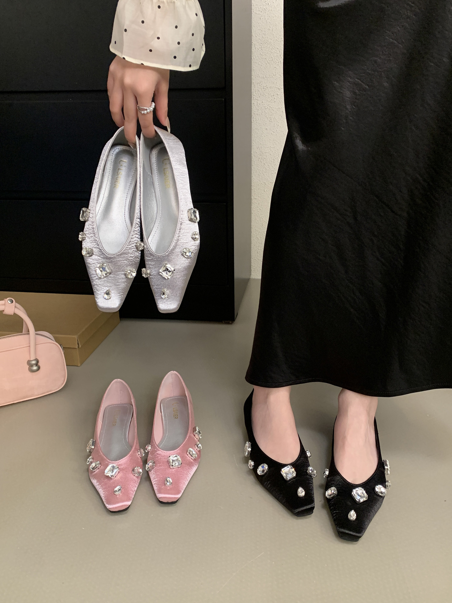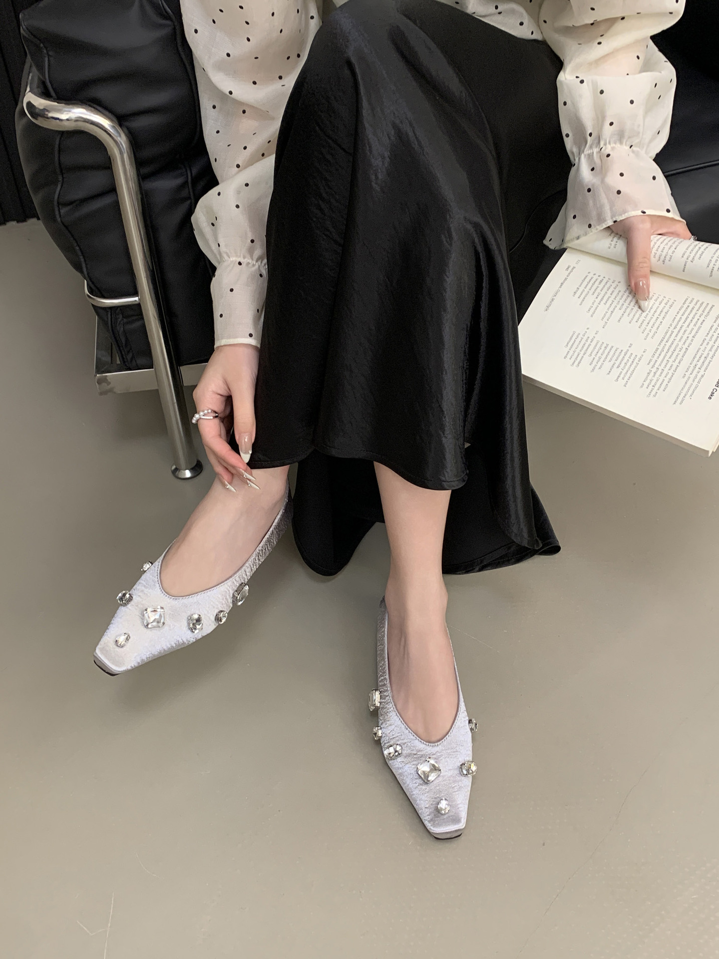 2025 년 여름 새로운 프랑스 새틴 얕은 광장 헤드 라인스톤 디자인 우아한 슬립 온 메리 제인 신발
