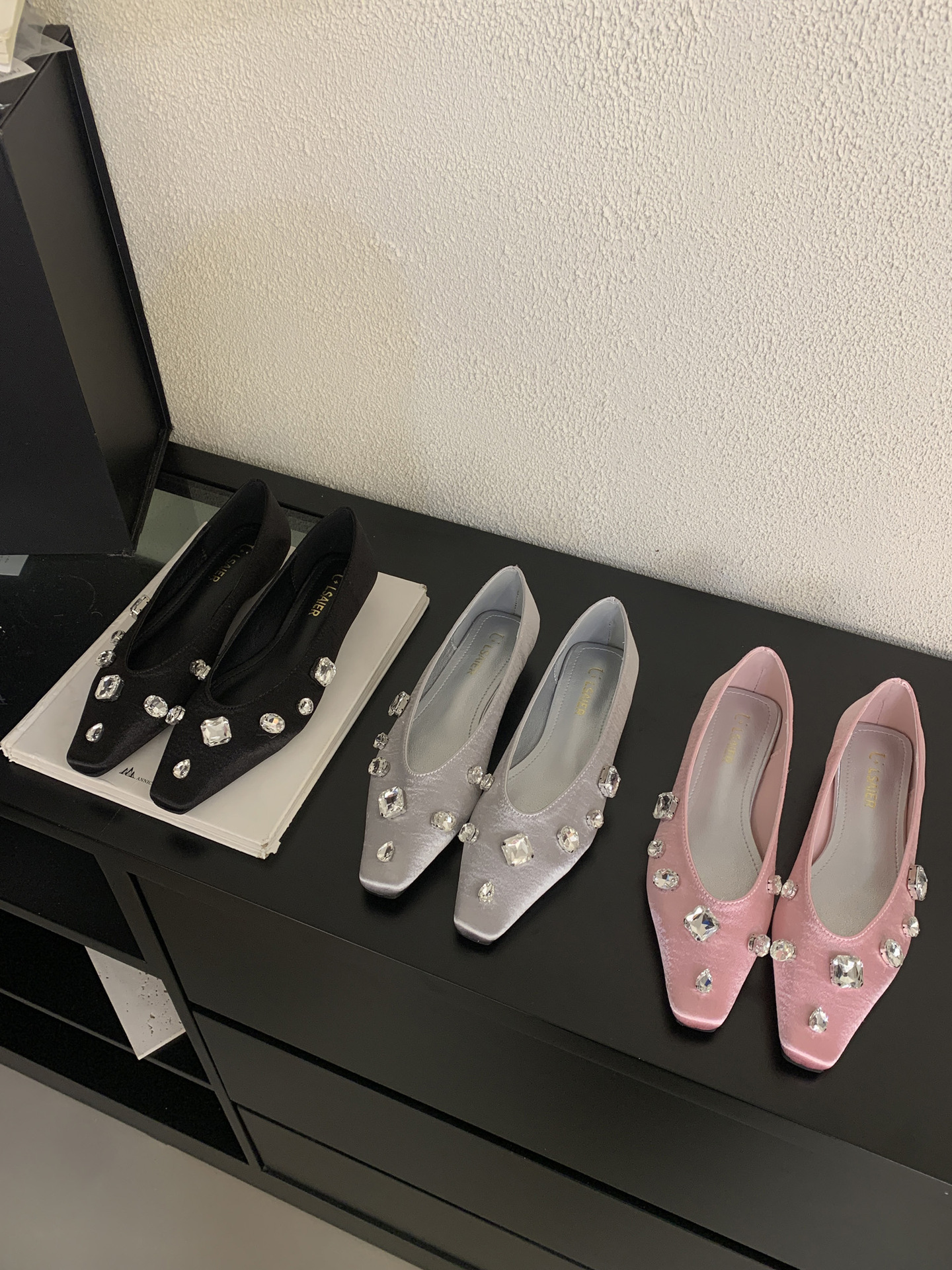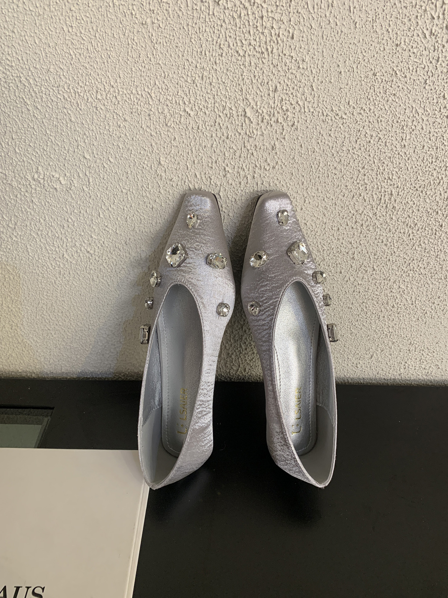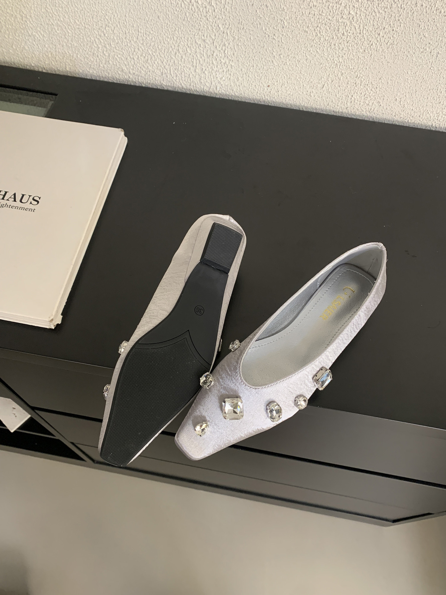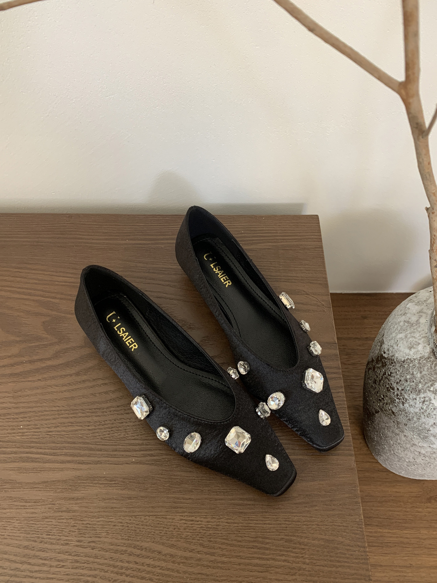 2025 년 여름 새로운 프랑스 새틴 얕은 광장 헤드 라인스톤 디자인 우아한 슬립 온 메리 제인 신발