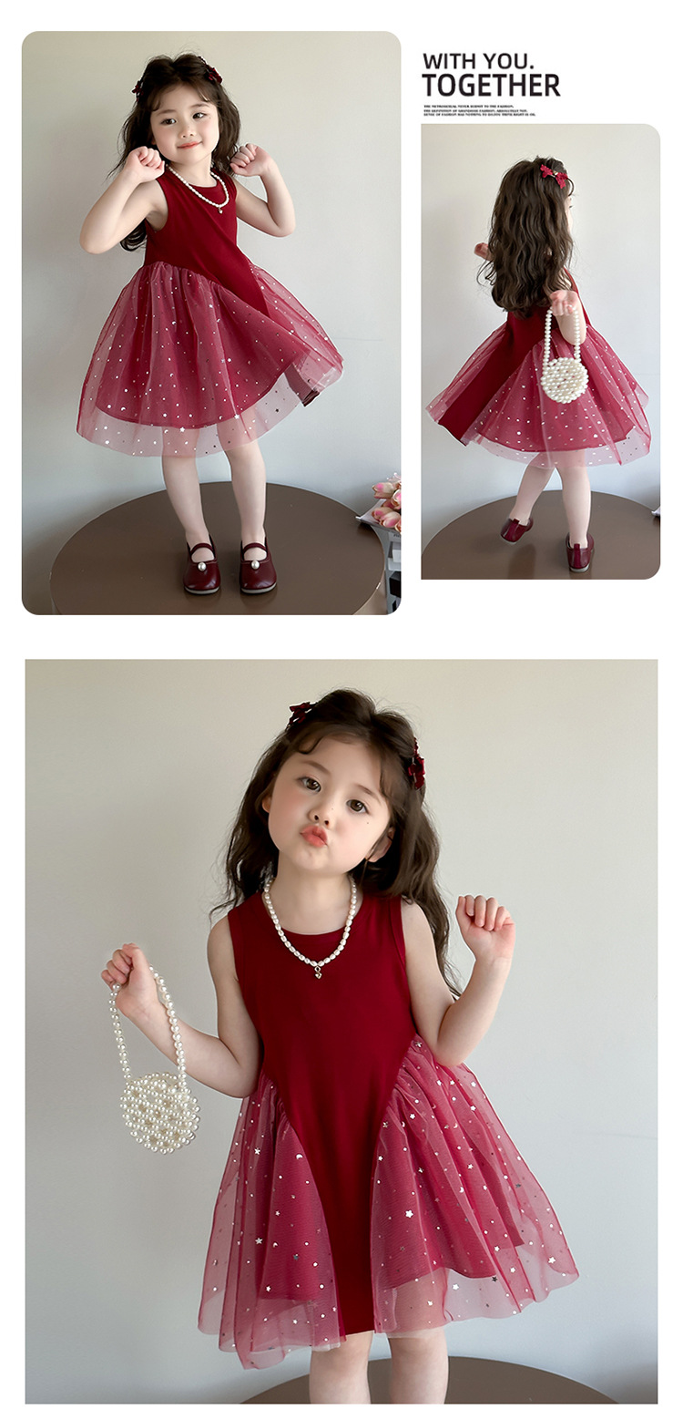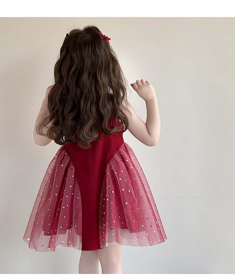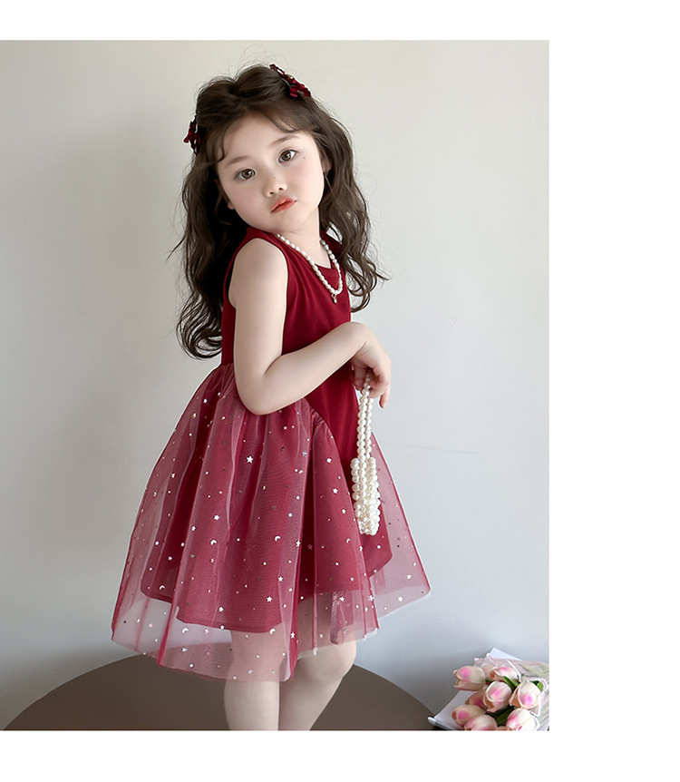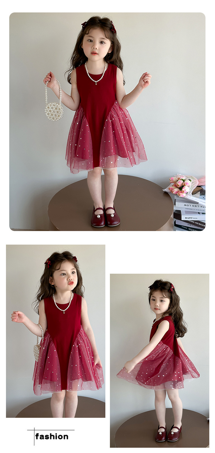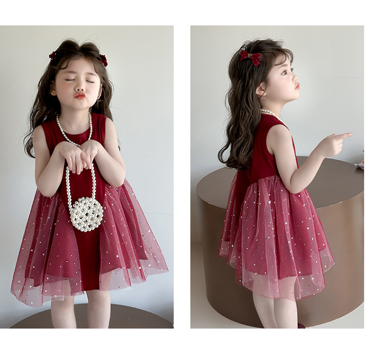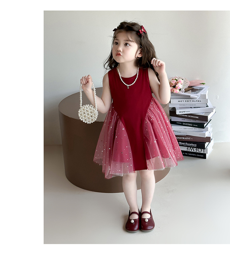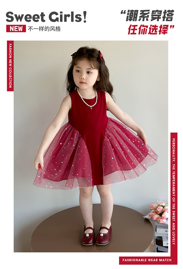 소녀 빛나는 빨간 베일 원피스 2025 여름 새로운 패션 소녀 세련된 공주 원피스 중소 어린이 원피스스토어 가기