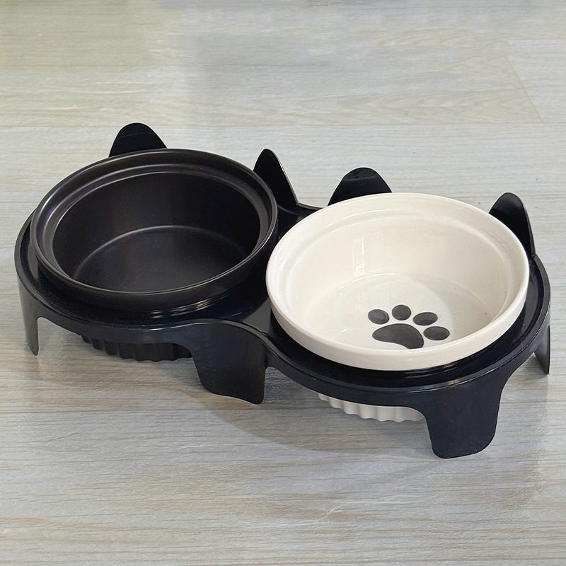 • 黑白陶瓷双碗+黑色防漏食架☆