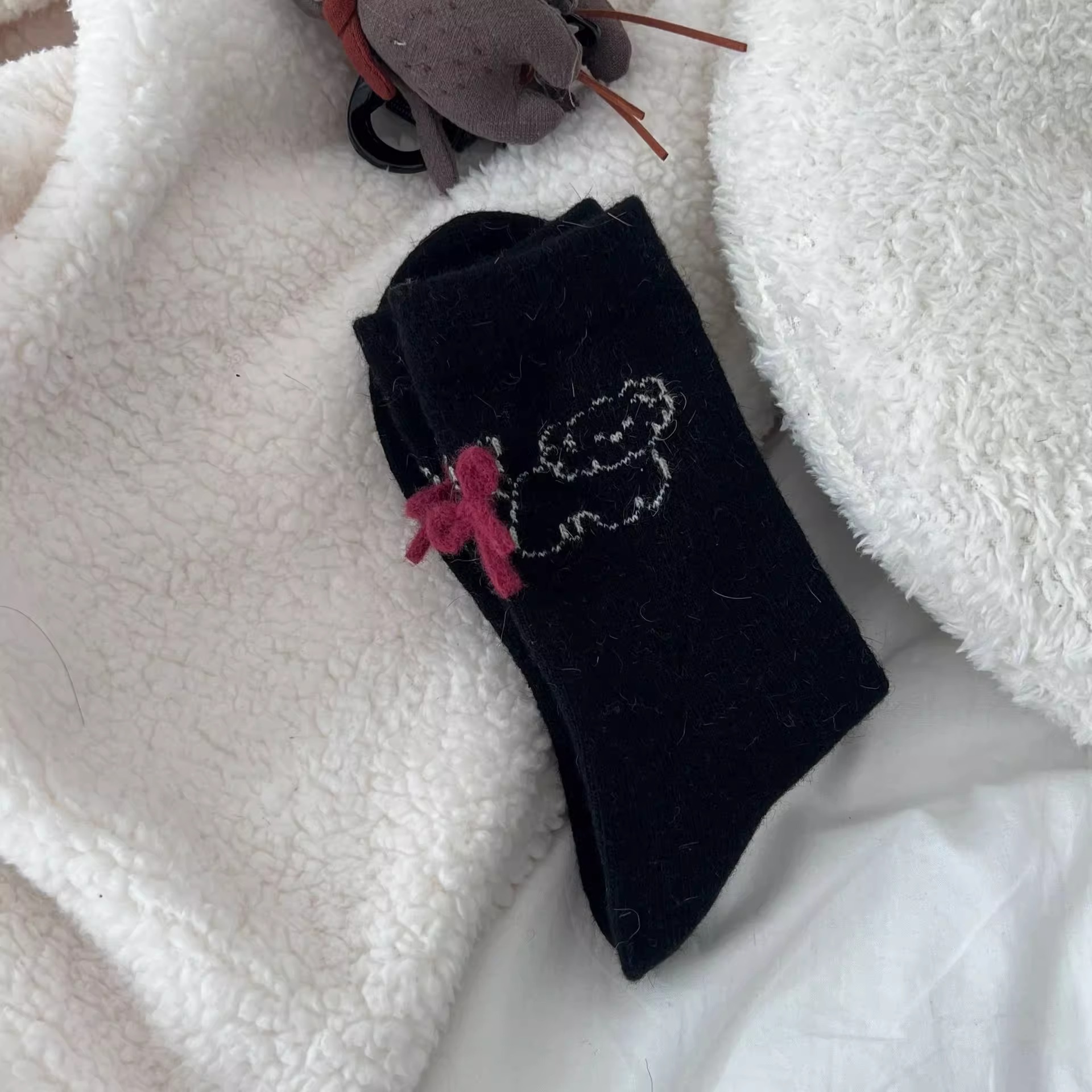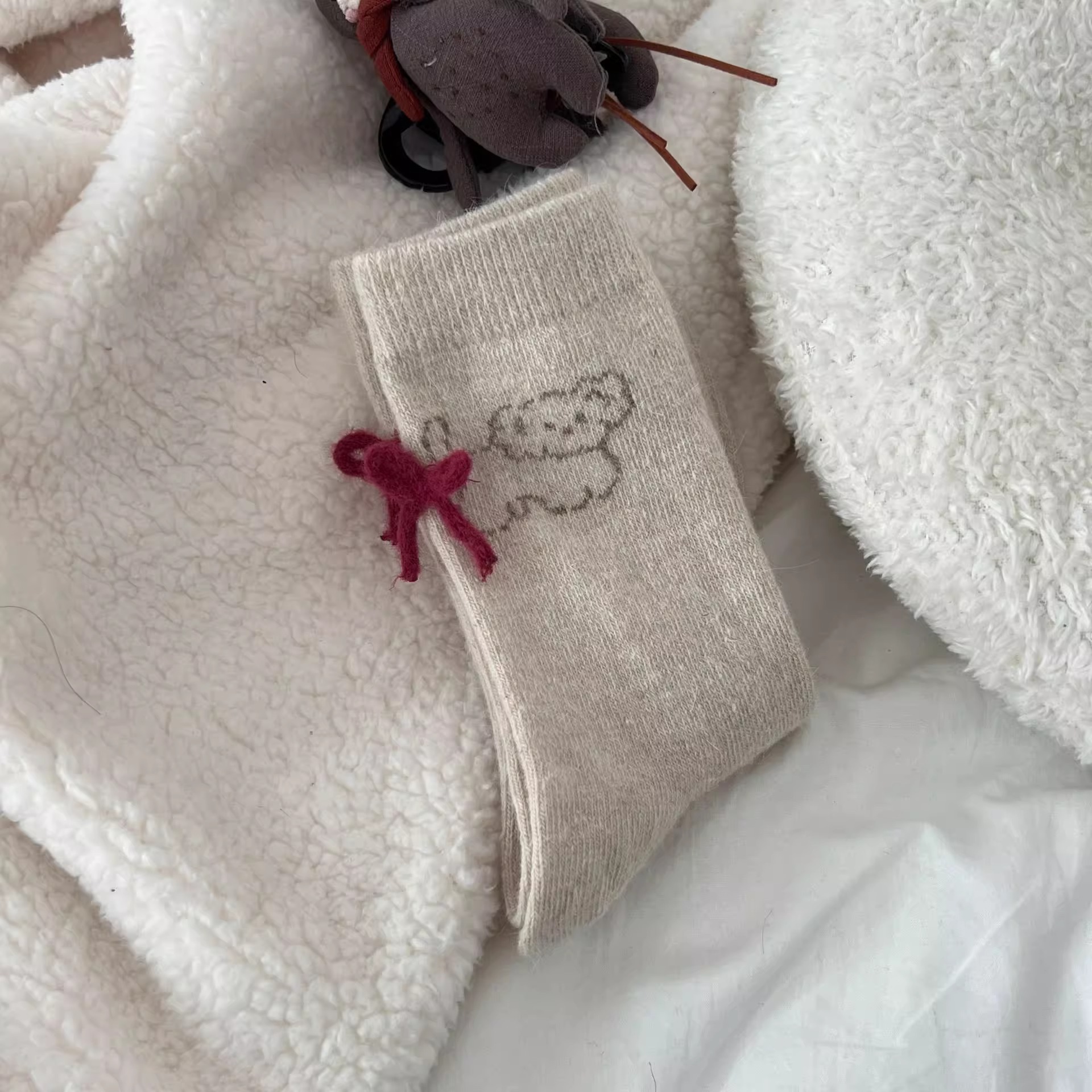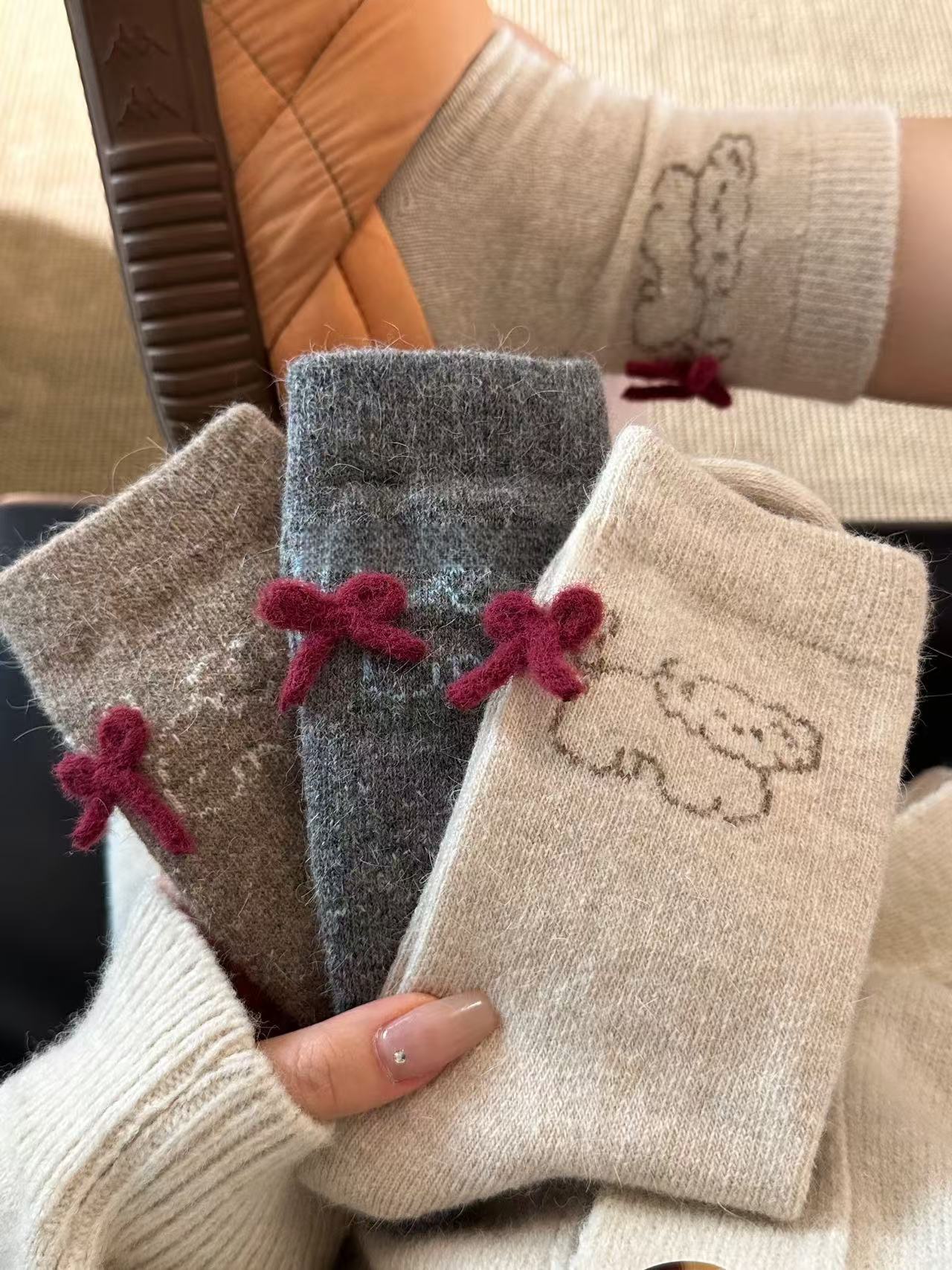 토끼털 강아지 양말 여성용 꼬리 장식품 빨간 나비 리본 귀여운 일본식 양말 따뜻한 여성용 양말 겨울 스타일