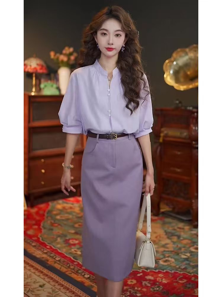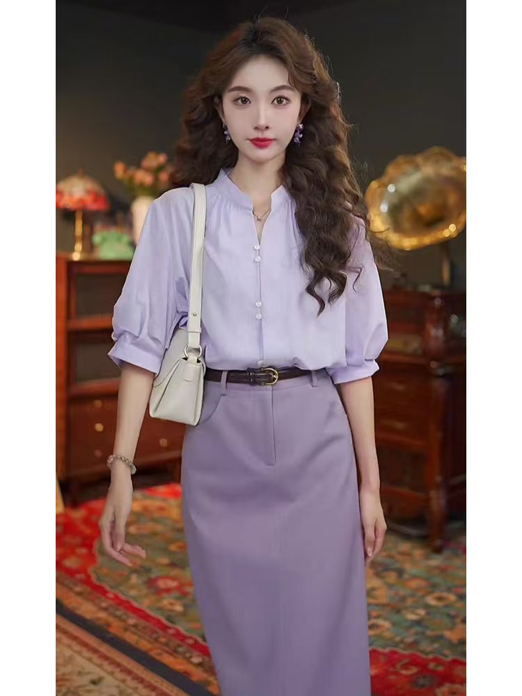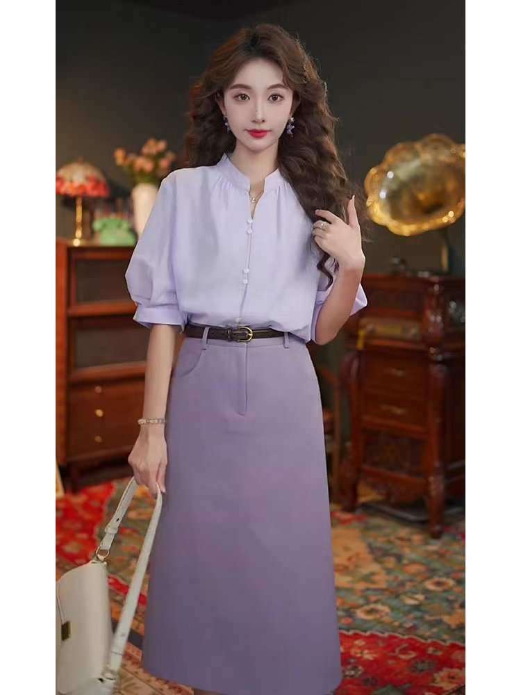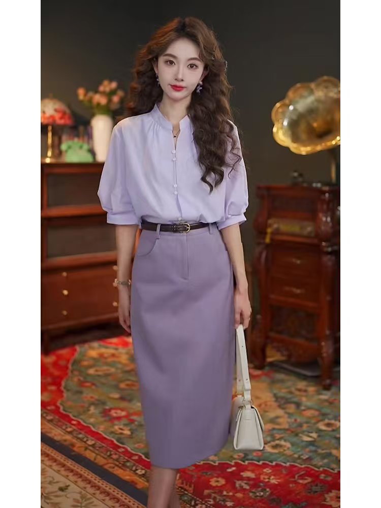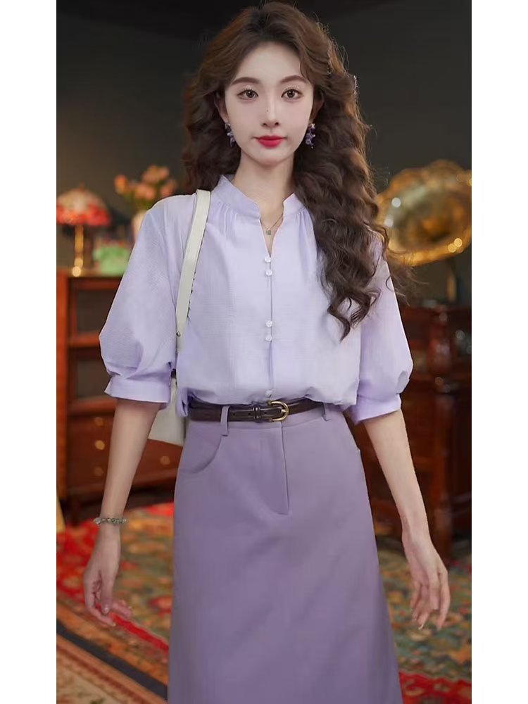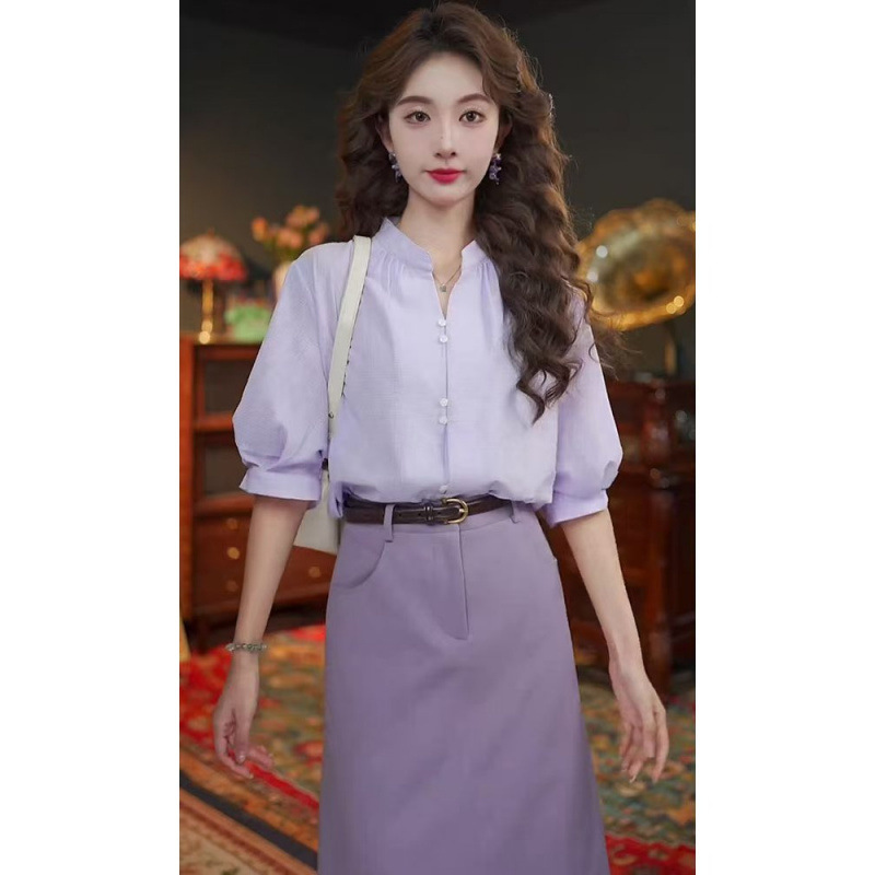 빈티지 Kaorungata 보라색 반팔 셔츠 여성용 여름 새로운 느슨한 홍콩 스타일 우아한 스타일 라이트 럭셔리 시대 감소 탑 (수직 칼라 포함)