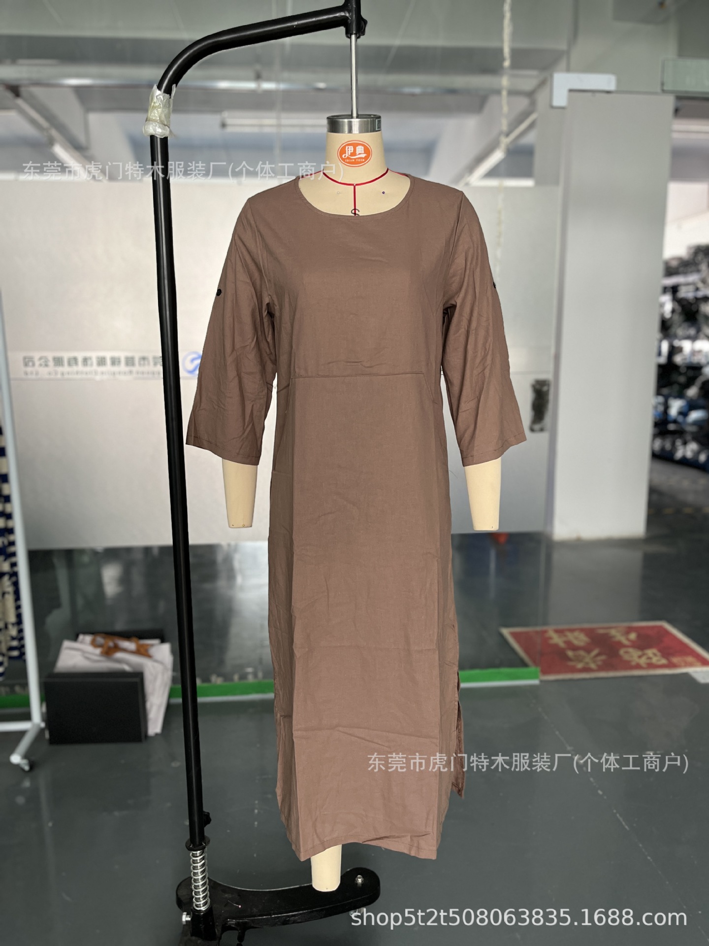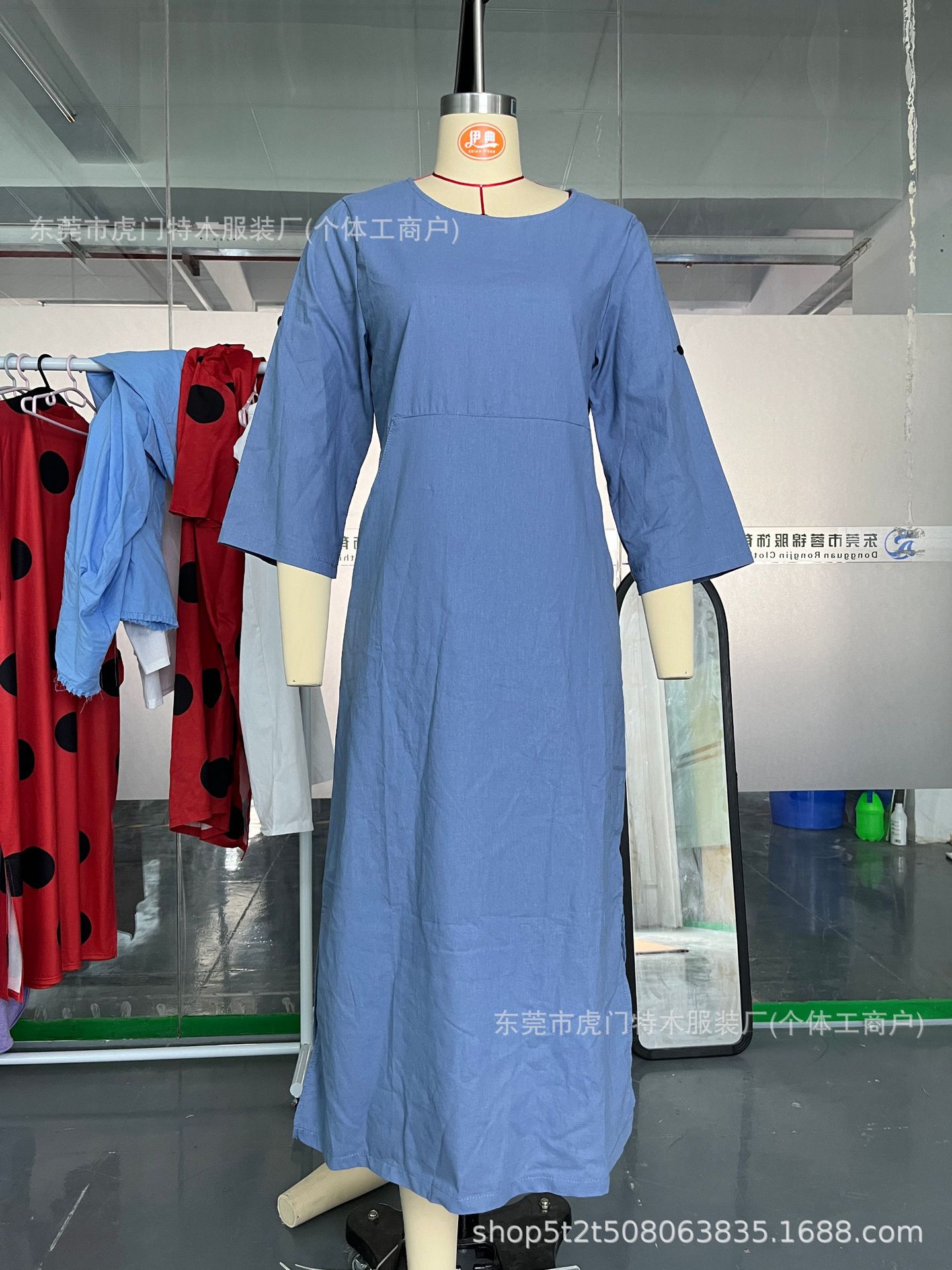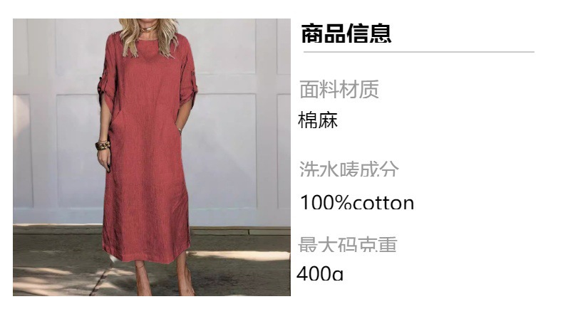 2024 유럽과 미국의 봄과 여름 폭발 여성 독립 스테이션 코튼 및 리넨 솔리드 컬러 캐주얼 라운드 넥 더블 사이드 포켓 롱 원피스스토어 가기
