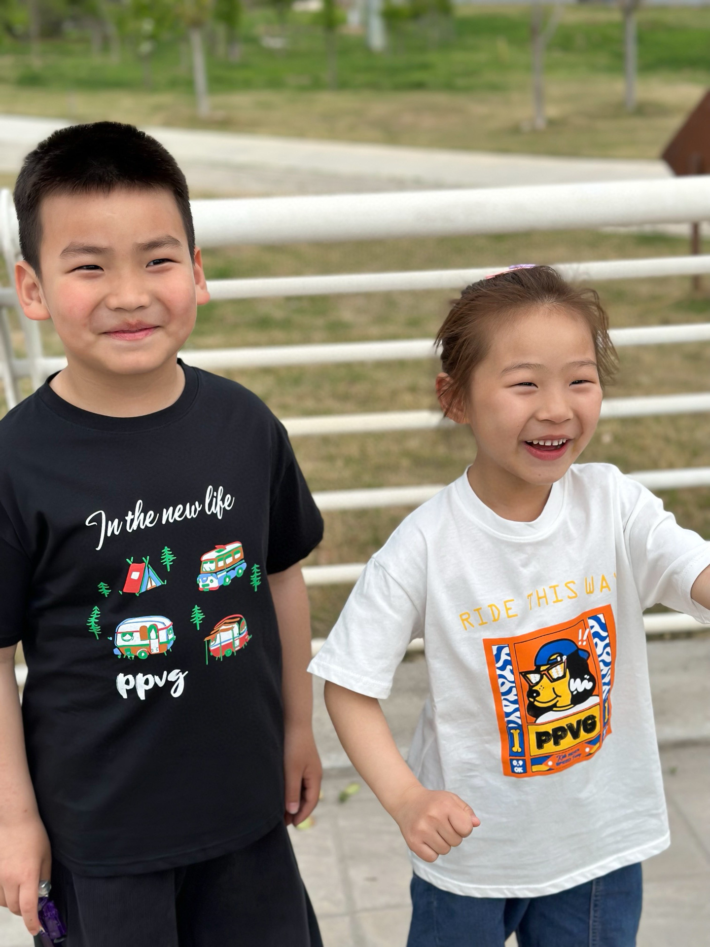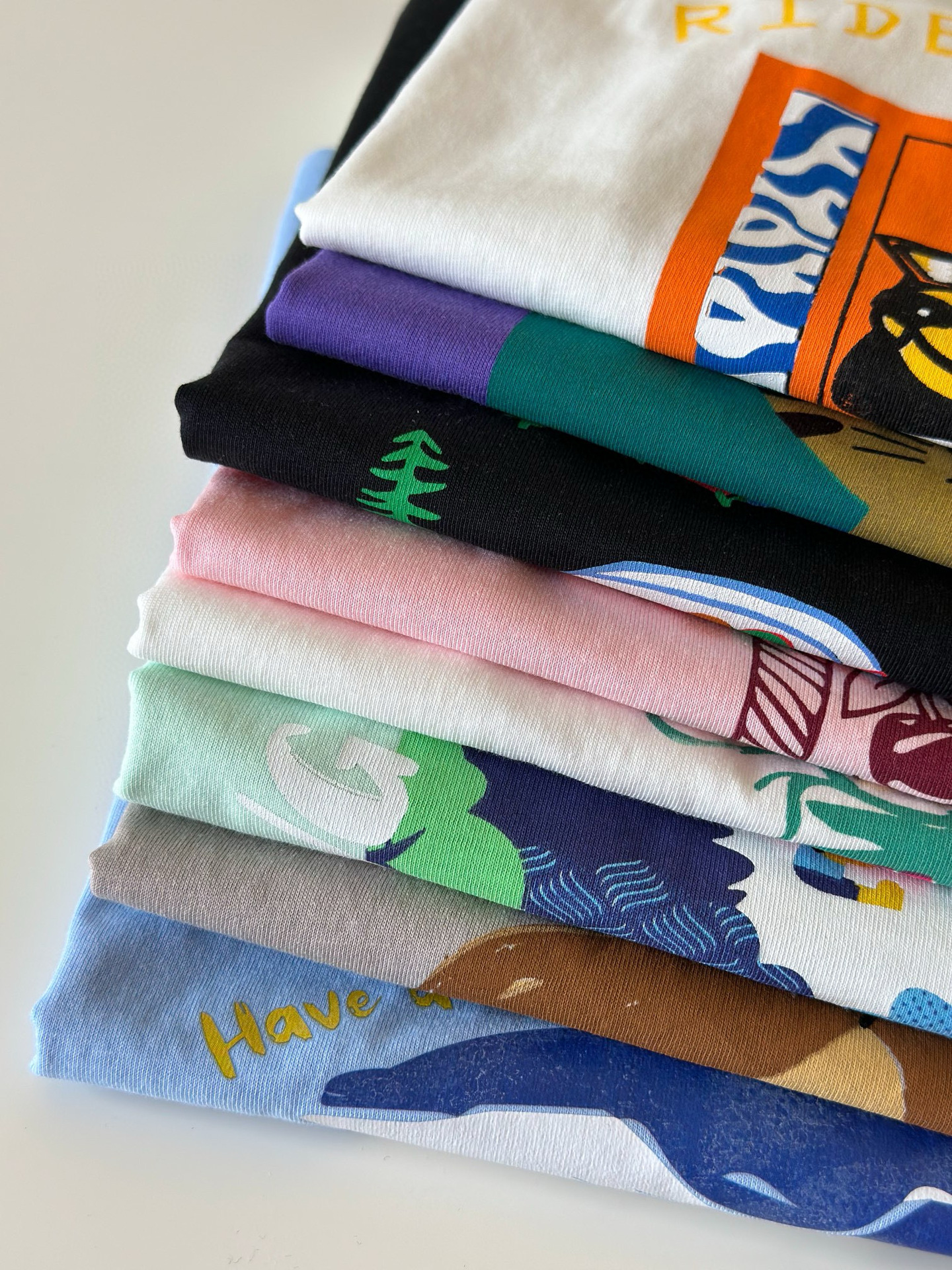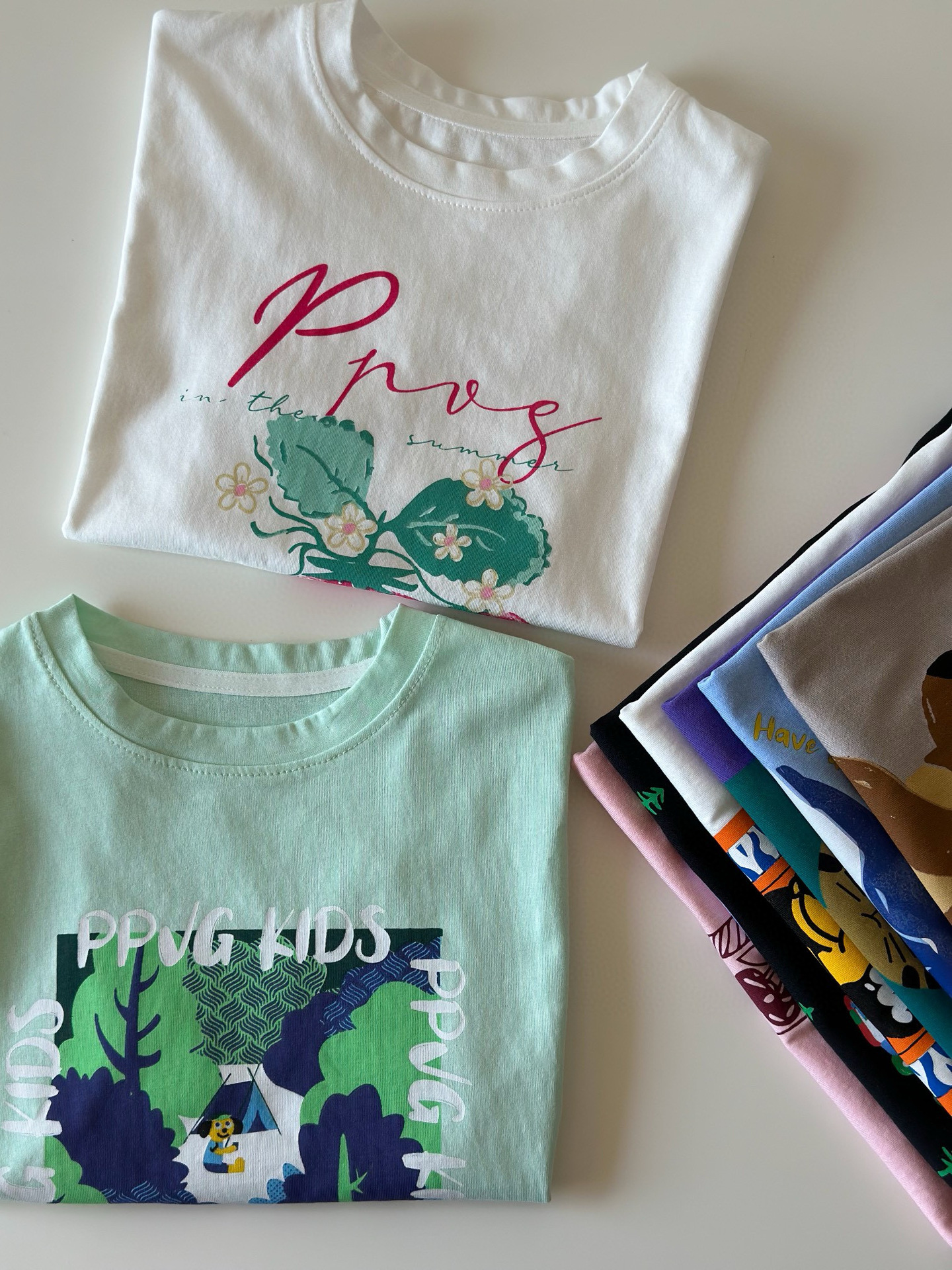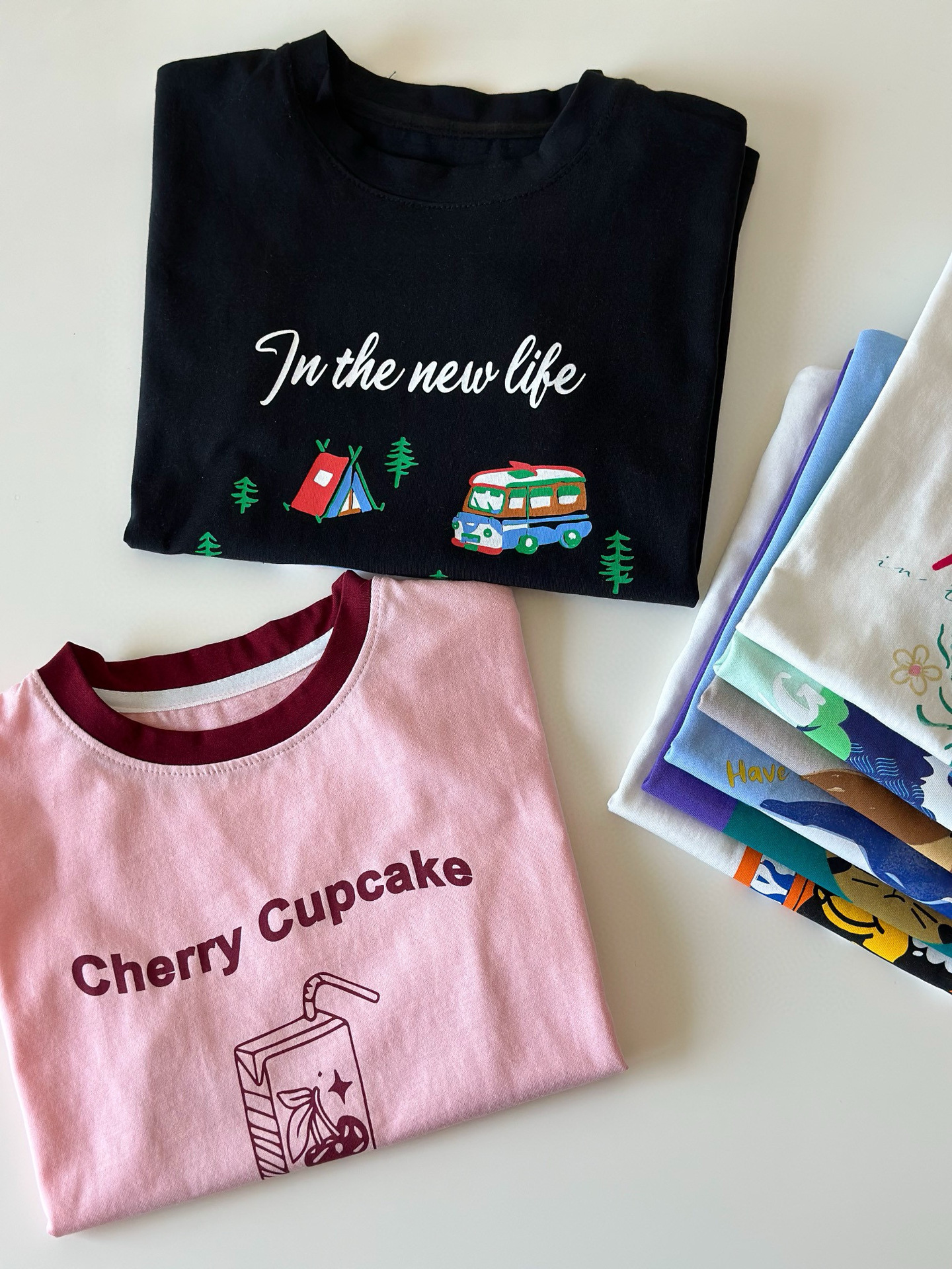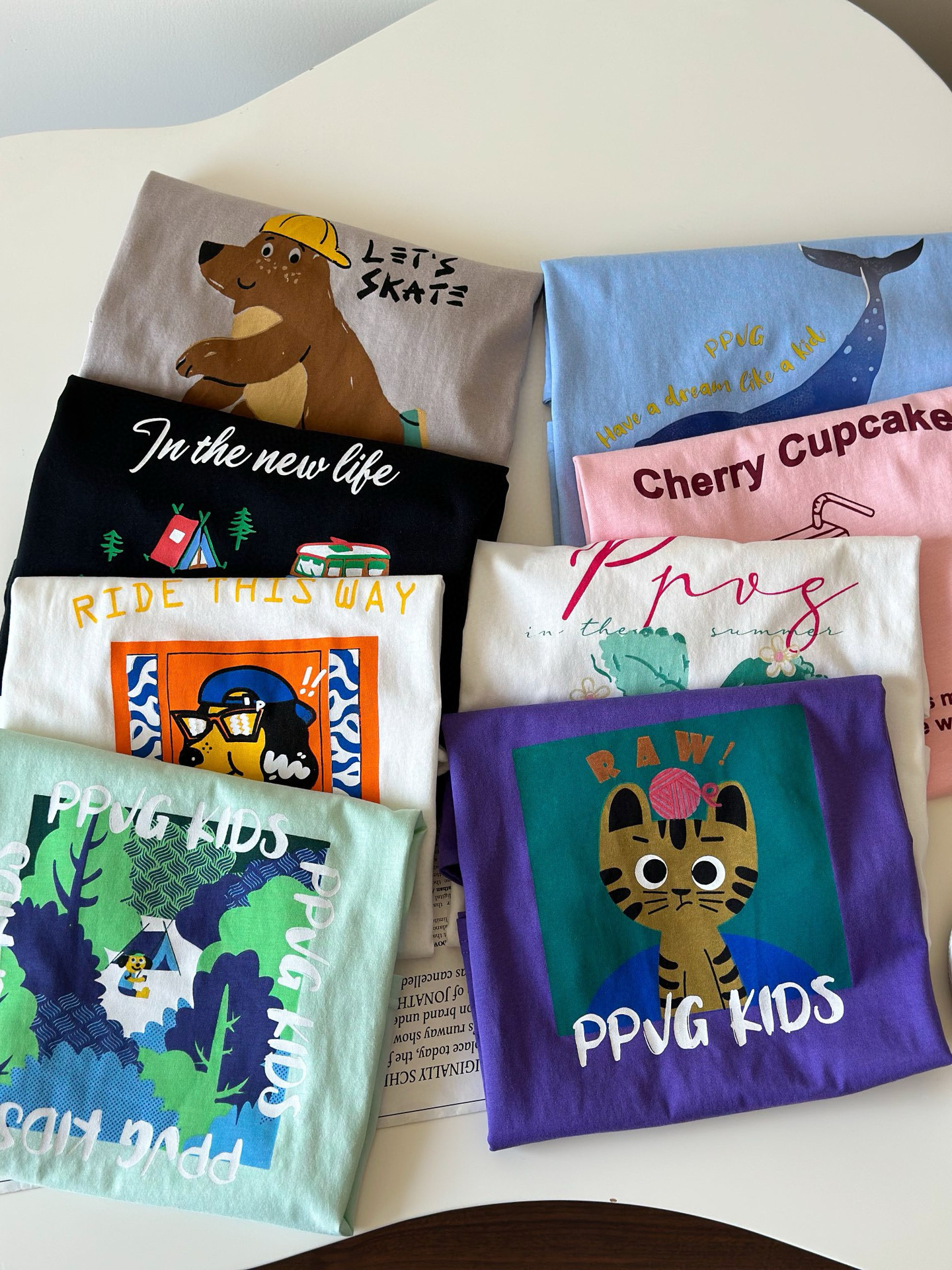 디자이너 손으로 그린 어린이 여름면 티셔츠 둥근 목 인쇄 만화 한국 짧은 소매 재킷 [2 개스토어 가기