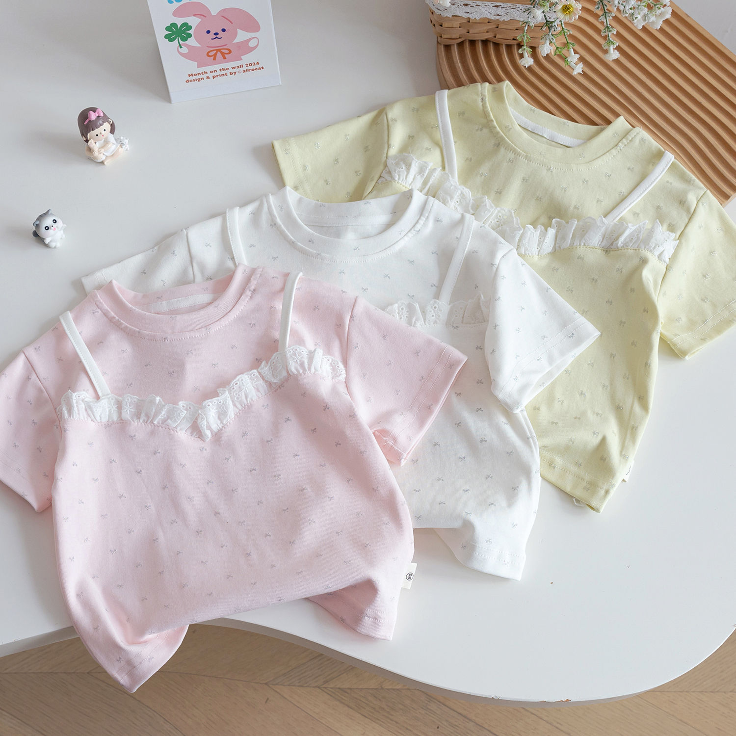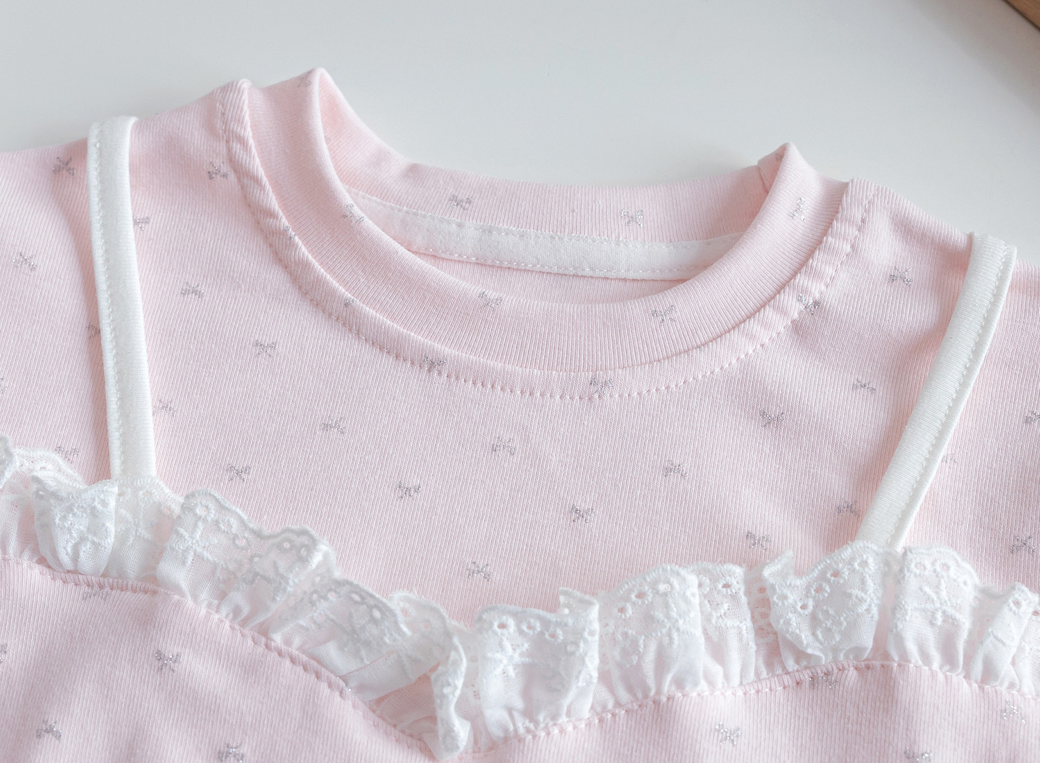 여자 여름 캐주얼 레이스 바느질 티셔츠 2025 새로운 올매치 꽃 귀여운 가짜 투피스 반팔베이스 셔츠스토어 가기