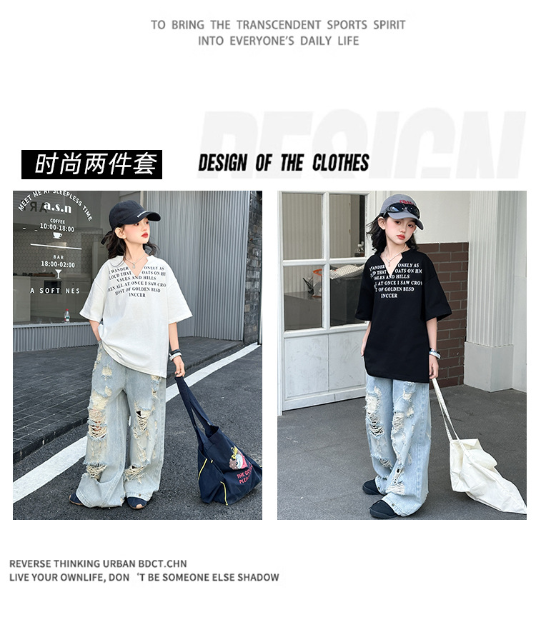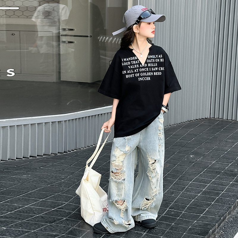소녀 아메리칸 스타일 V 넥 레터 프린트 반팔 티셔츠 2025 새로운 여름 미들 및 빅 키즈 루즈 청바지 투피스 세트스토어 가기