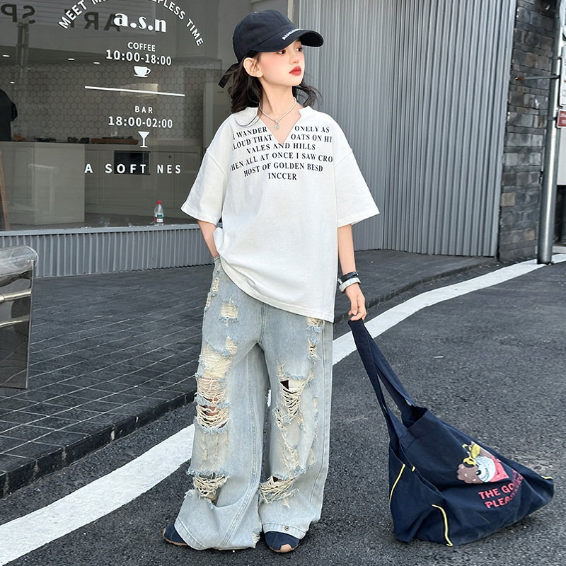 소녀 아메리칸 스타일 V 넥 레터 프린트 반팔 티셔츠 2025 새로운 여름 미들 및 빅 키즈 루즈 청바지 투피스 세트