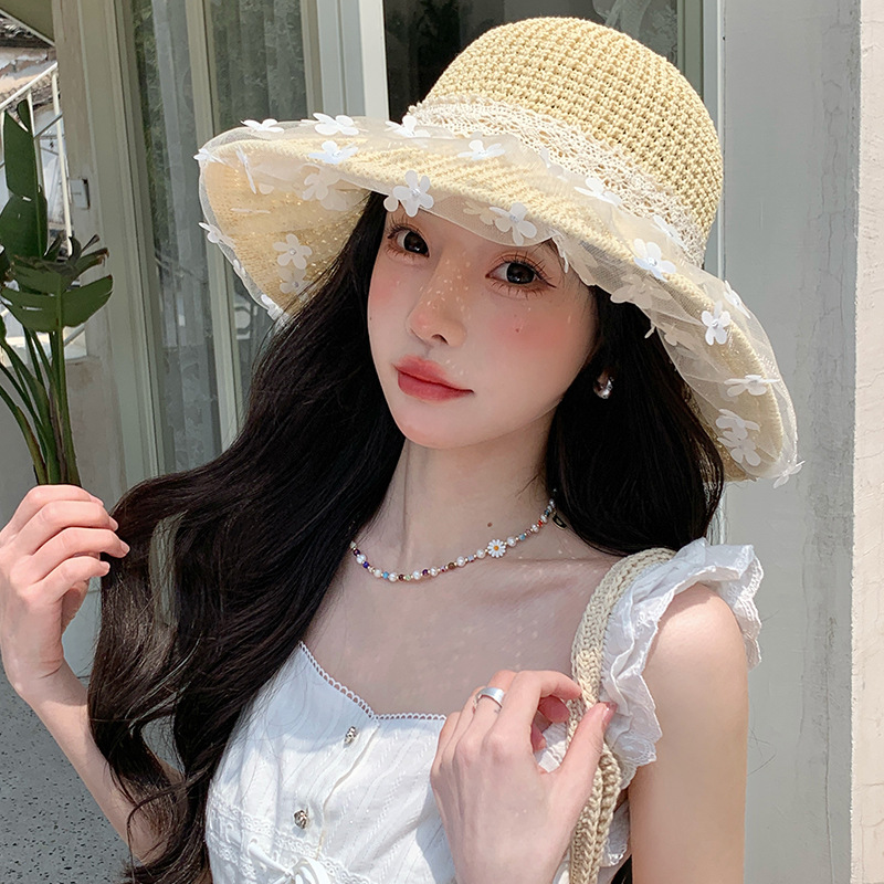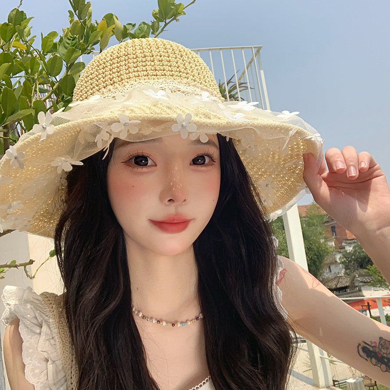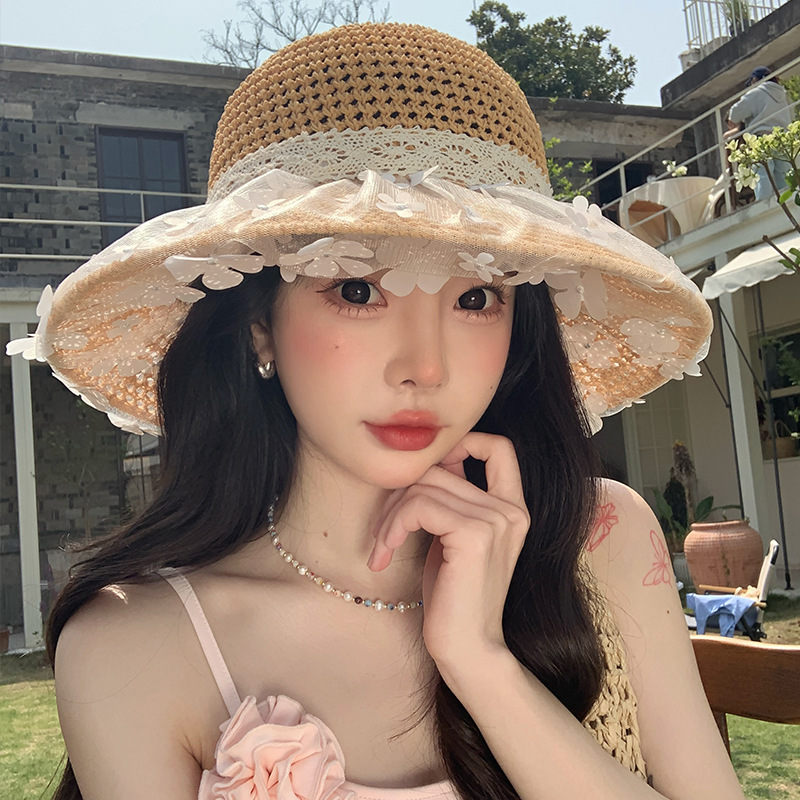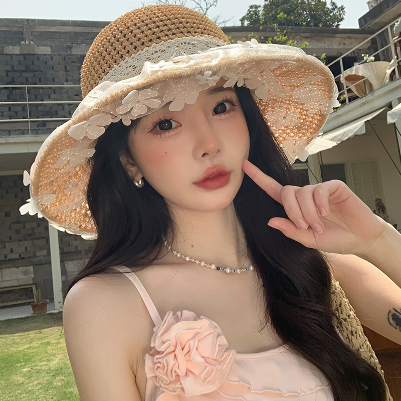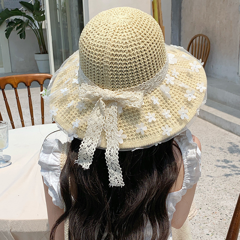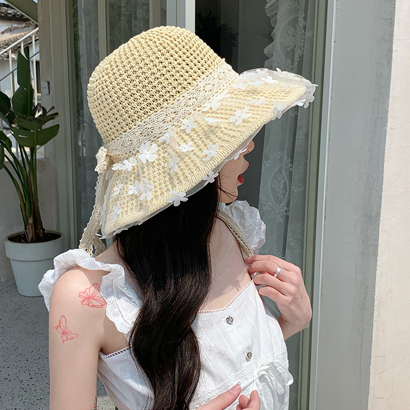 여름 해변 레이스 꽃 나비 매듭 중공 태양 모자 여성 휴가 해변 사진 하이 엔드 태양 모자