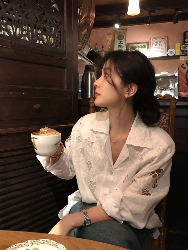 Siyuan niche design heavy industry 중공 장미 자수 모시 셔츠 여성 긴팔 루즈 아우터 탑 7763스토어 가기