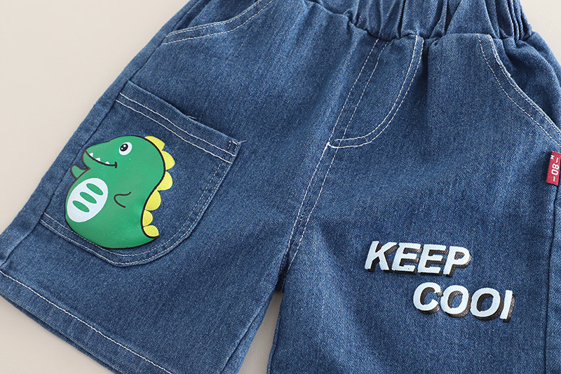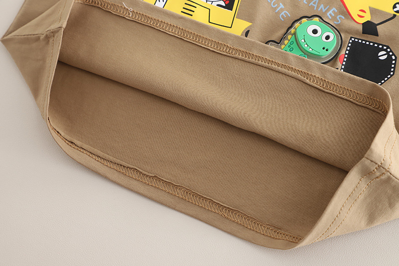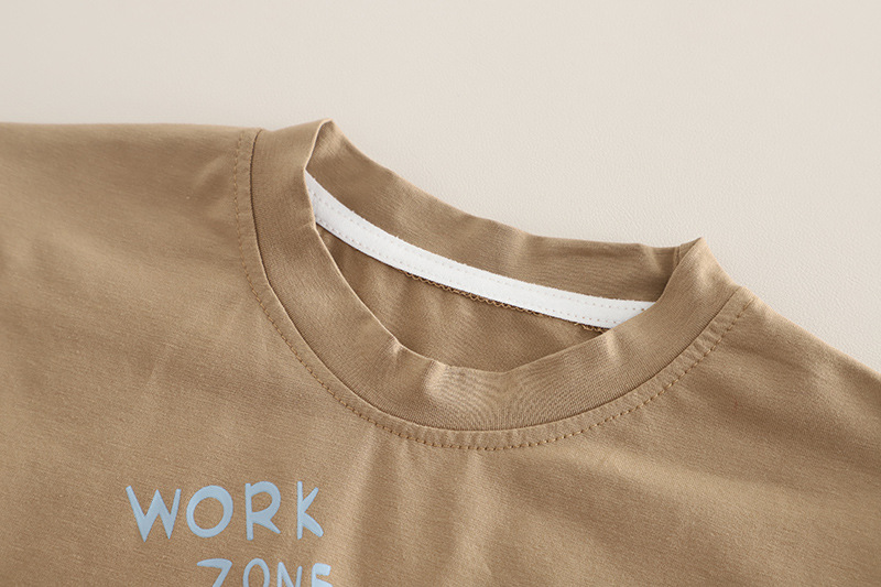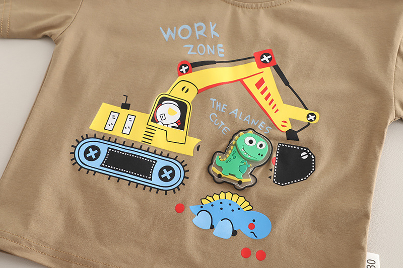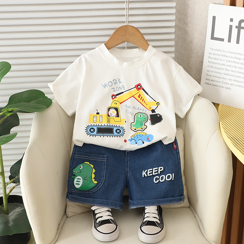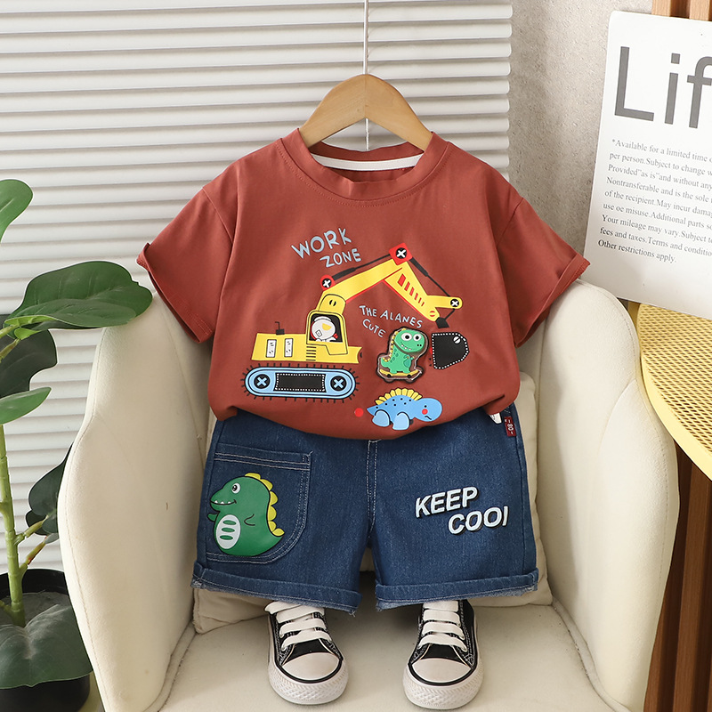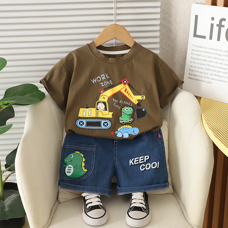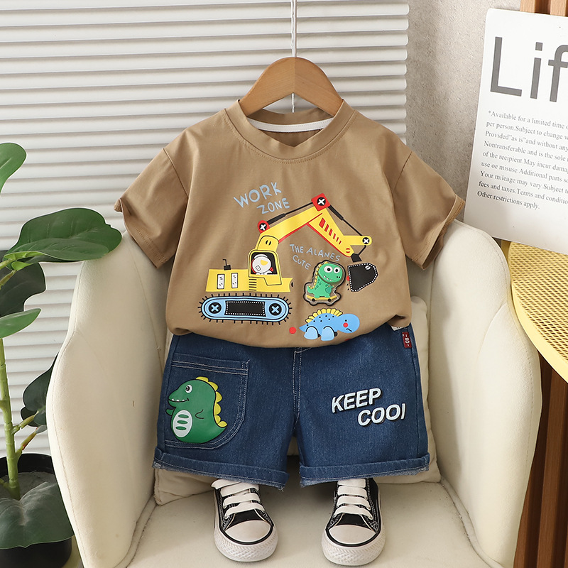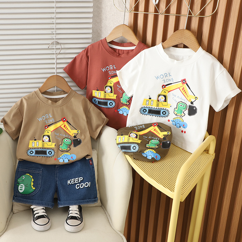 어린이 여름 2025 새로운 정장 아기 소년 만화 트랙터 라운드 넥 반팔 어린이 스타일 투피스 세트