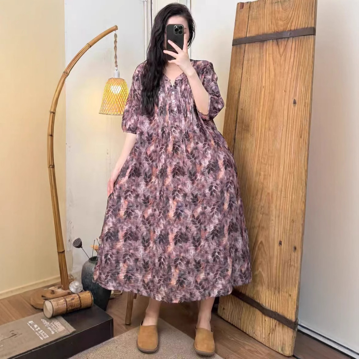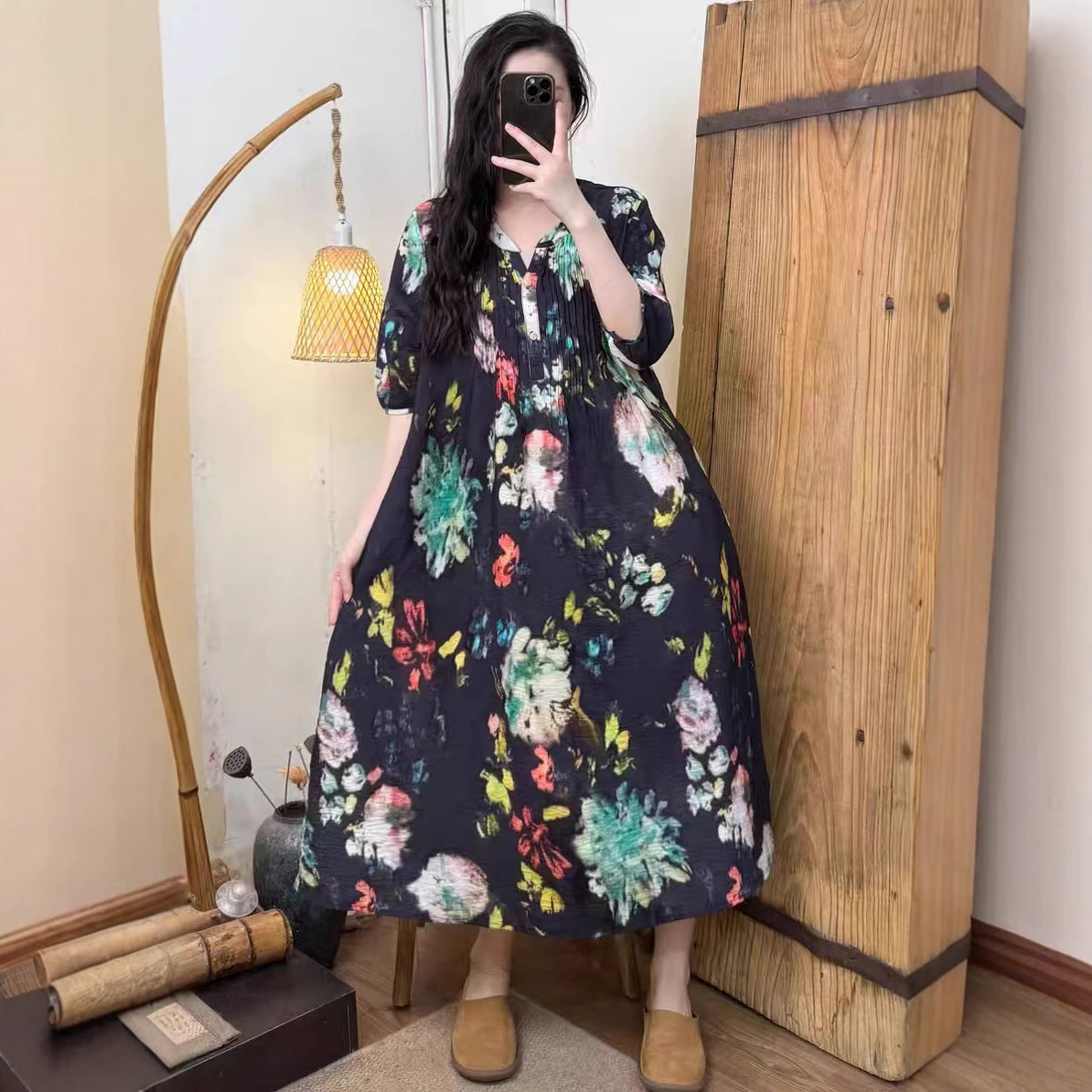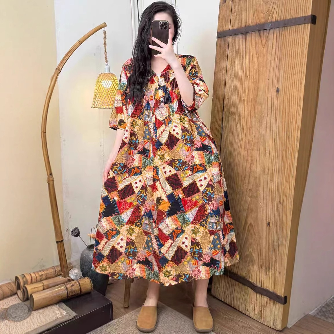 2025 여름 새로운 스타일 레트로 올 매치 디지털 인쇄 핀치 풀 오버 데프 싱글 레이어 원피스 탑스토어 가기
