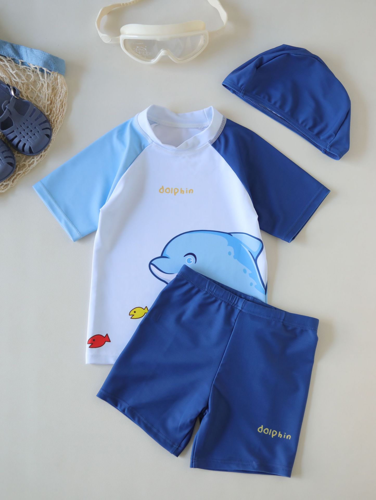 • 남아 수영복 세트 점핑돌고래 [동색 수영모 증정]