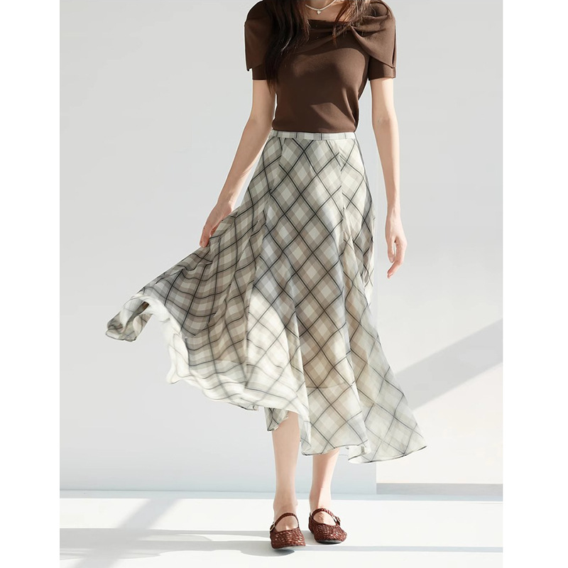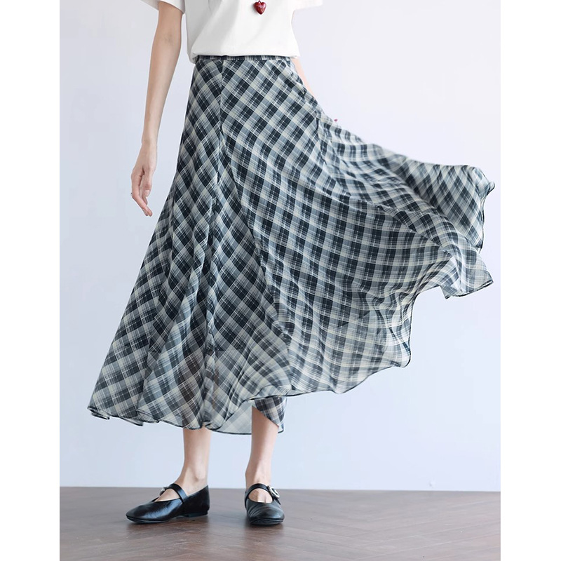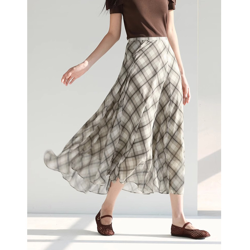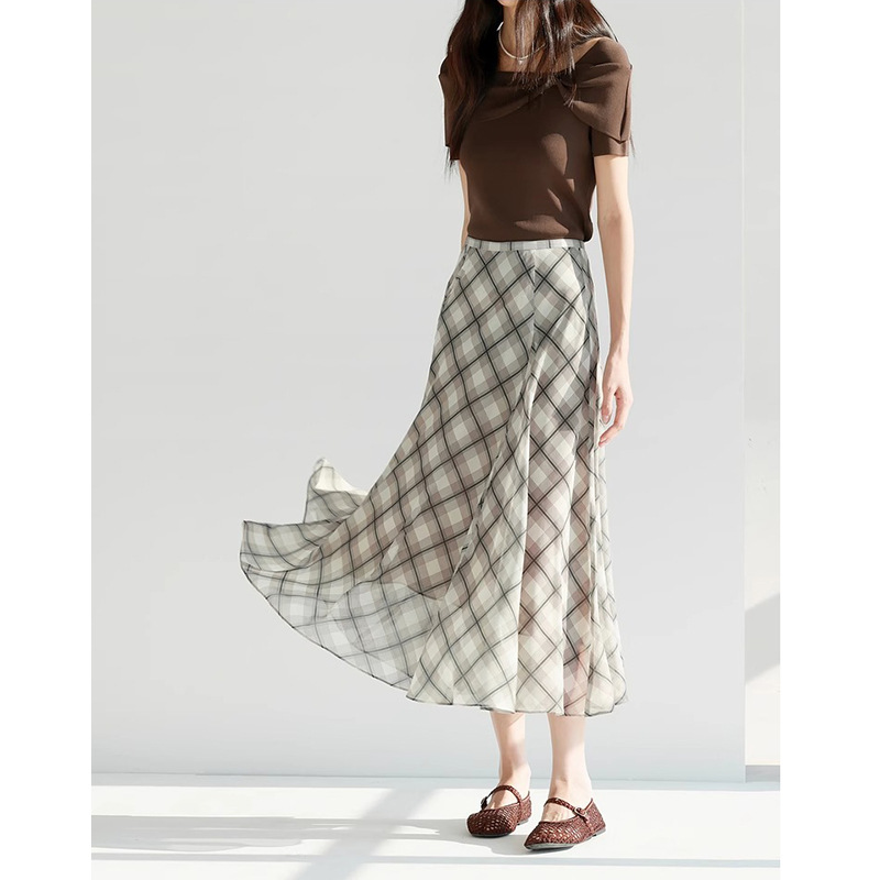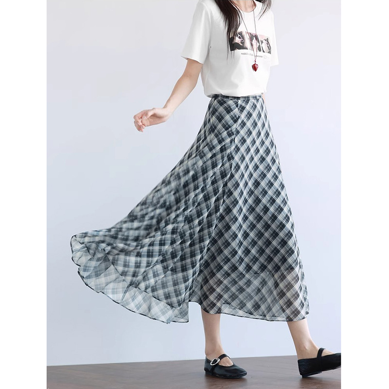유행 우아한 긴 슬리밍 큰 치마 단어 흑백 격자 무늬 하프 스커트 여성의 2025 년 여름 새로운 1G4940971
