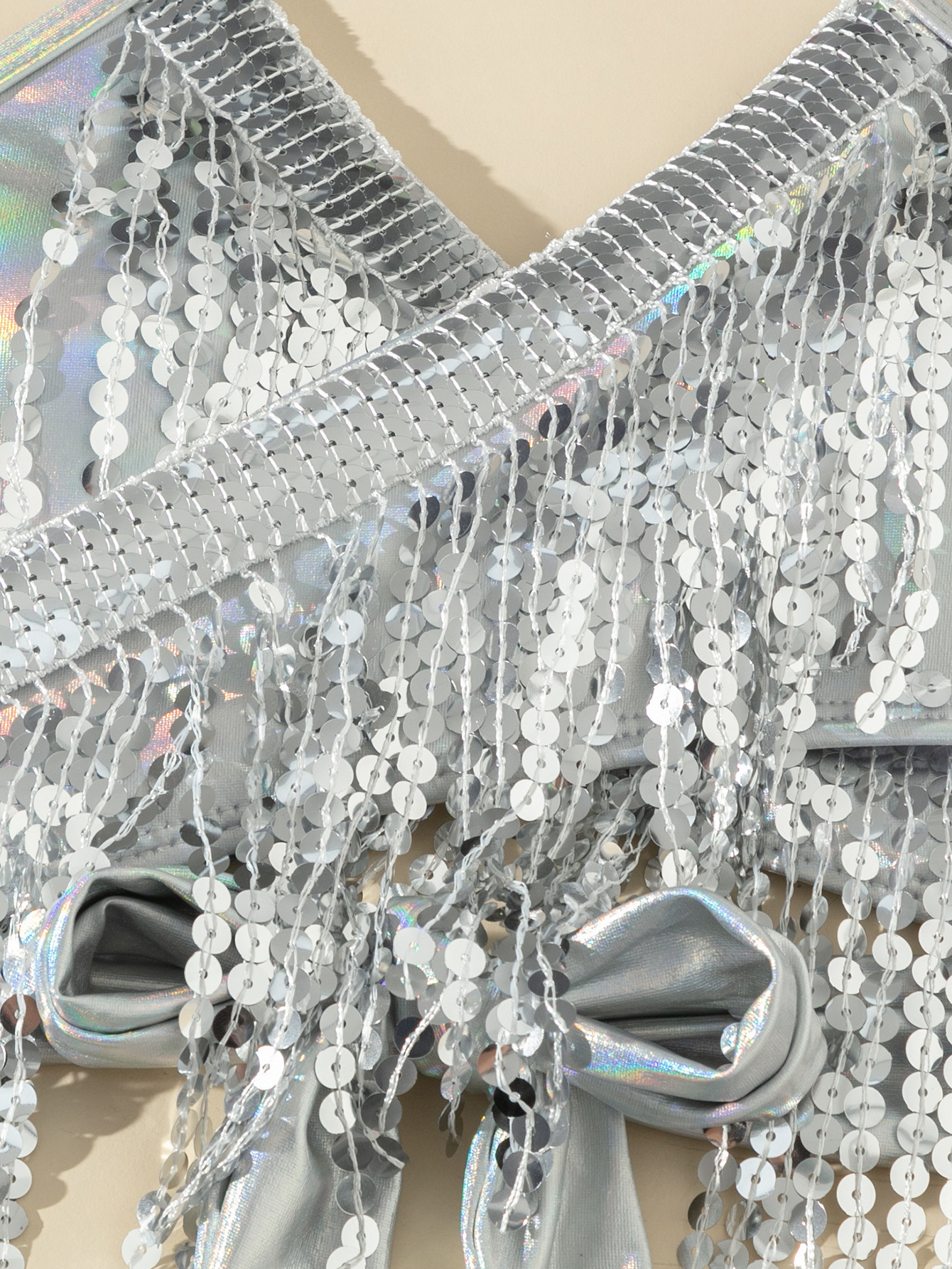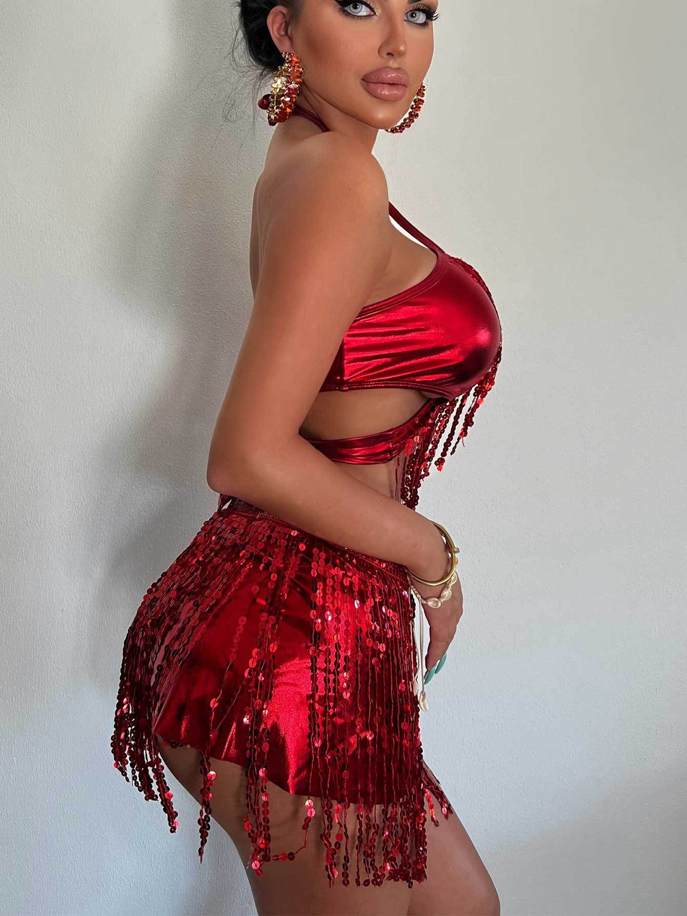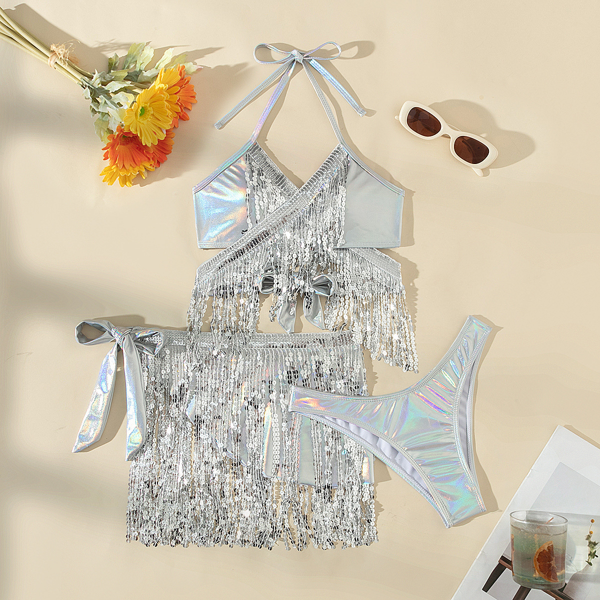 유럽과 미국의 수영복 여성 크로스보더 솔리드 컬러 스팽글 태슬 비키니 스플릿 수영복 3피스 세트 아마존 대외 무역 수영복