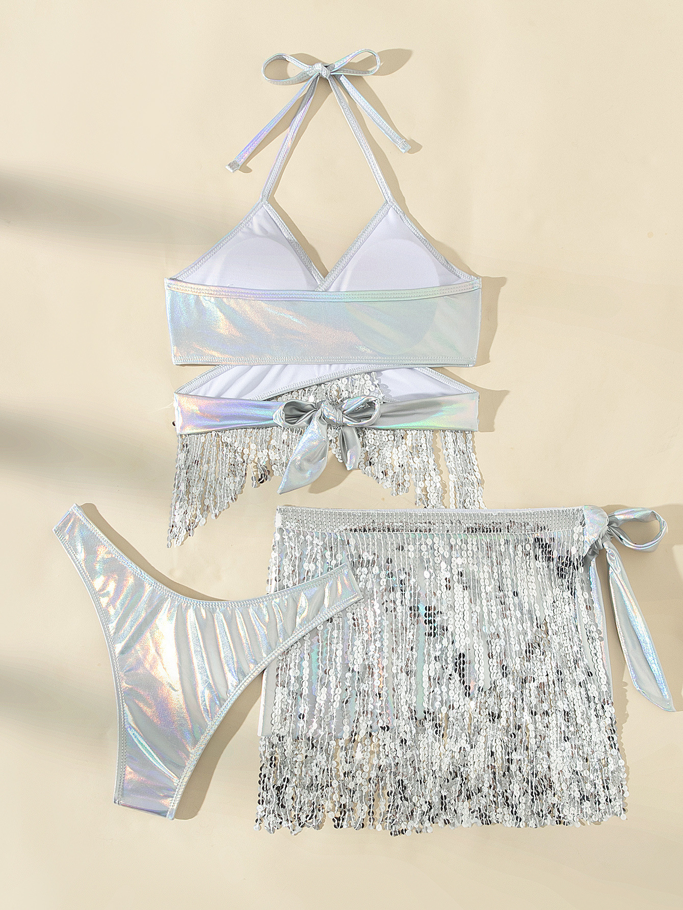 유럽과 미국의 수영복 여성 크로스보더 솔리드 컬러 스팽글 태슬 비키니 스플릿 수영복 3피스 세트 아마존 대외 무역 수영복스토어 가기