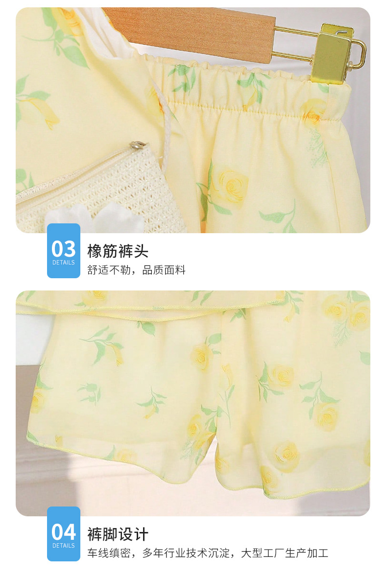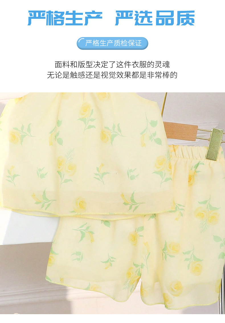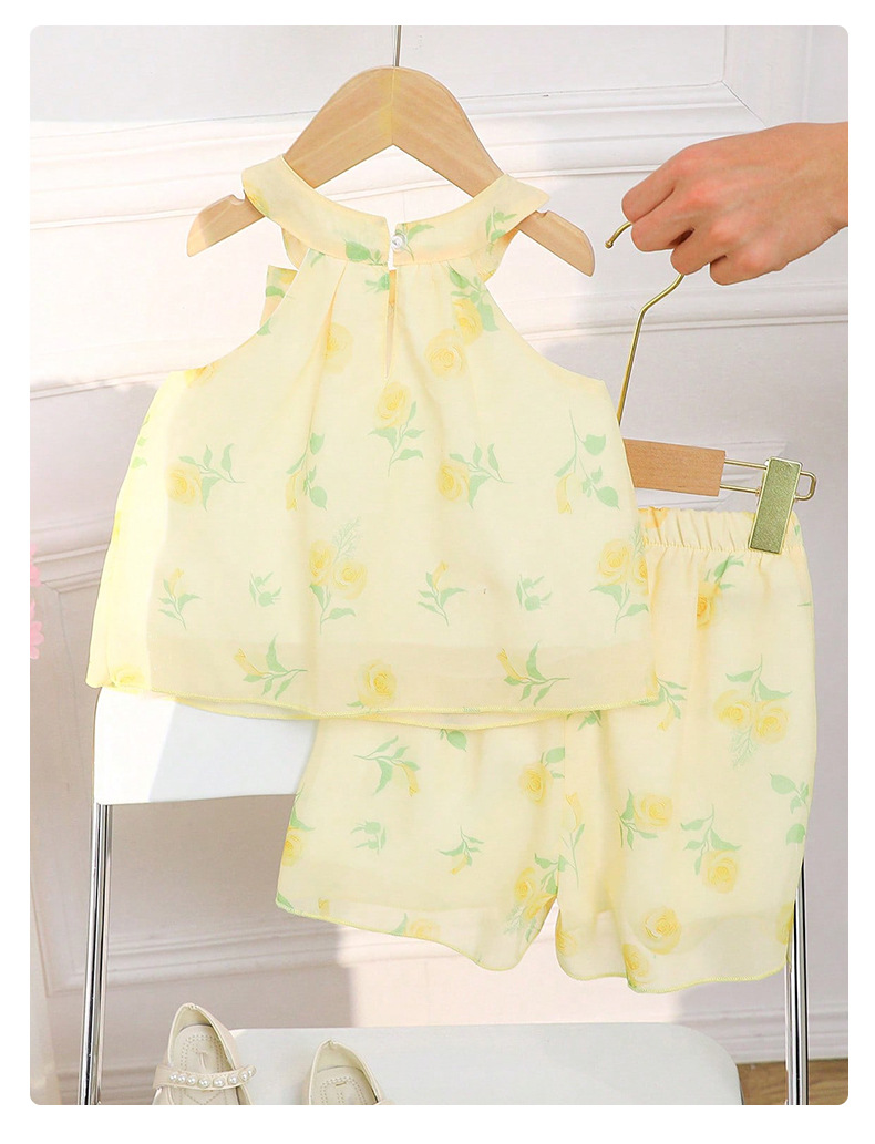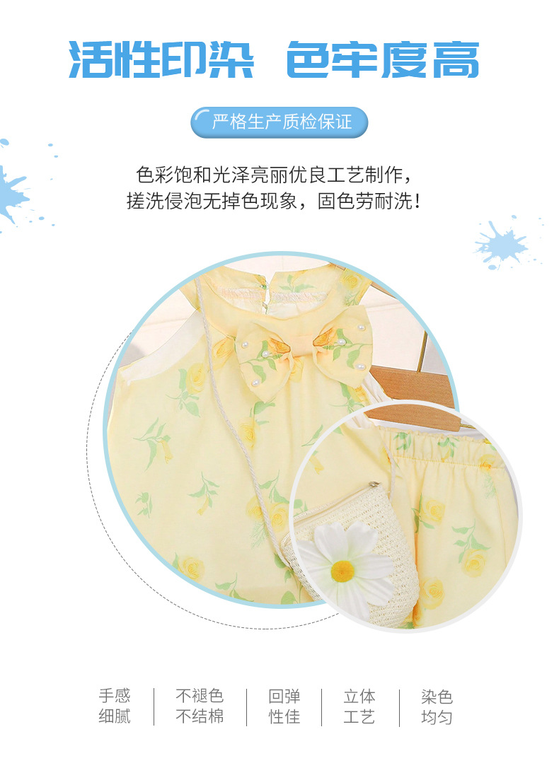 여자 쉬폰 인쇄 꽃 Bowknot 진주 조끼 세트 라운드 넥 민소매 반바지 여름 투피스 세트 도매