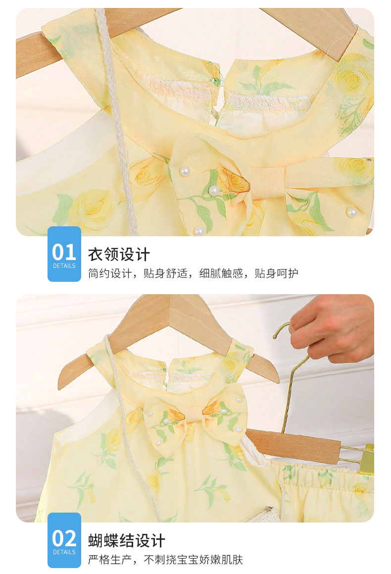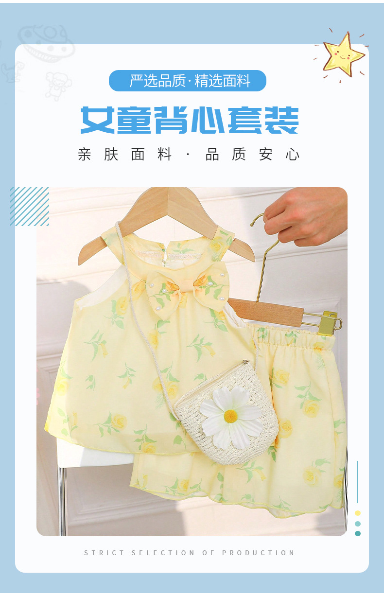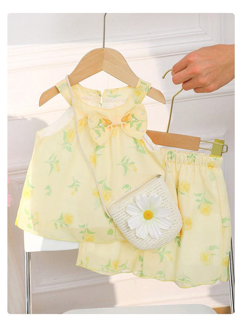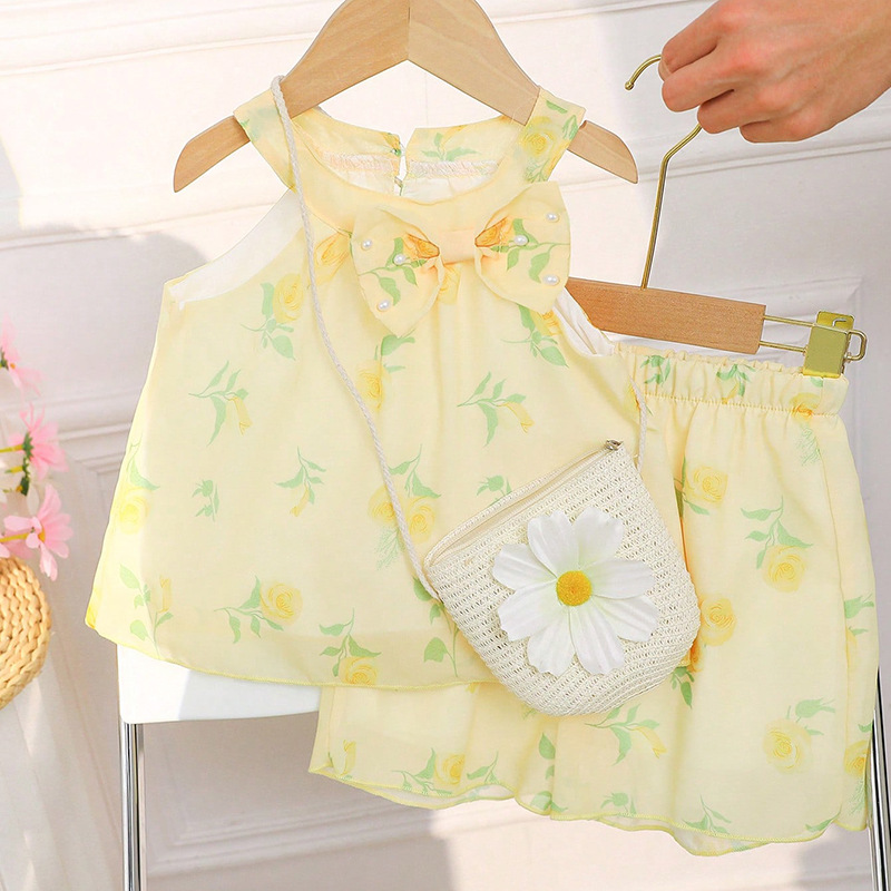 여자 쉬폰 인쇄 꽃 Bowknot 진주 조끼 세트 라운드 넥 민소매 반바지 여름 투피스 세트 도매스토어 가기