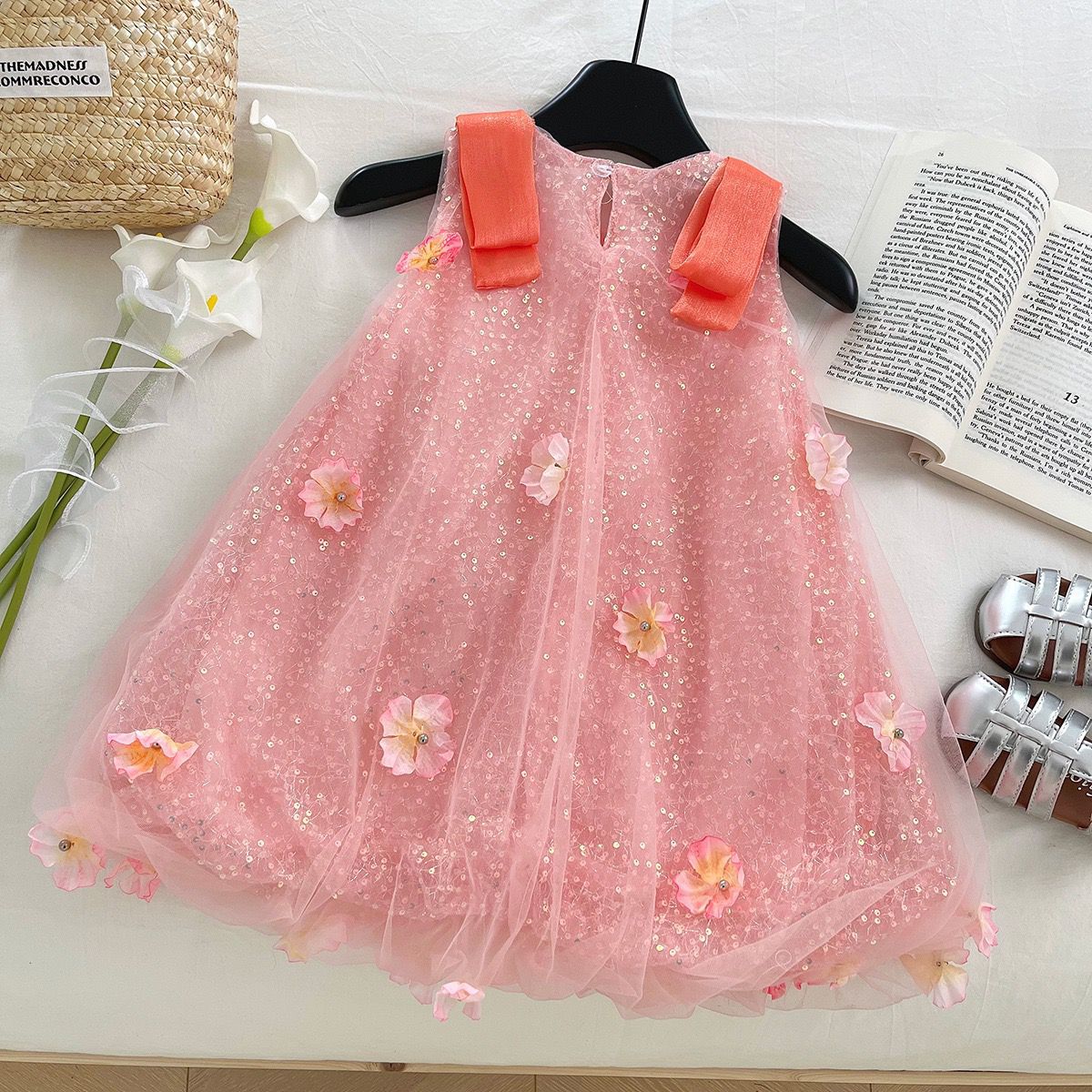 2025 년 여름 소녀의 원피스 입체 꽃 조각 메시 빅 원피스 어린 소녀의 공주 원피스 국경 머리