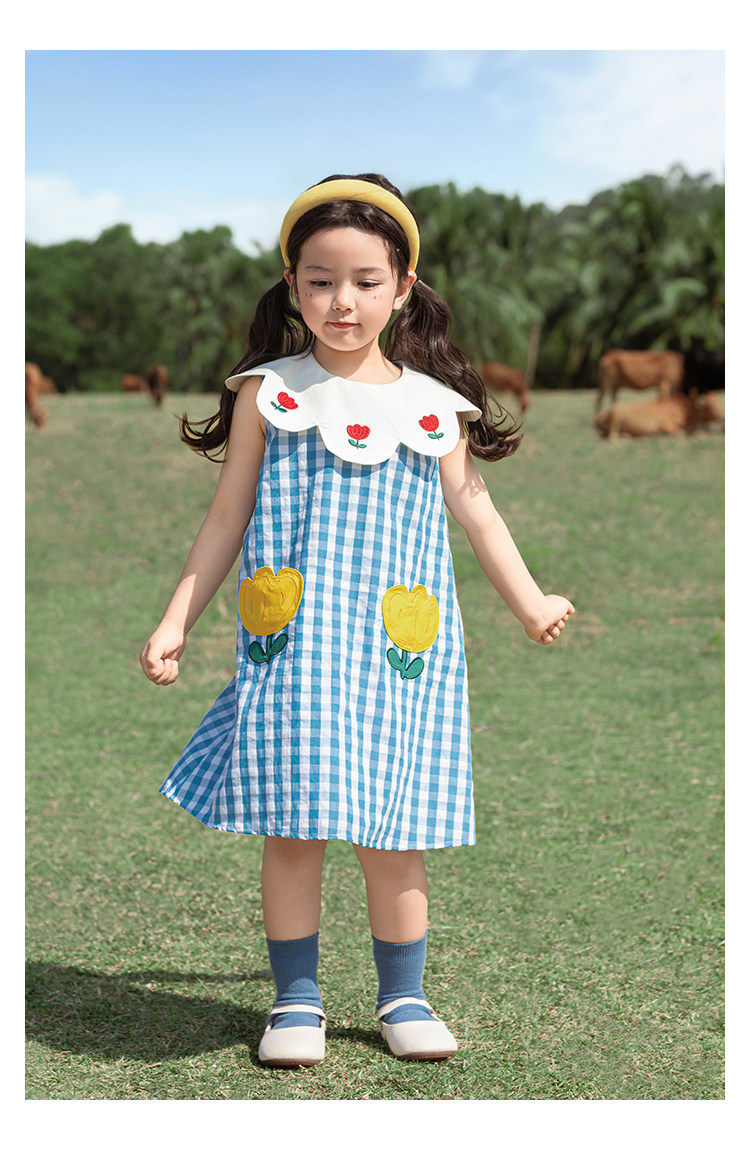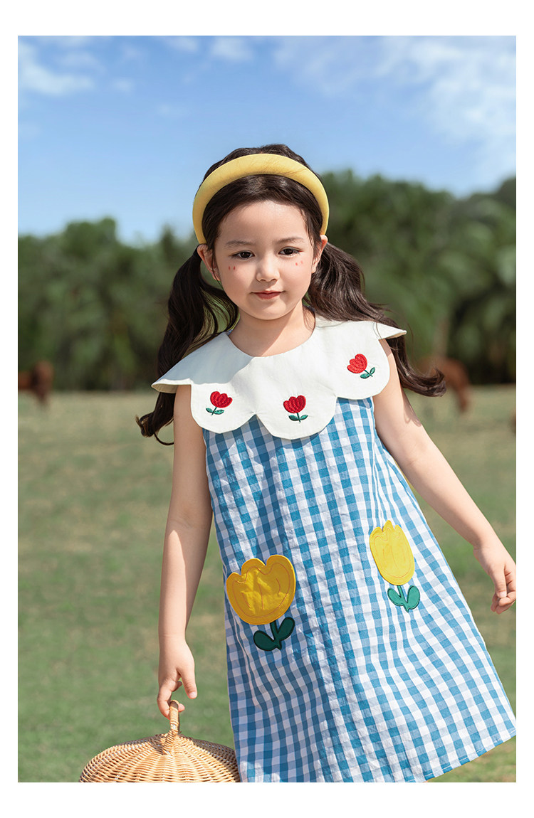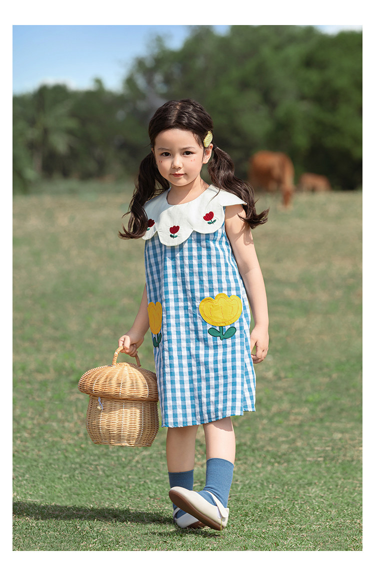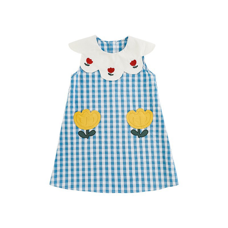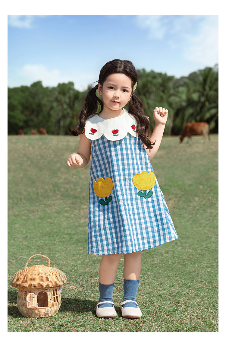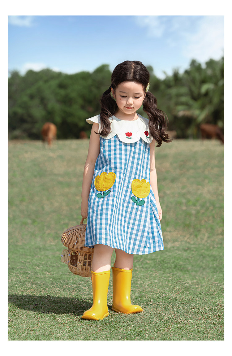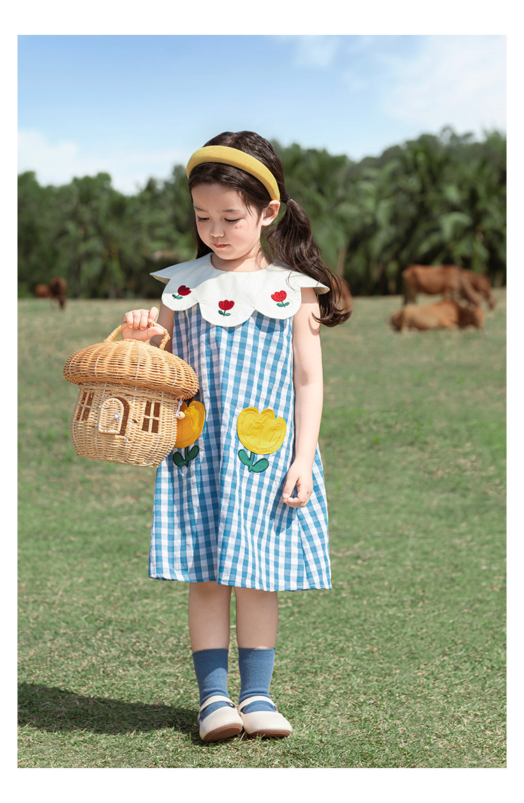 Wulibuyi 소녀의 대비 색상 레이스 인형 옷깃 드레스 여름 신선하고 아름다운 원사 염색 격자 무늬 스커트 유행스토어 가기