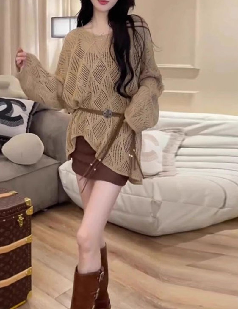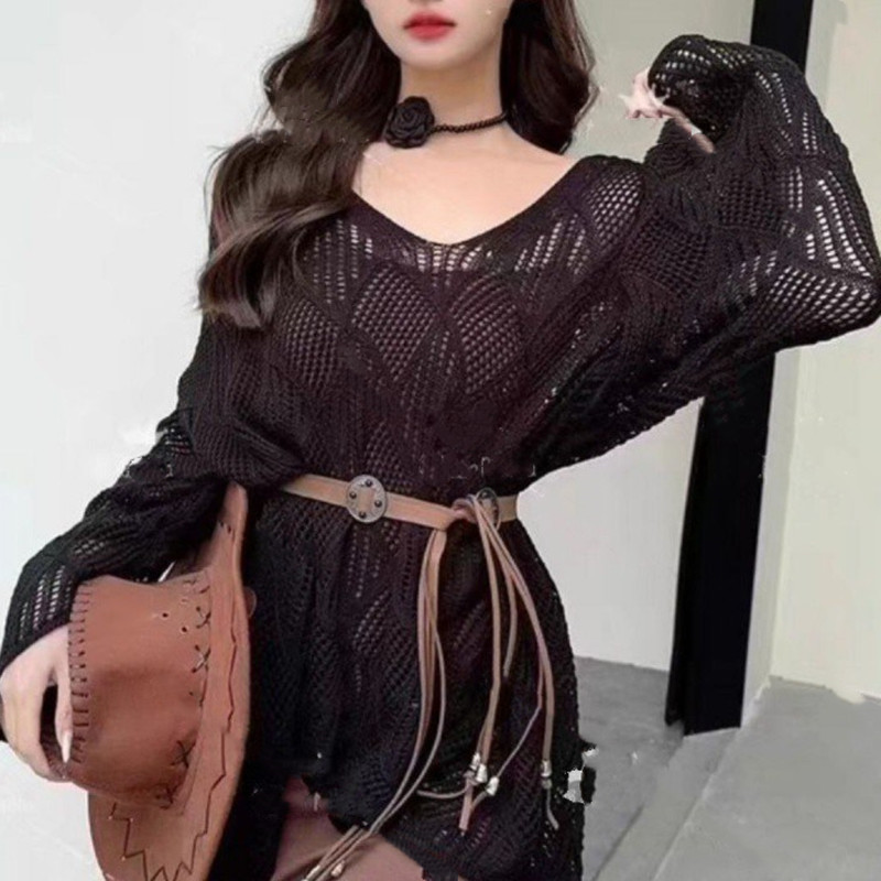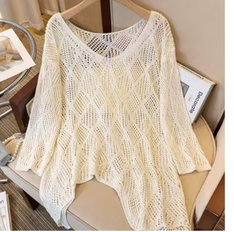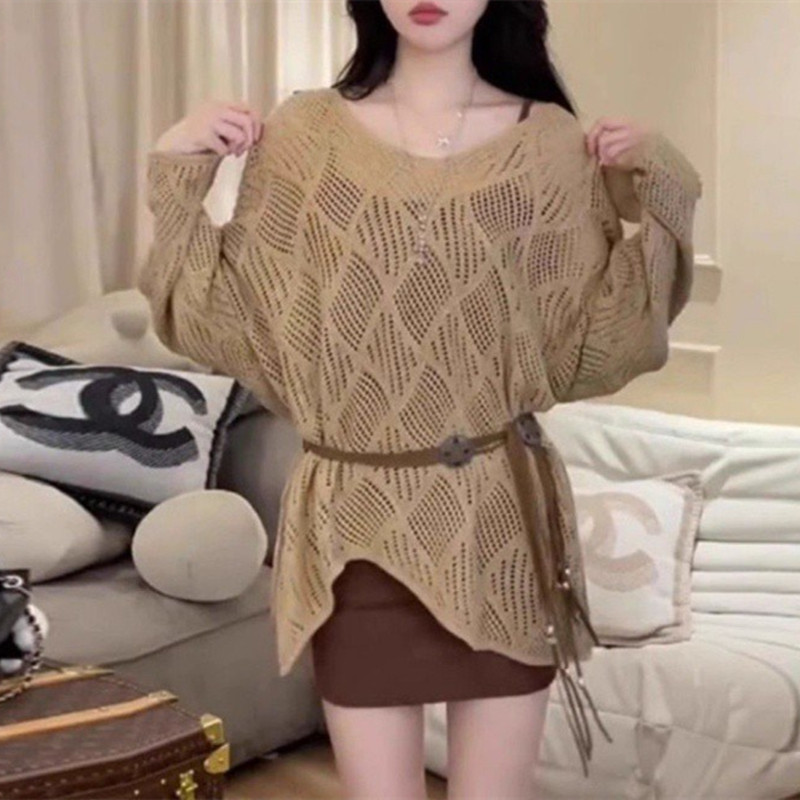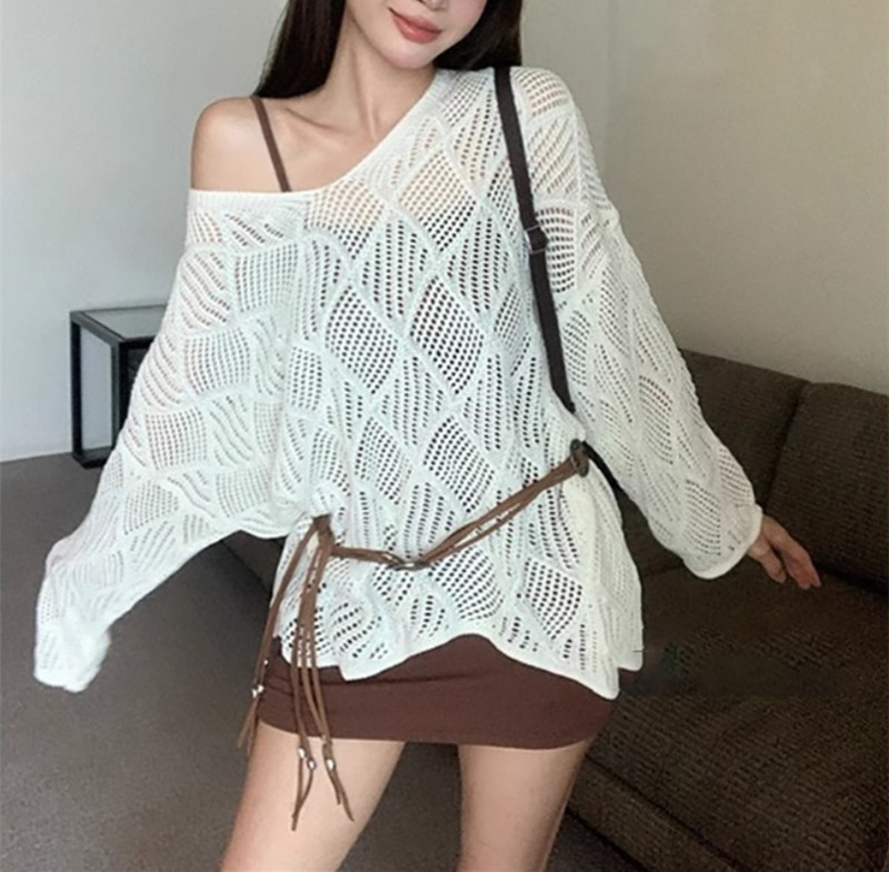 여성을위한 여름 새로운 뜨거운 여자 중공 니트 스웨터 게으른 스타일 디자인 오프 어깨 탑 느슨한 태양 보호 니트 여성 의류스토어 가기