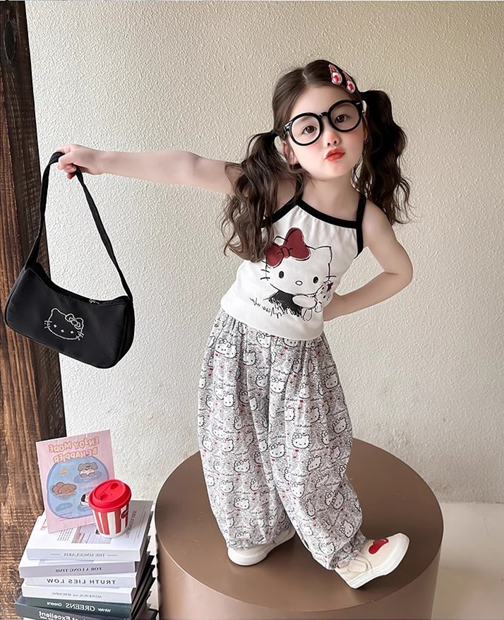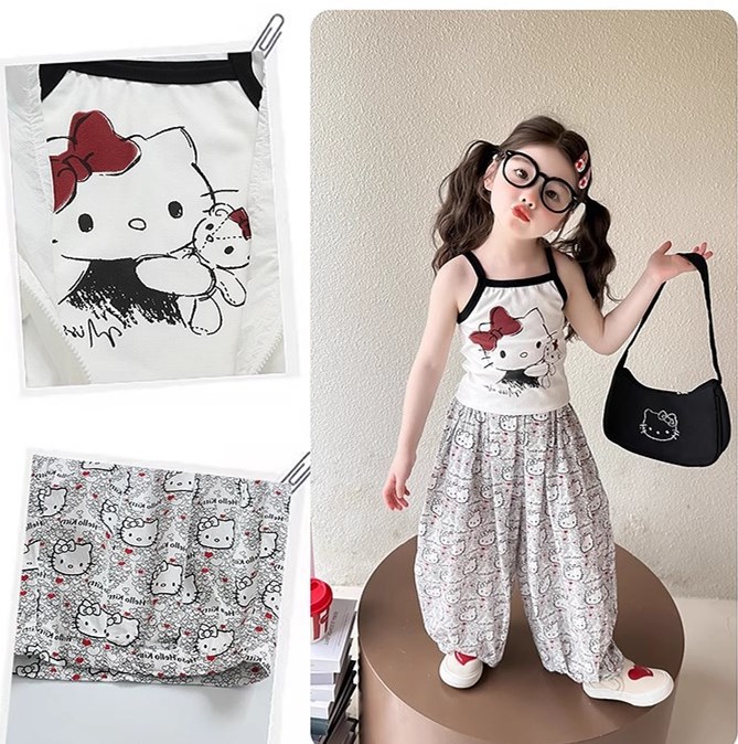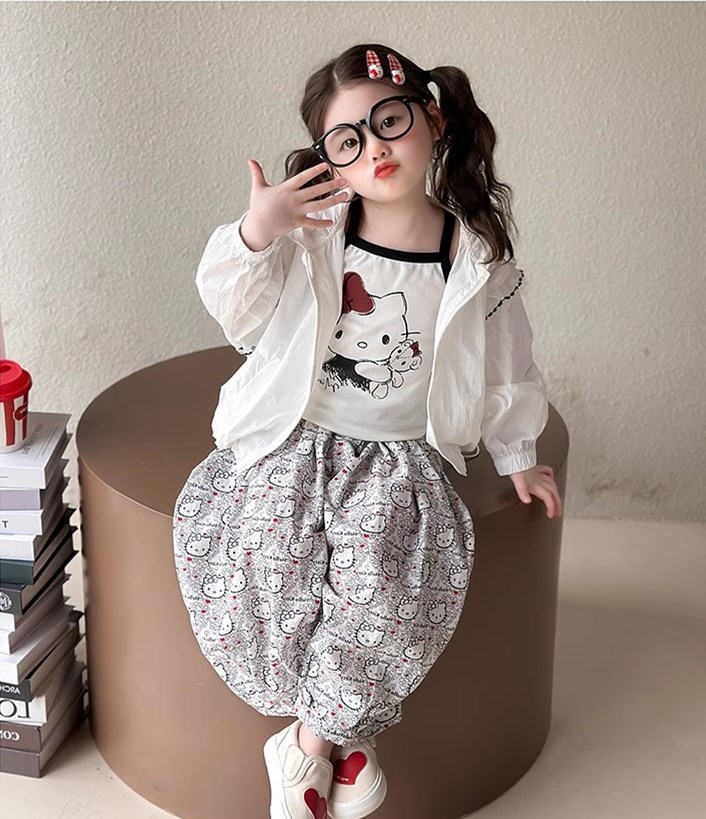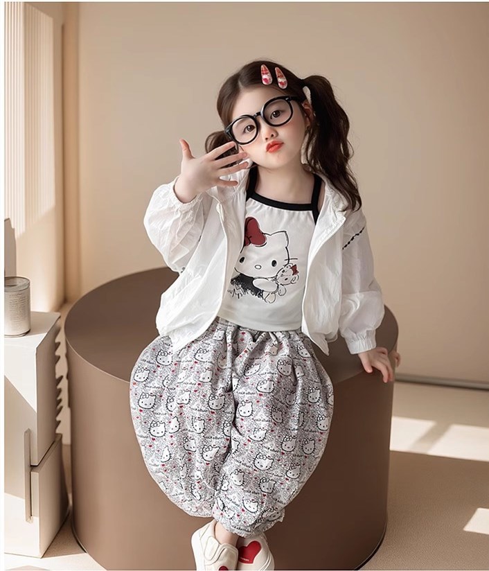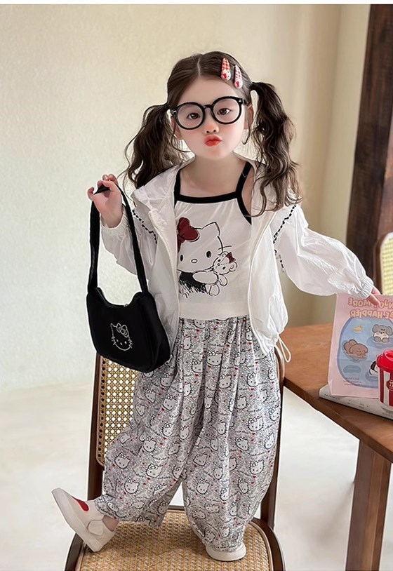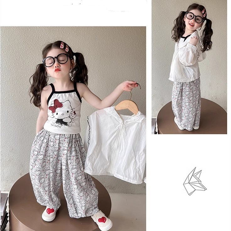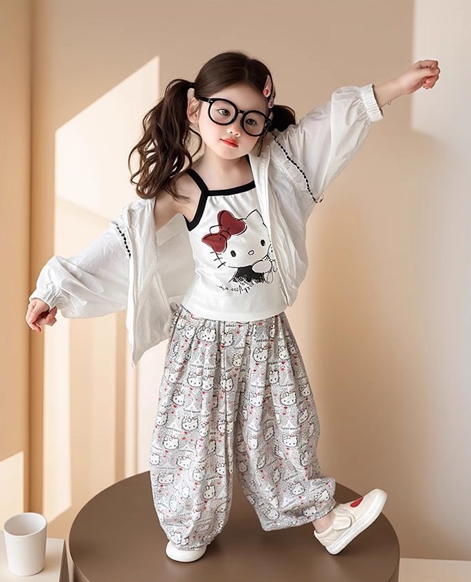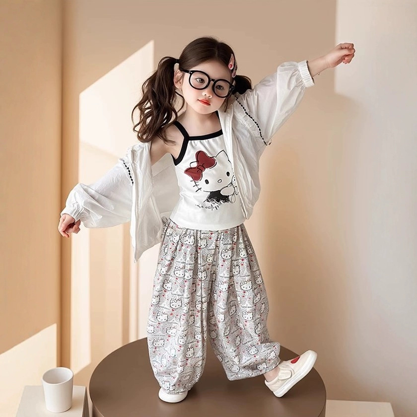 어린 소녀 2025 여름 새로운 만화 내부 선 스크린 안티 모기 바지 3 조각 흰색 통기성 아이스 실크 세트스토어 가기