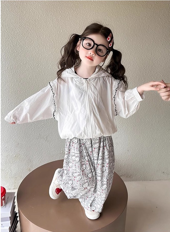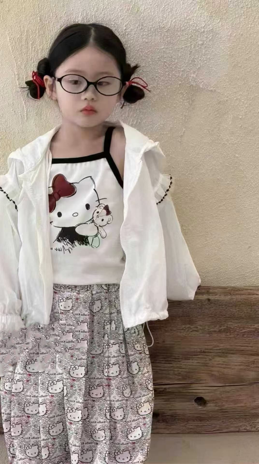 어린 소녀 2025 여름 새로운 만화 내부 선 스크린 안티 모기 바지 3 조각 흰색 통기성 아이스 실크 세트