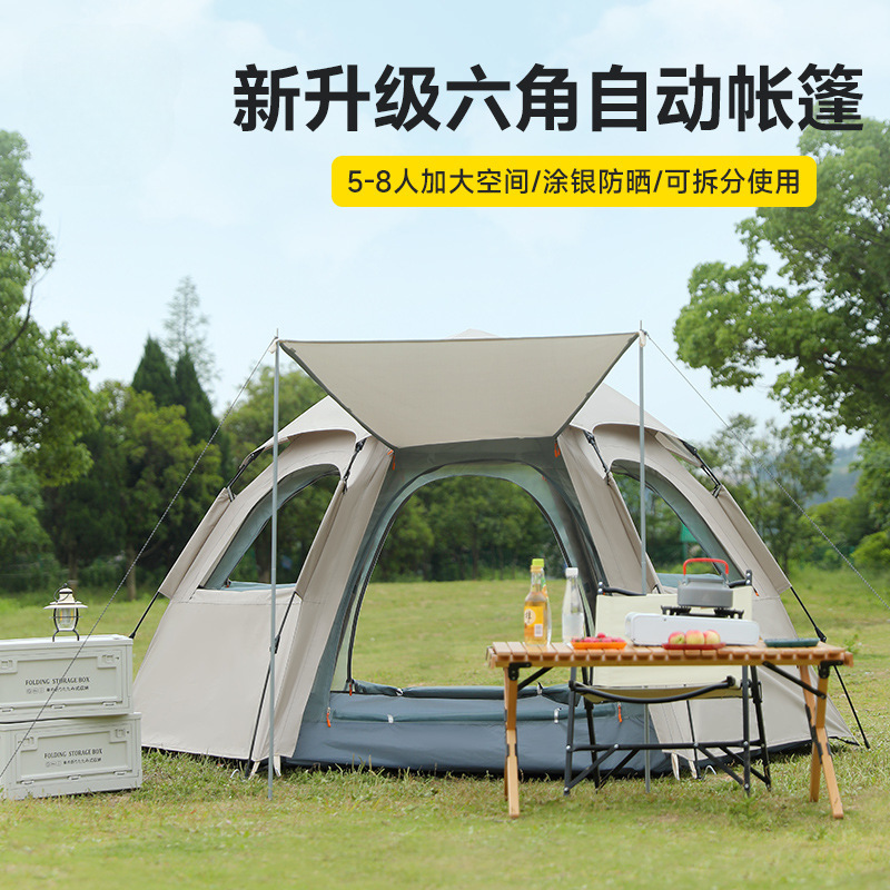 야외 육각형 빠른 개방형 완전 자동 텐트 휴대용 두꺼운 더블 레이어 옥스포드 천 방수 및 자외선 차단 야외 캠핑 새로운 스타일스토어 가기