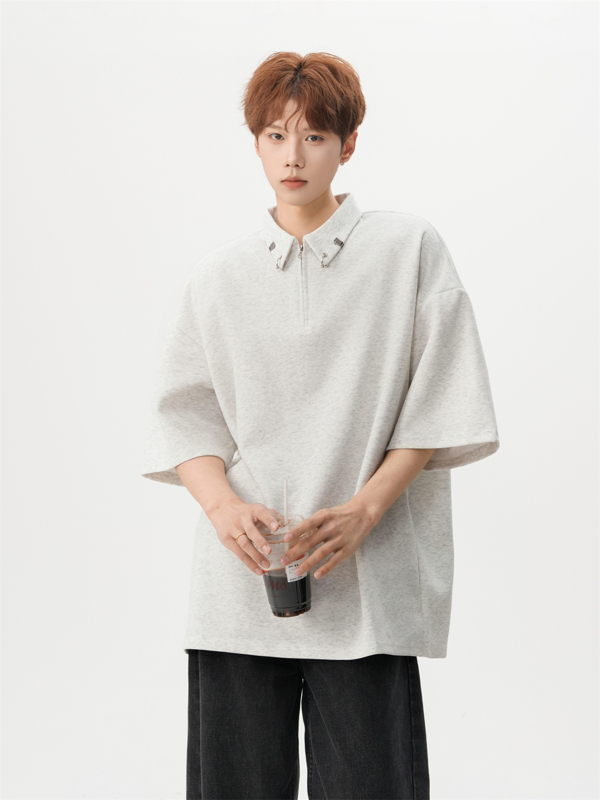 아메리칸 메탈 버클 하프 지퍼 반팔 남성 여름 트렌디 브랜드 헤비 클린핏 루즈 폴로 칼라 라펠 반소매