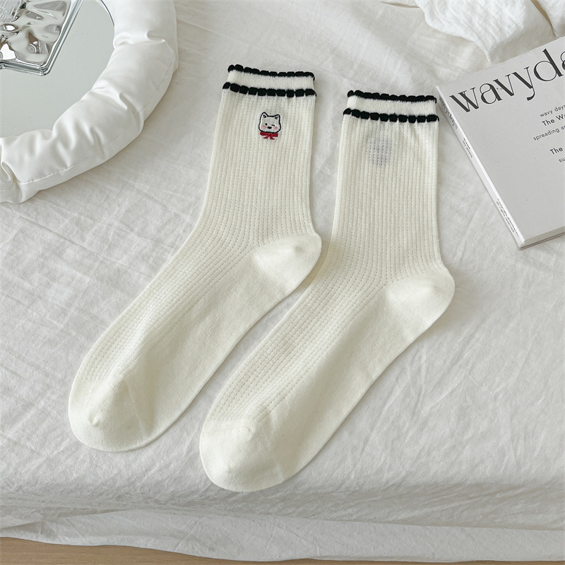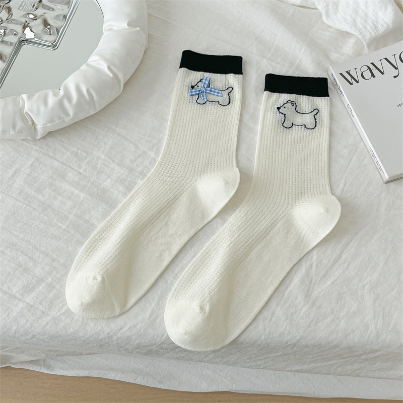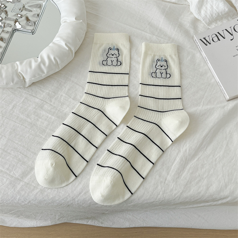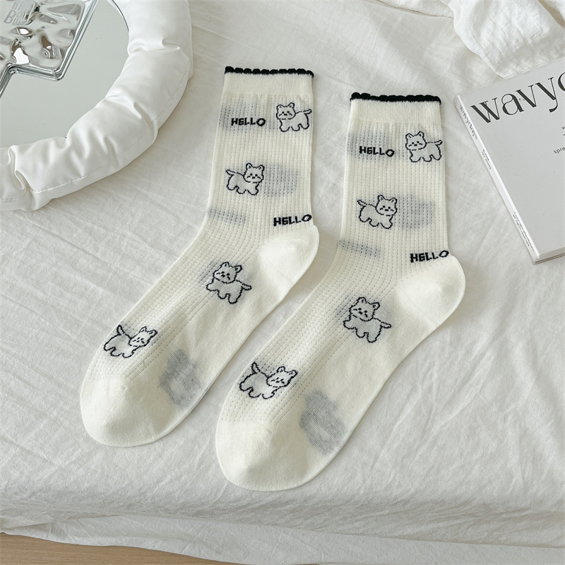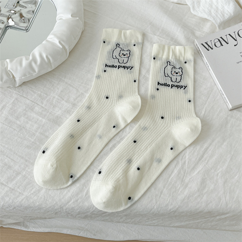 흰색 양말 여성용 종아리 중간 양말 봄, 가을 얇은 통기성 메쉬 귀여운 강아지 푹신한 긴 튜브 뼈없는 기능 트렌드스토어 가기