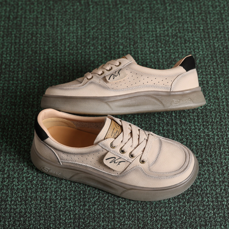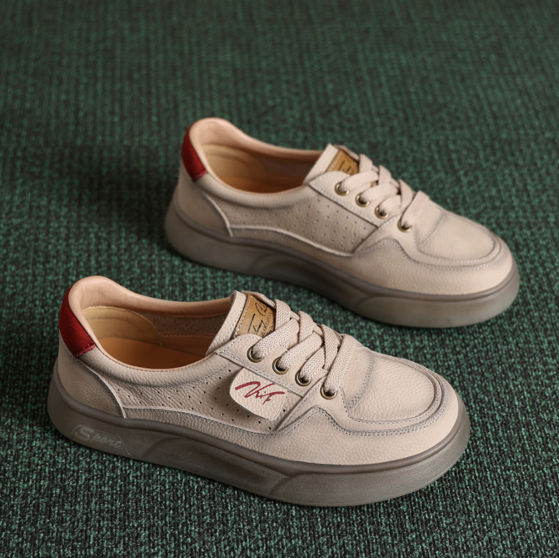 2025년 신상 봄 가을 천연 소가죽 얕은 굽 여성용 레트로 캐주얼 두꺼운 밑창 젤리 밑창 흰색 신발