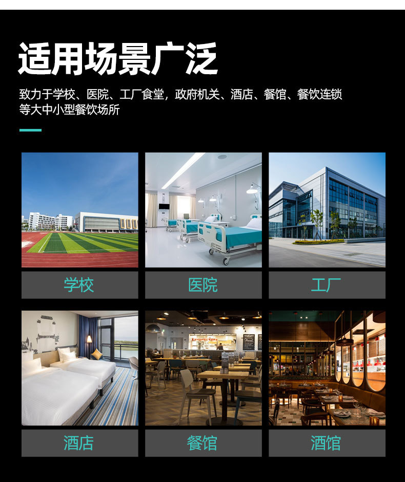 适用于:学校/医院/工厂食堂/政府机关/酒店/餐馆/餐饮连锁等中大型餐饮场所