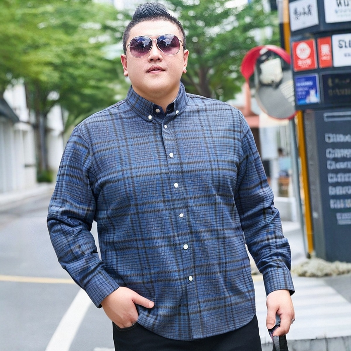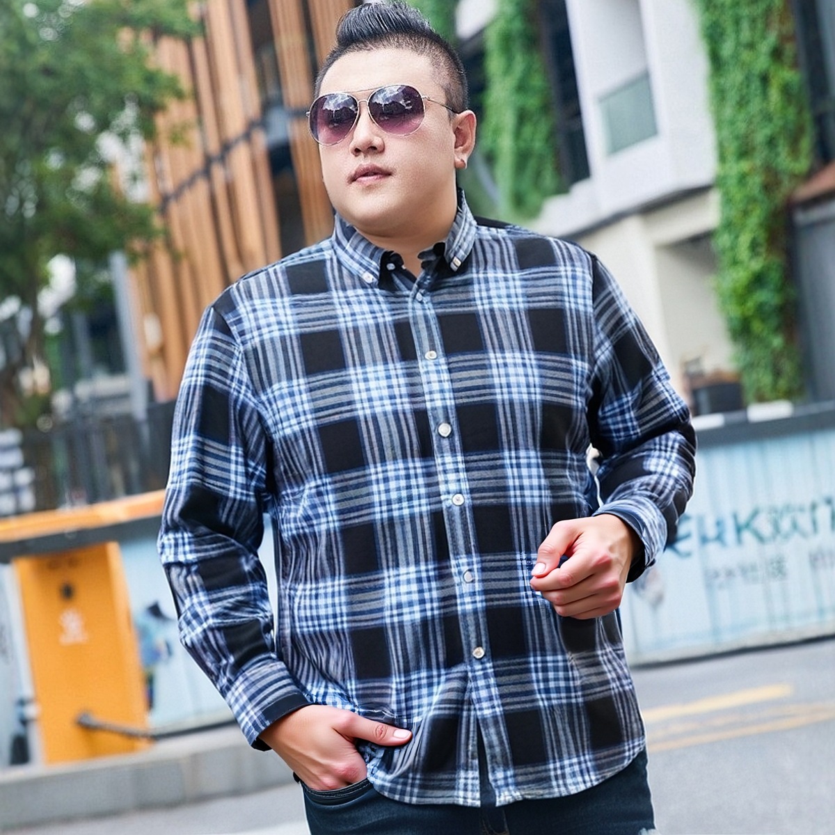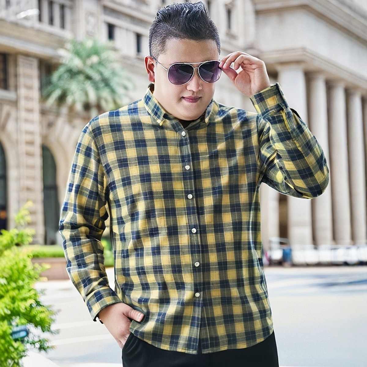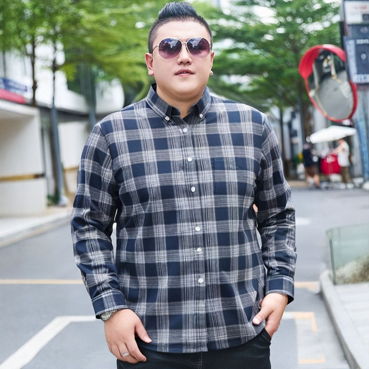 플러스 사이즈 남성 봄, 가을 뚱뚱한 남자 비즈니스 캐주얼 기모 원사 염색 격자 무늬 셔츠 뚱뚱한 남자 플러스 사이즈 루즈스토어 가기