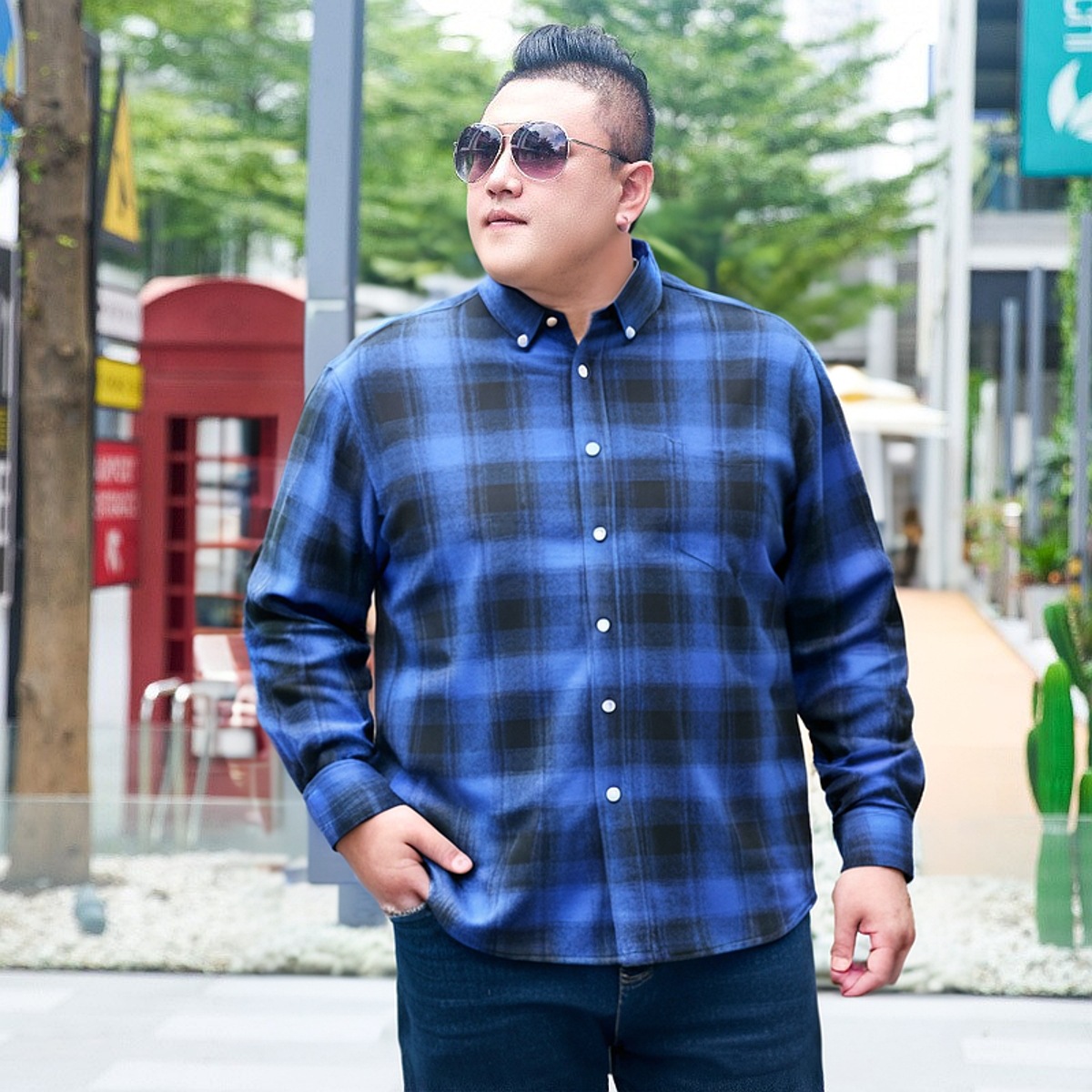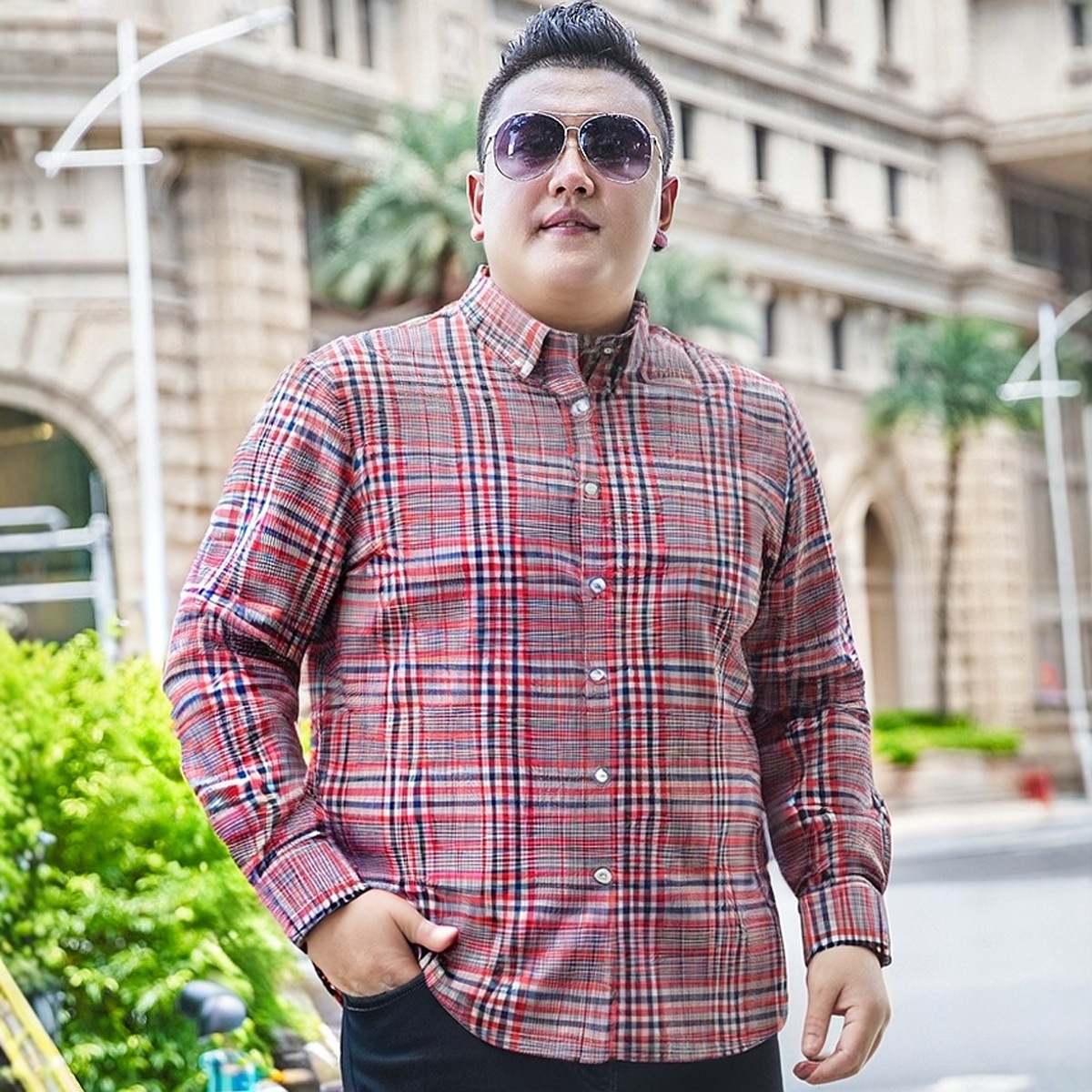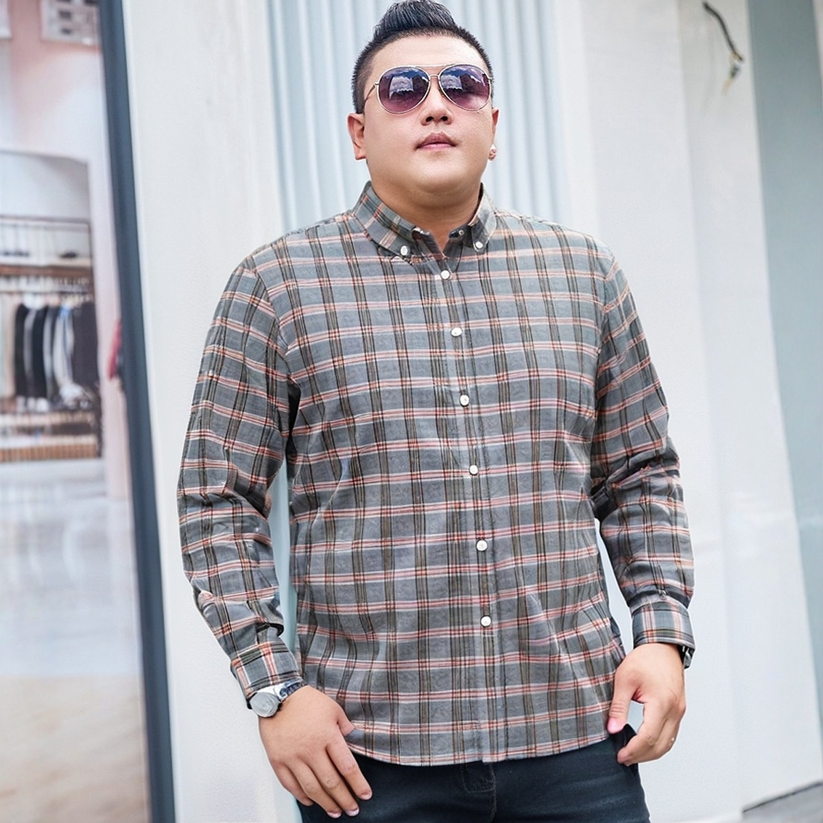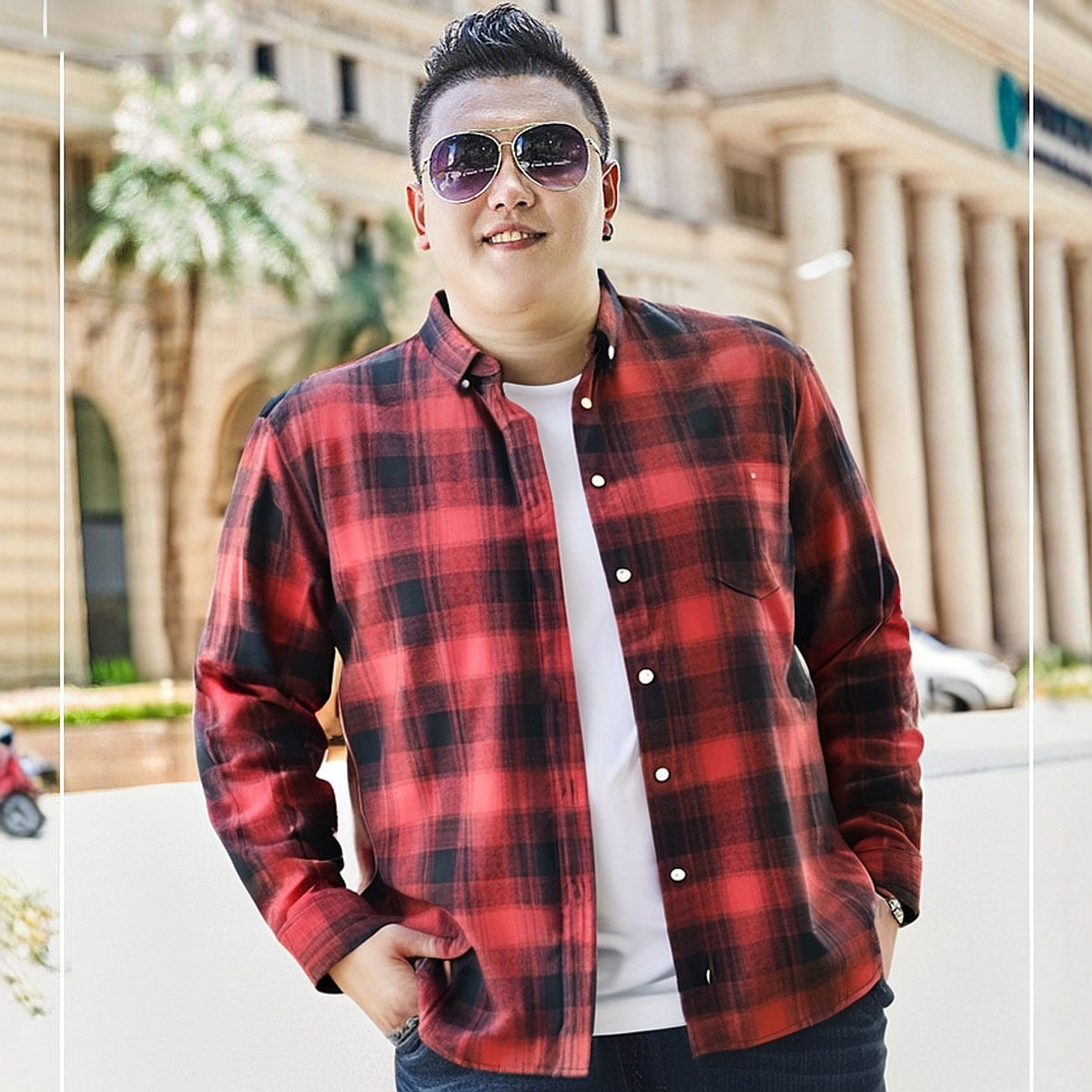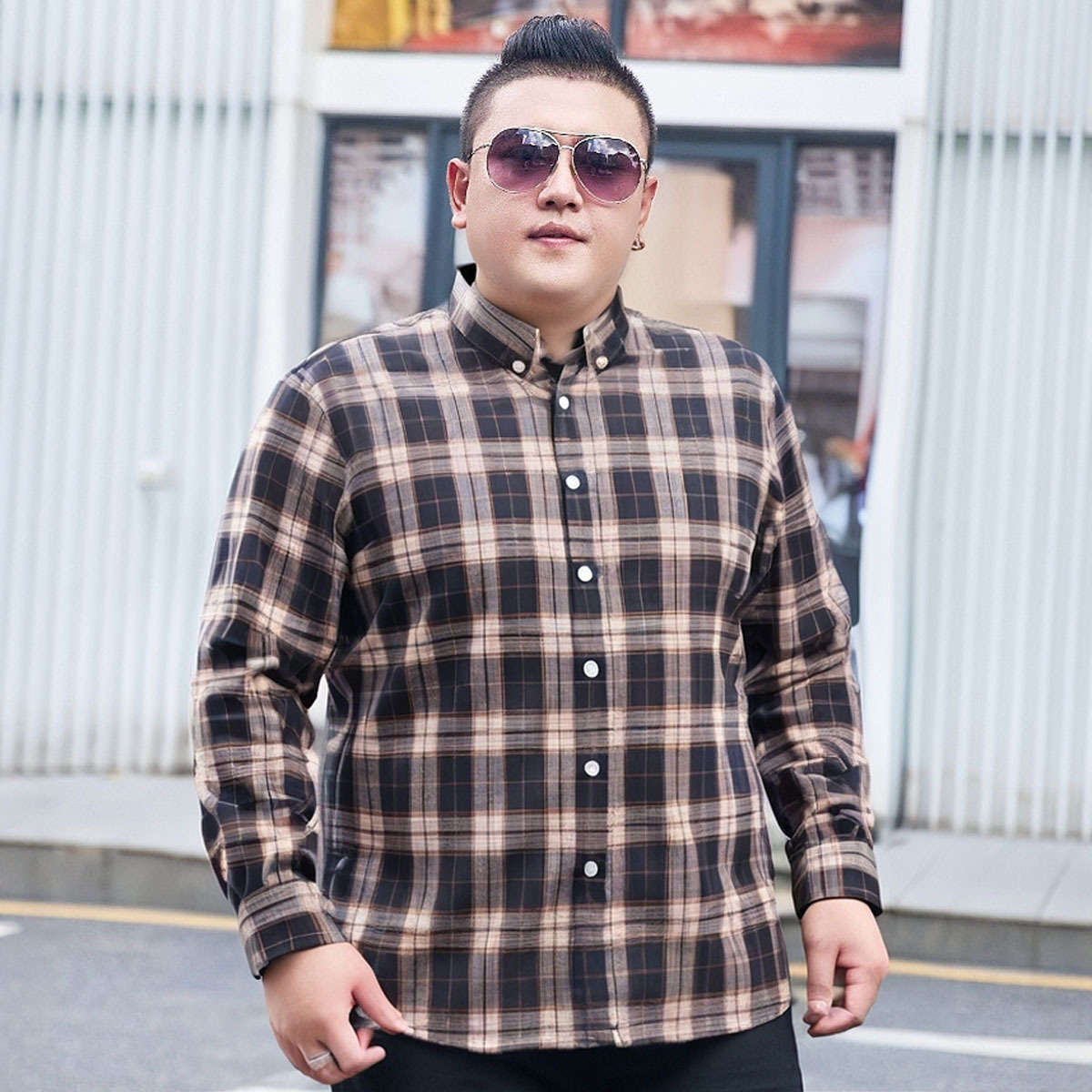 플러스 사이즈 남성 봄, 가을 뚱뚱한 남자 비즈니스 캐주얼 기모 원사 염색 격자 무늬 셔츠 뚱뚱한 남자 플러스 사이즈 루즈스토어 가기