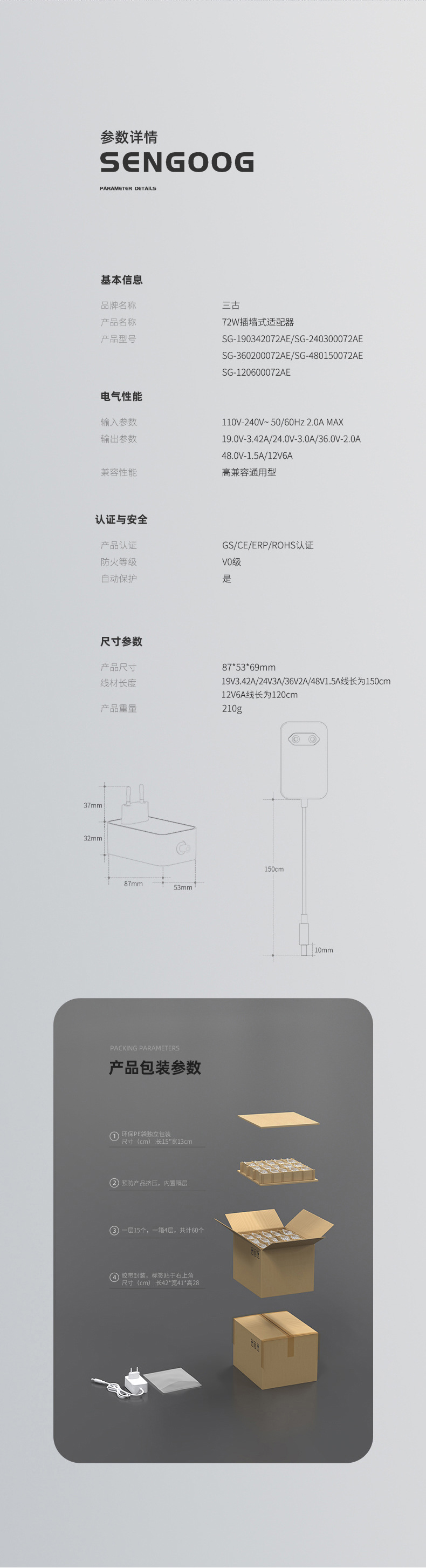 독일 및 유럽 규정 12V6A/24V3A/36V2A/19V3.42A/48V1.5A 어댑터 GS 인증 수평 전원 공급 장치