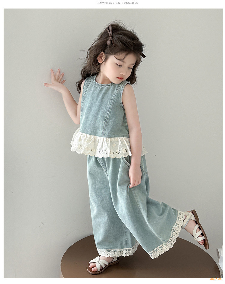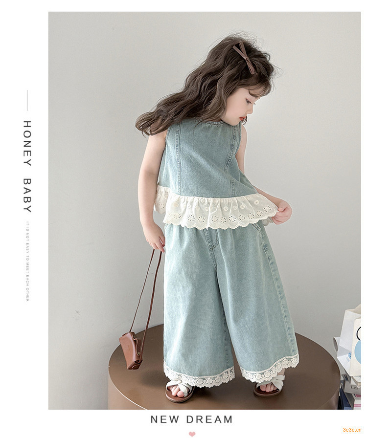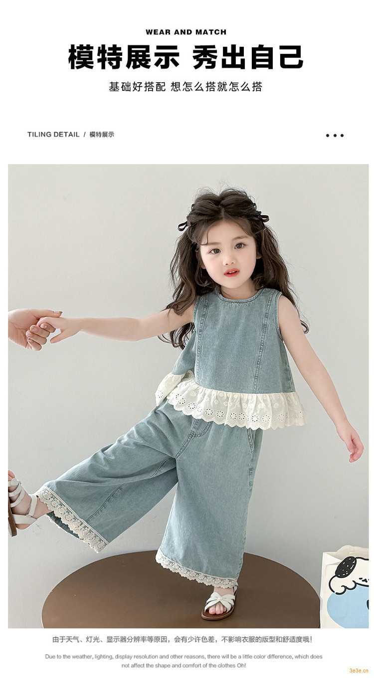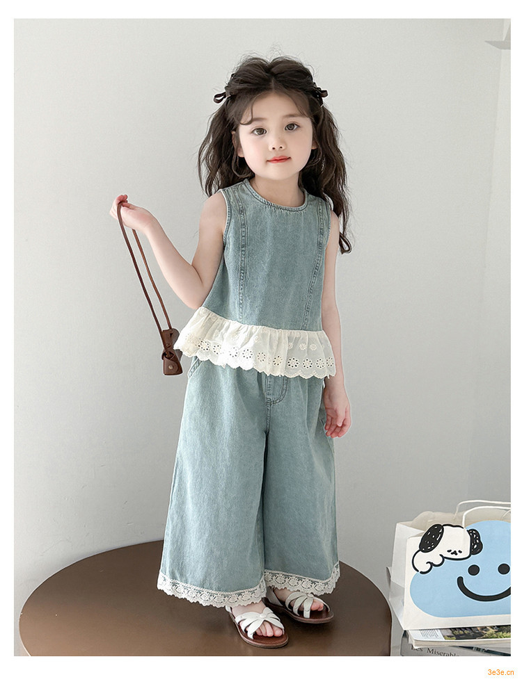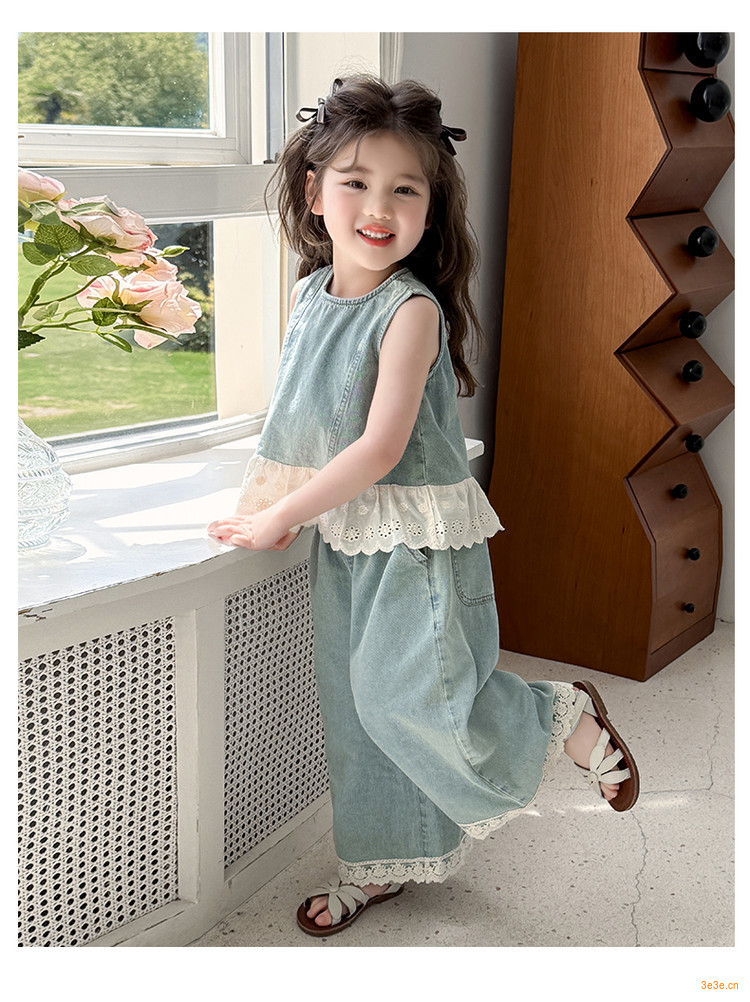 여자 여름 세트 2025 새로운 데님 레이스 세트 캐주얼 민소매 조끼 느슨한 넓은 다리 바지 투피스 세트스토어 가기