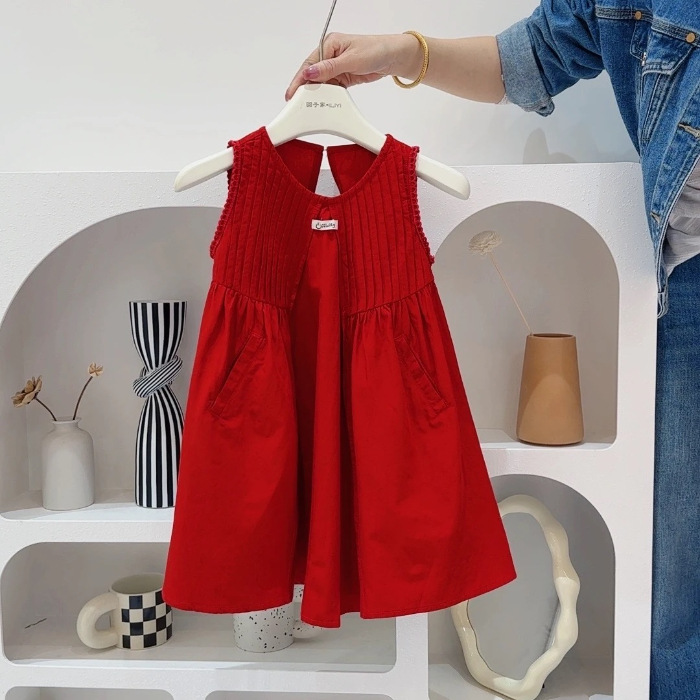 여자 드레스 여름 민소매 조끼 스커트 2025 한국 스타일 아기 소녀 유행 빨간 공주 스커트