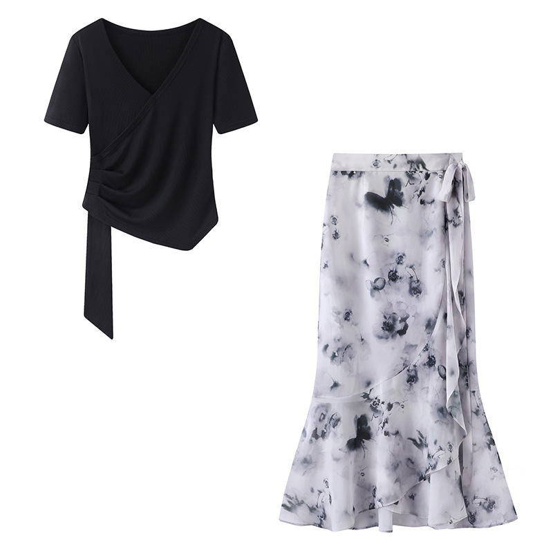 V 넥 탑 불규칙한 곰팡이 스커트 스커트 2025 여름 새로운 여성 캐주얼 세트 625203A010163