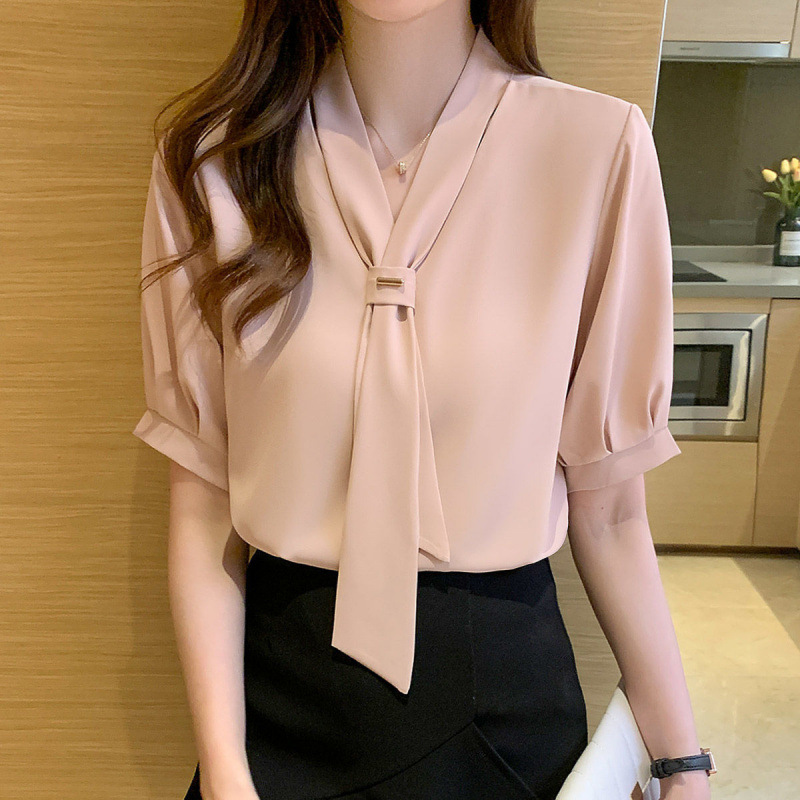 여름 여성 쉬폰 셔츠 통근 여성 여름 의류 2025 새로운 패션 짧은 소매 탑 전문 화이트 셔츠스토어 가기