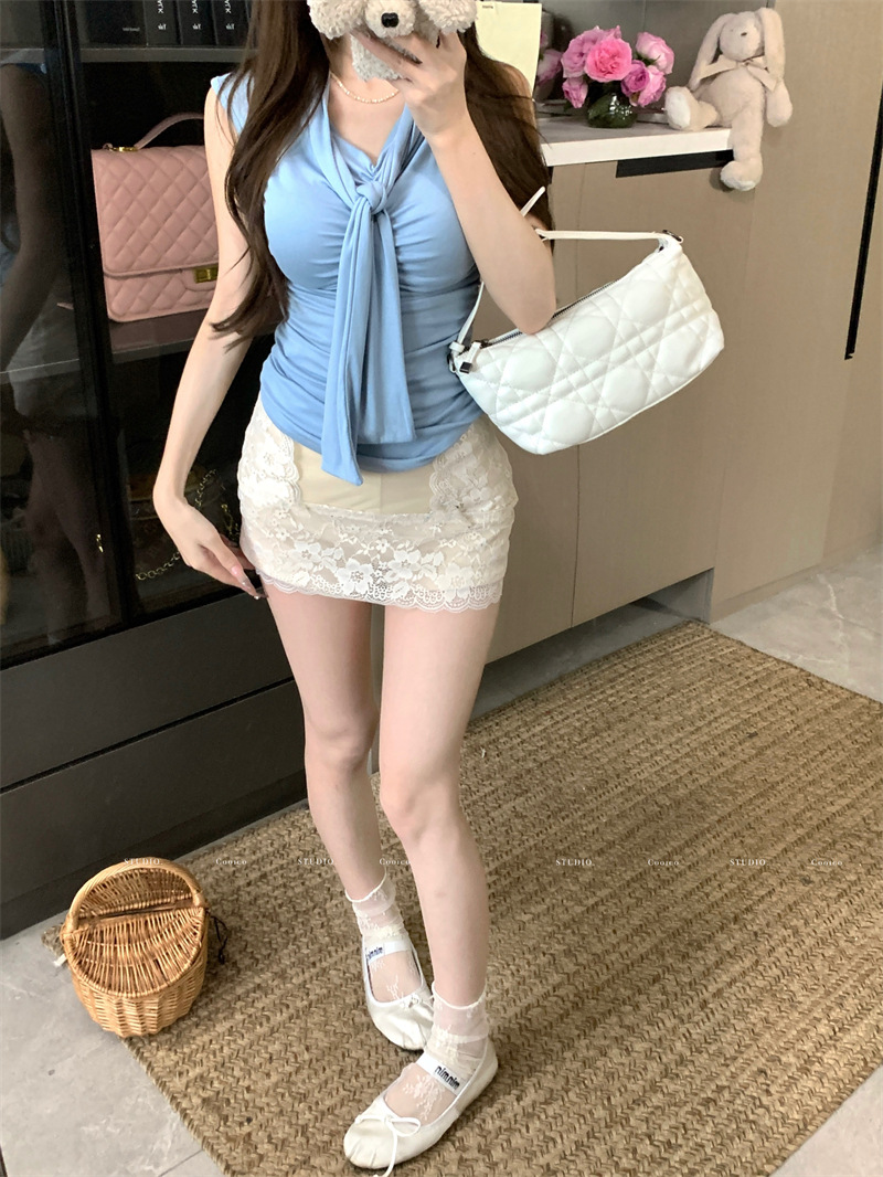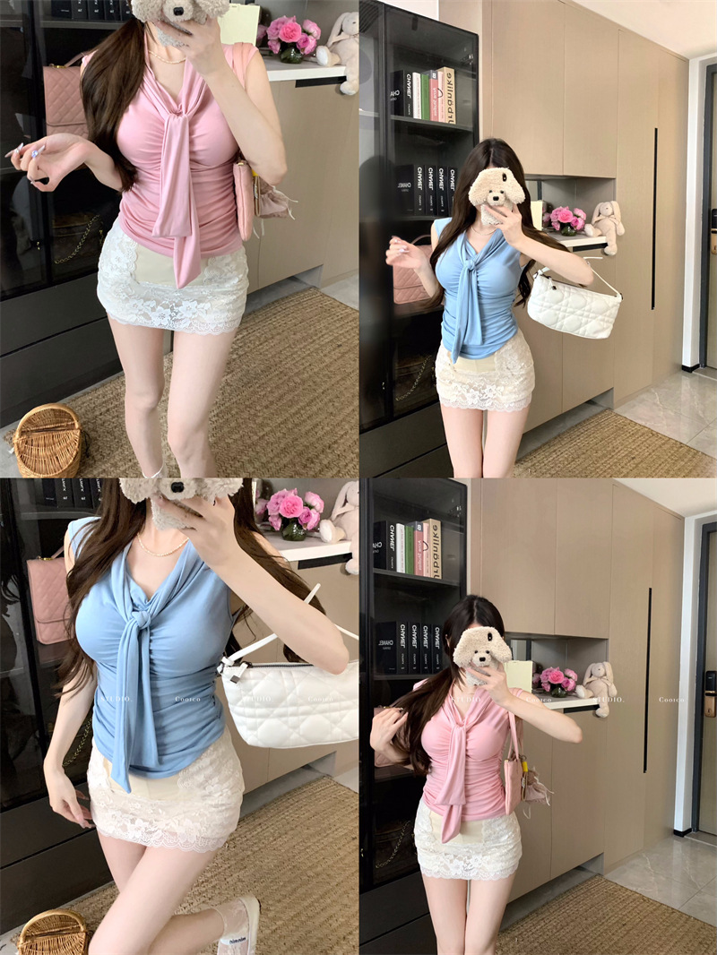 한국식 블루 민소매 티셔츠 여성 여름 디자인 꽉 조이는 우아한 슬림베이스 탑스토어 가기