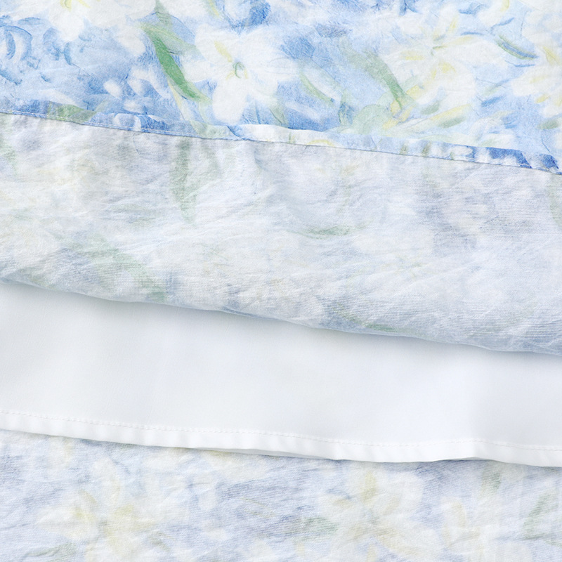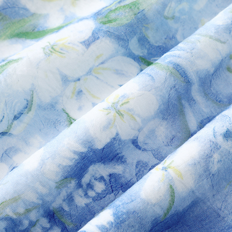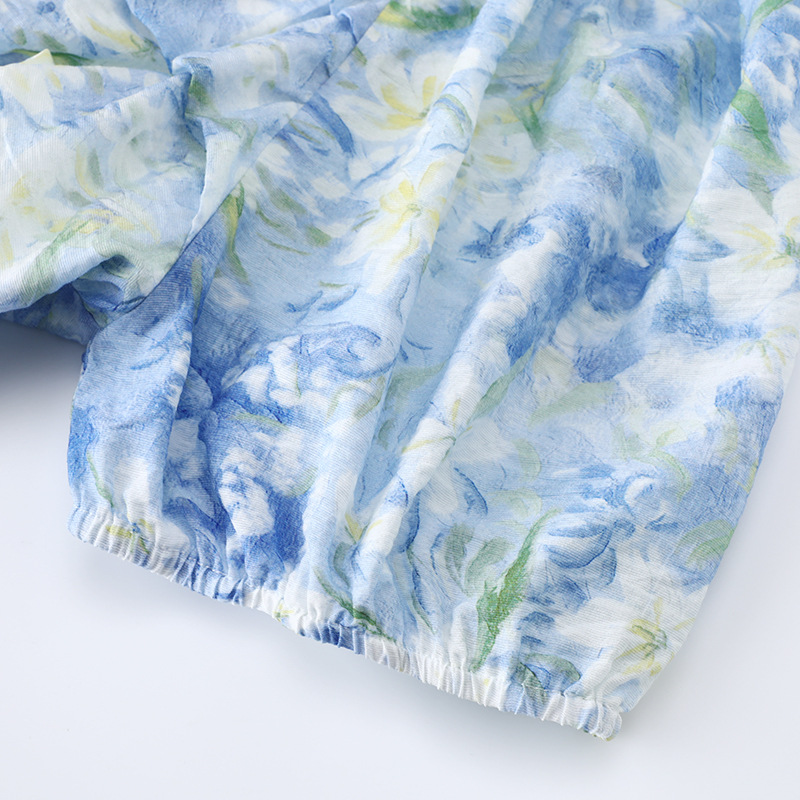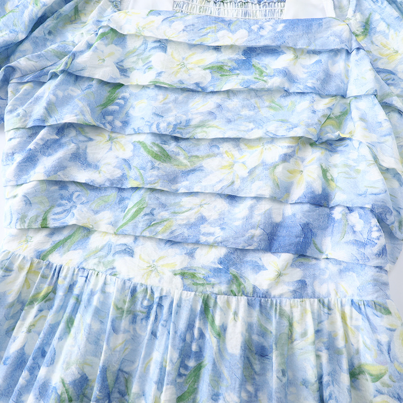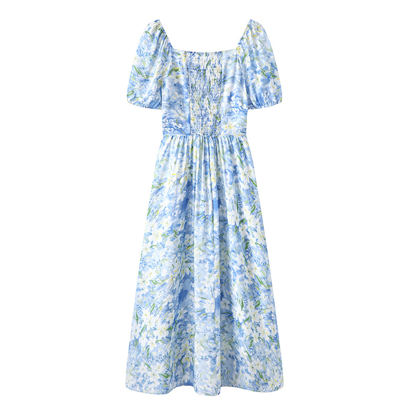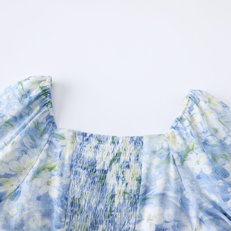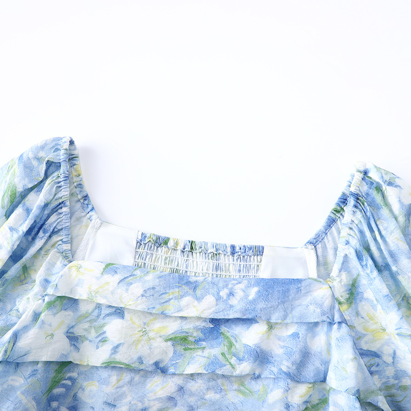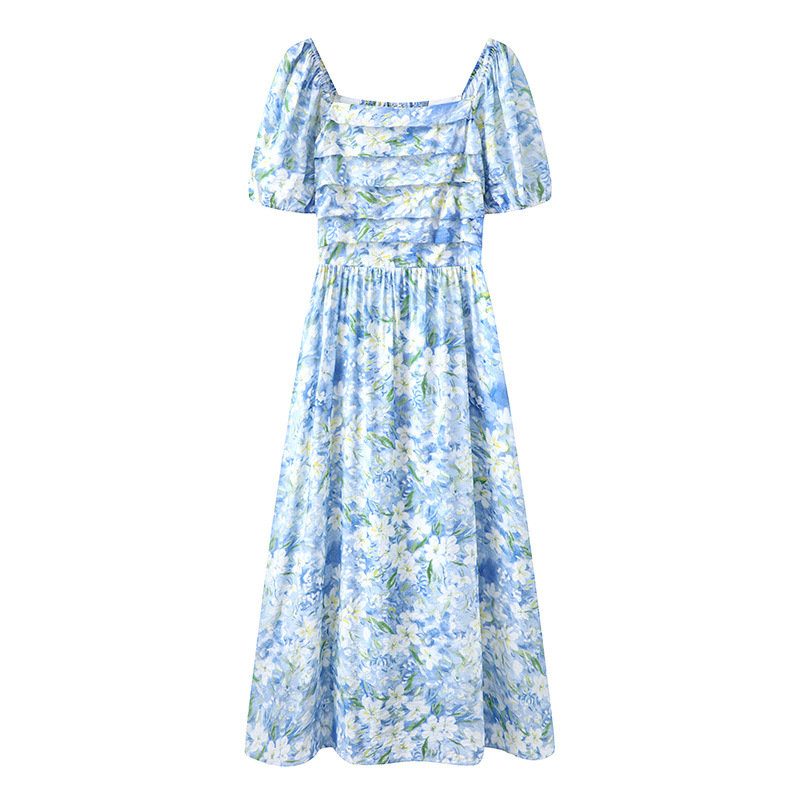 해변 광장 칼라 버블 슬리브 꽃 원피스 여자 2025 여름 새로운 푸른 꽃 긴 원피스스토어 가기