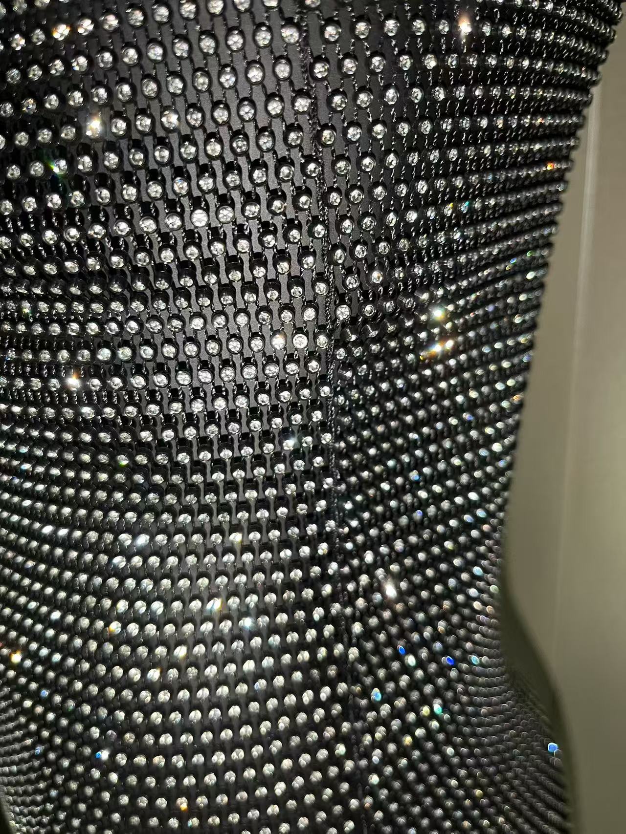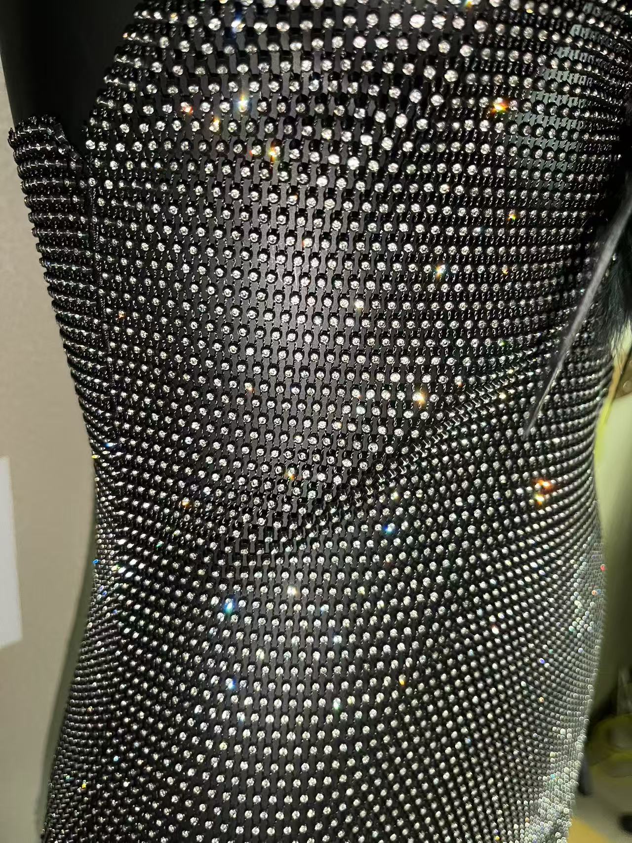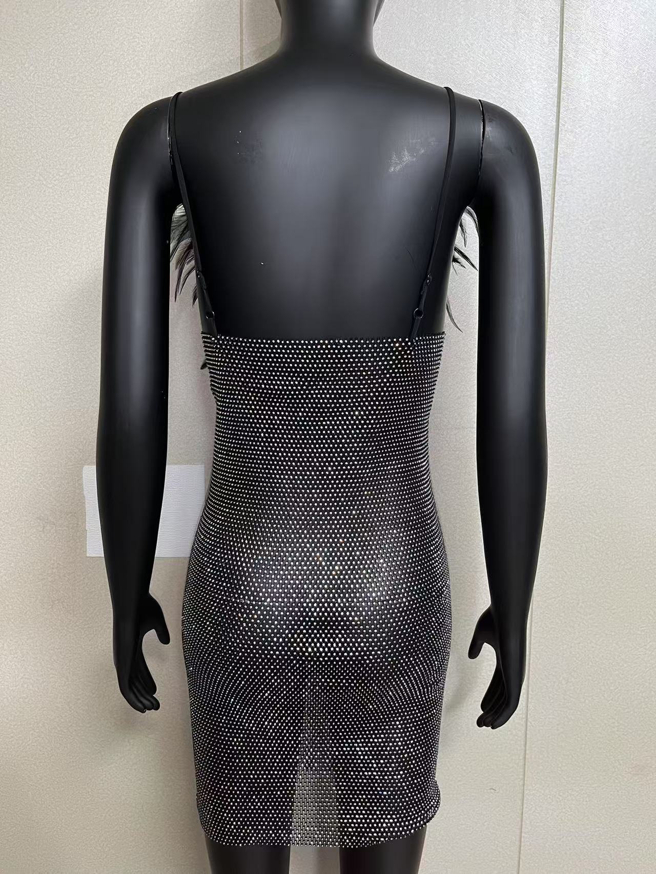 유럽과 미국의 국경 간 20025 새로운 스타일의 섹시한 중공 반짝이는 라인스톤 브이넥 치킨 페더 장식 망사 서스펜더 드레스