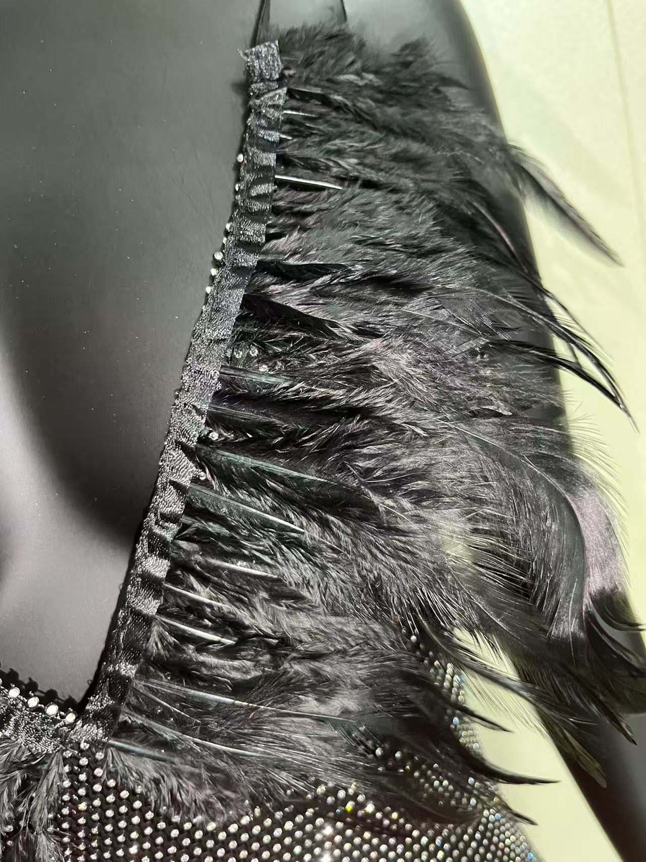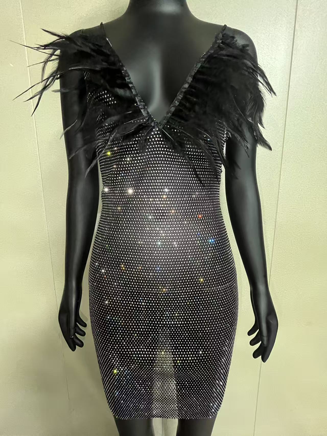 유럽과 미국의 국경 간 20025 새로운 스타일의 섹시한 중공 반짝이는 라인스톤 브이넥 치킨 페더 장식 망사 서스펜더 드레스스토어 가기