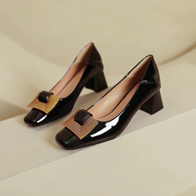 피곤하지 않은 청키 힐 하이힐 신발 2025 새로운 레드 웨딩 신발 중간 굽 봄과 가을 여성 신발 특허 가죽 스퀘어 투 얕은 입 싱글 레이어 신발