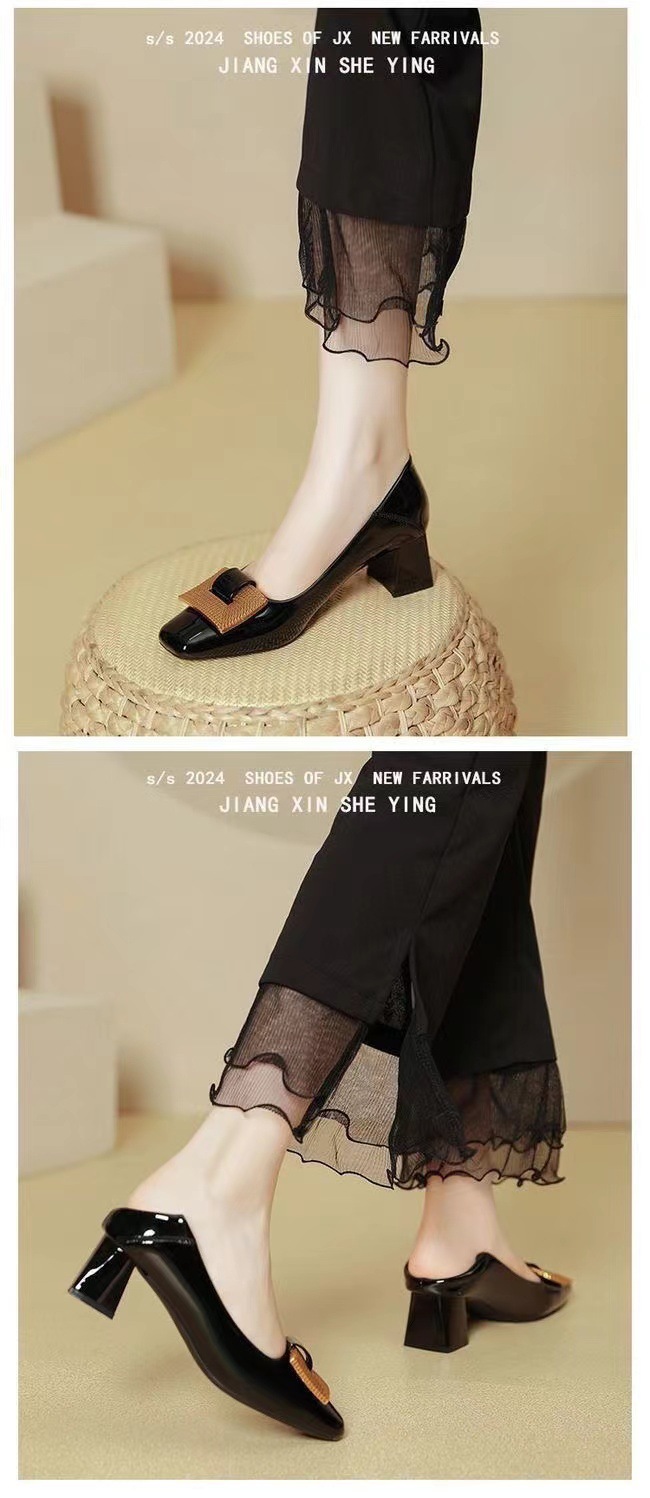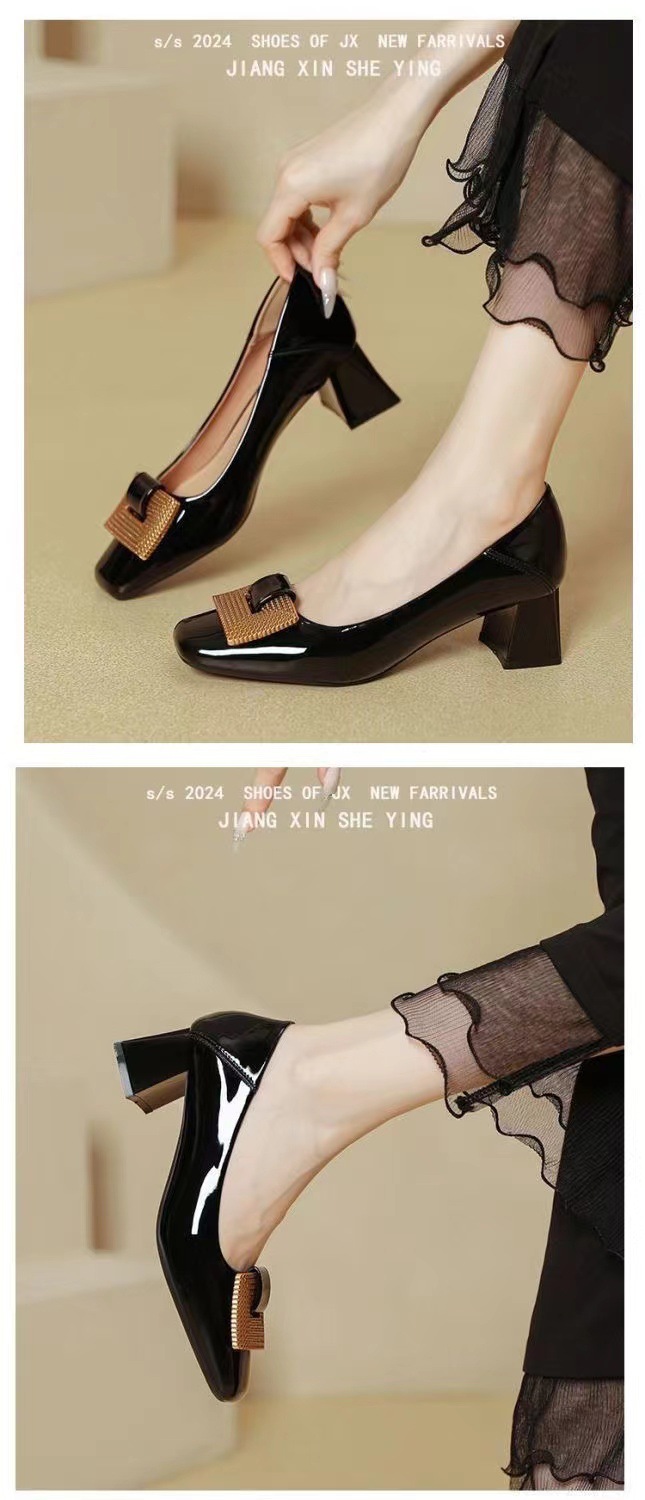 피곤하지 않은 청키 힐 하이힐 신발 2025 새로운 레드 웨딩 신발 중간 굽 봄과 가을 여성 신발 특허 가죽 스퀘어 투 얕은 입 싱글 레이어 신발스토어 가기