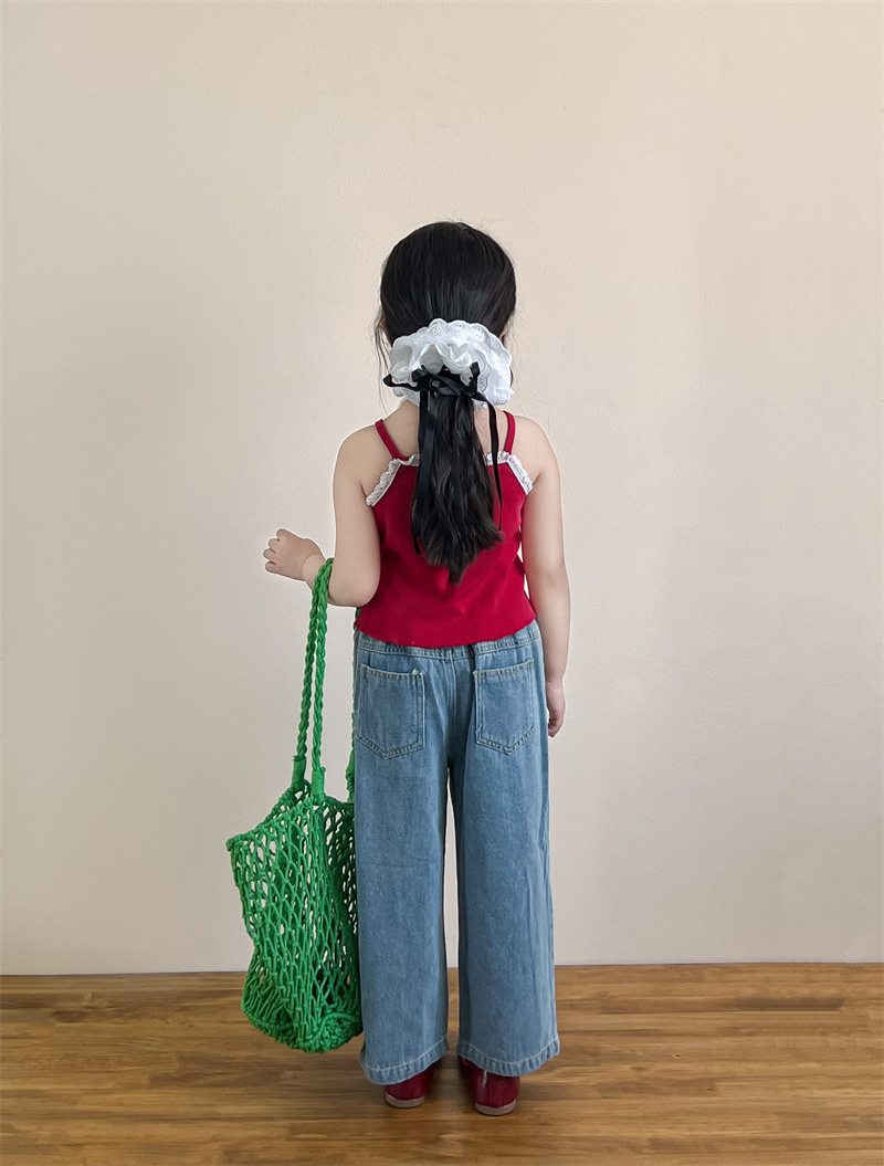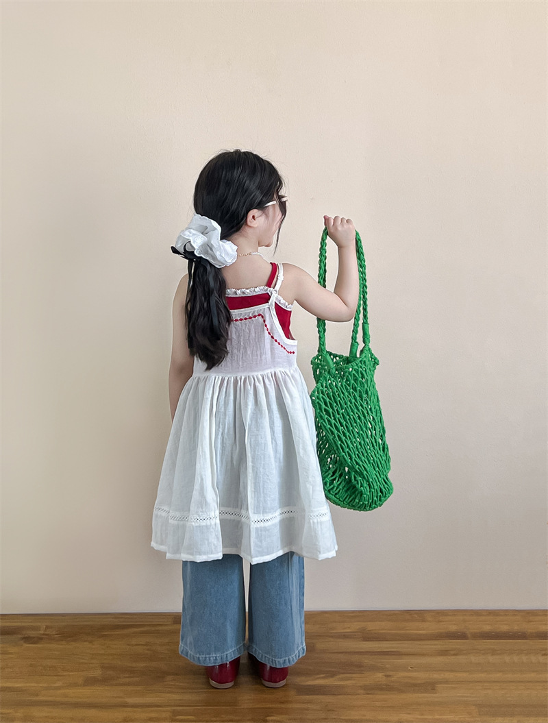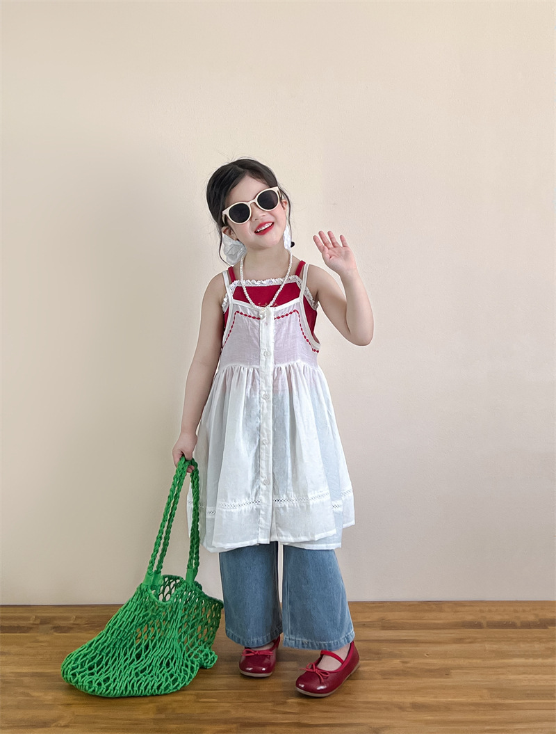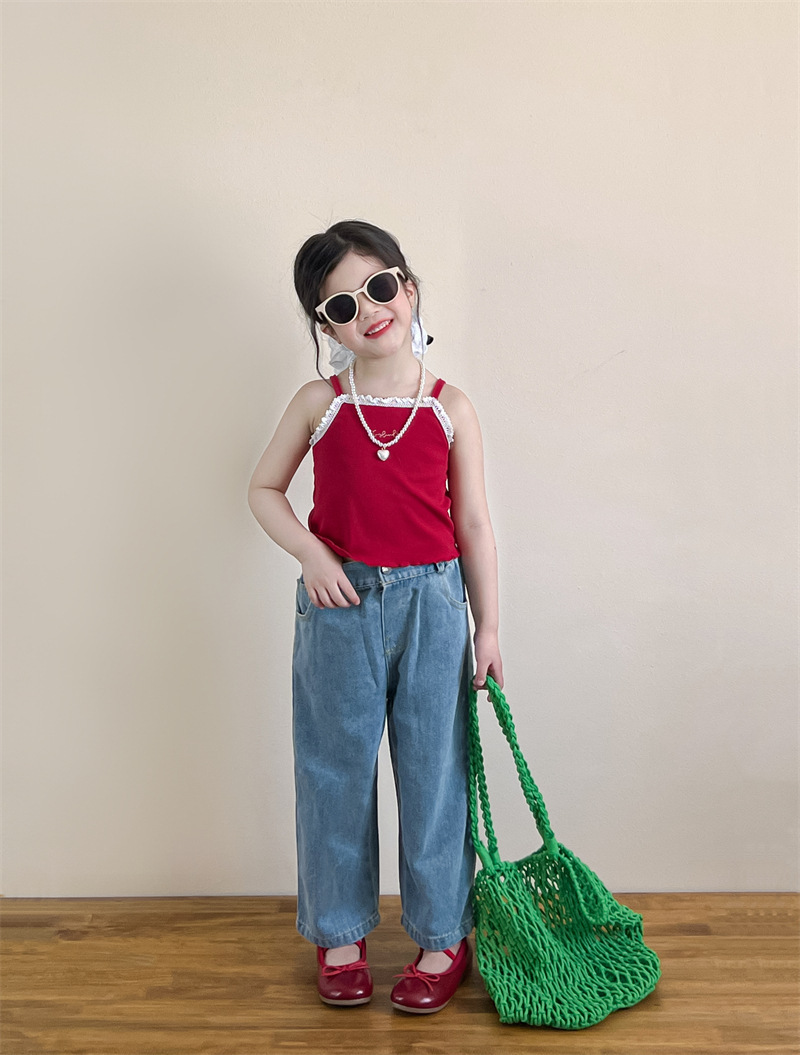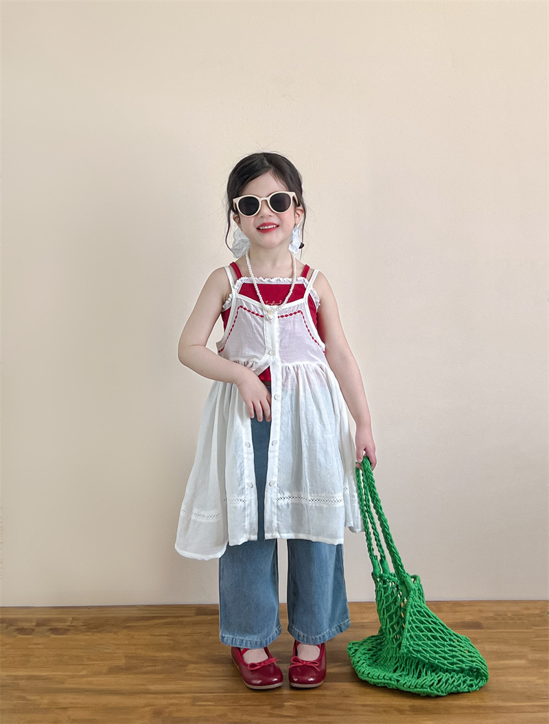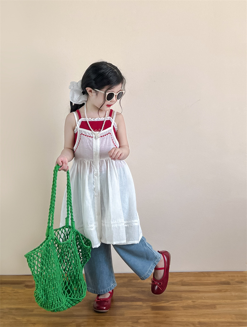 소녀의 여름 달콤한 우아한 자수 레이스 레드 슬링 화이트 버클 블라우스 청바지 별도 샷