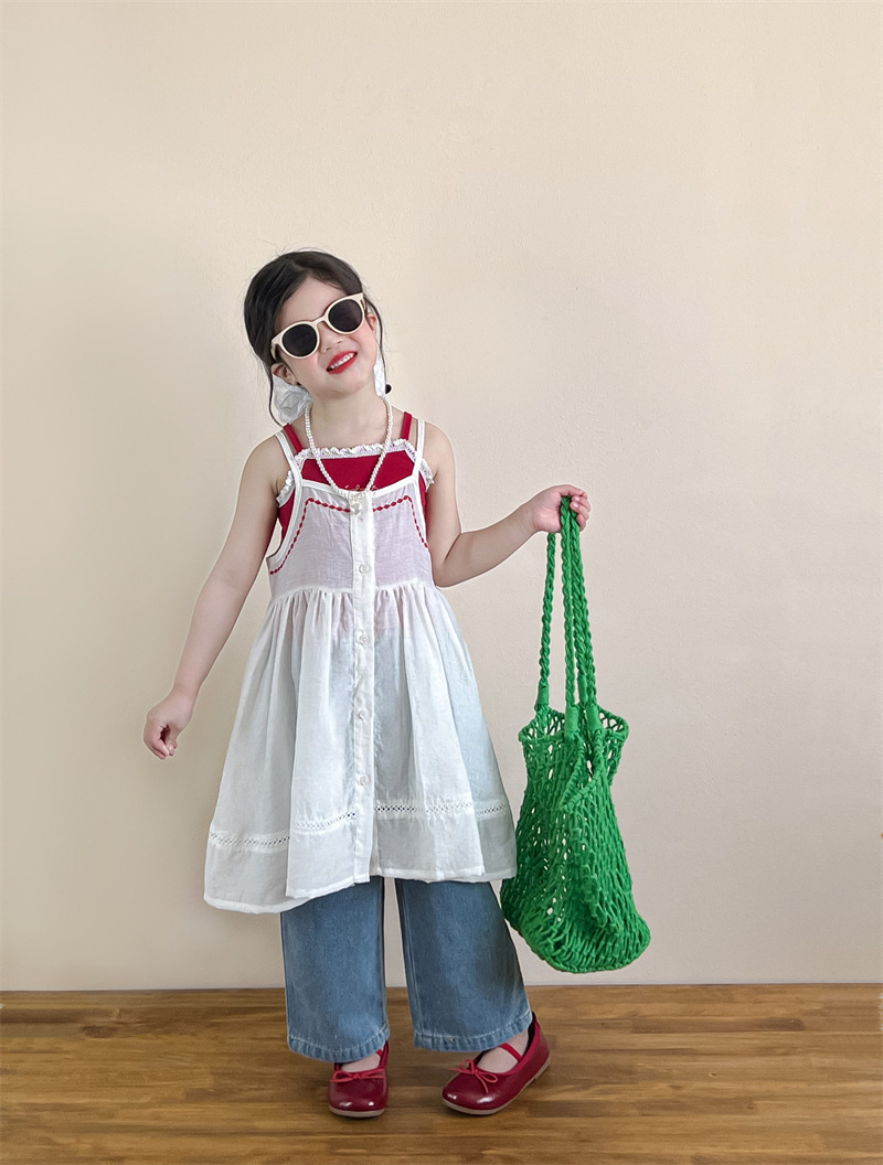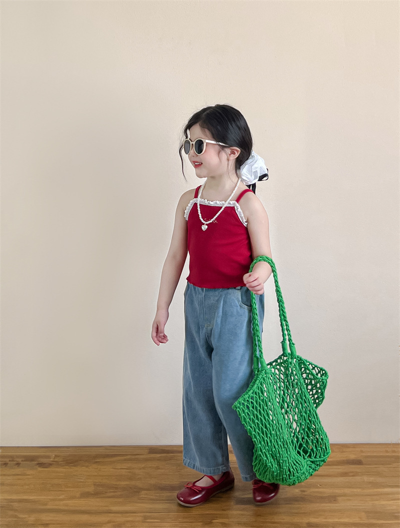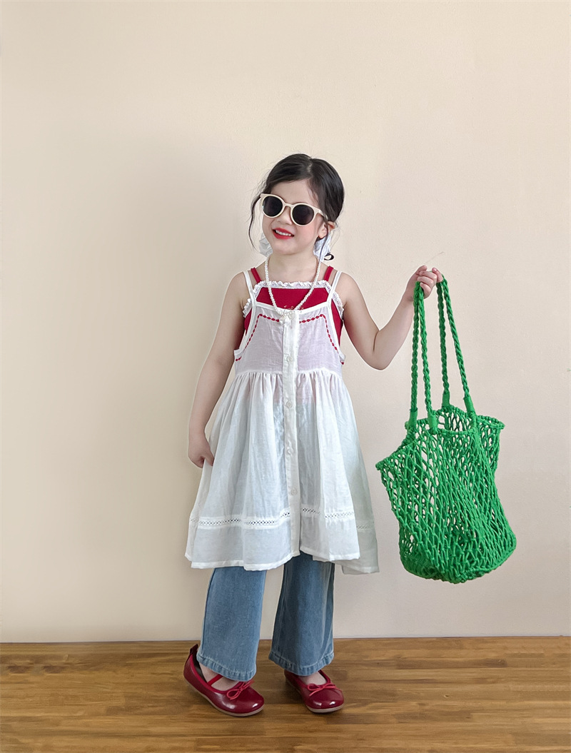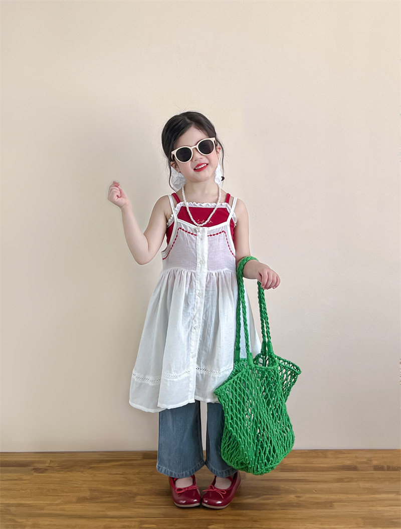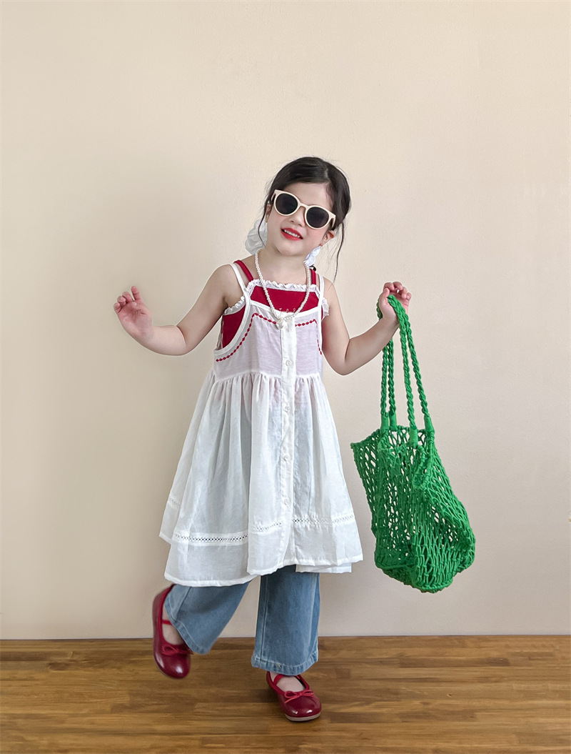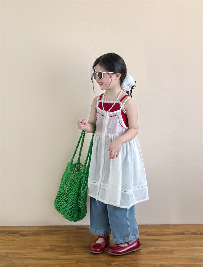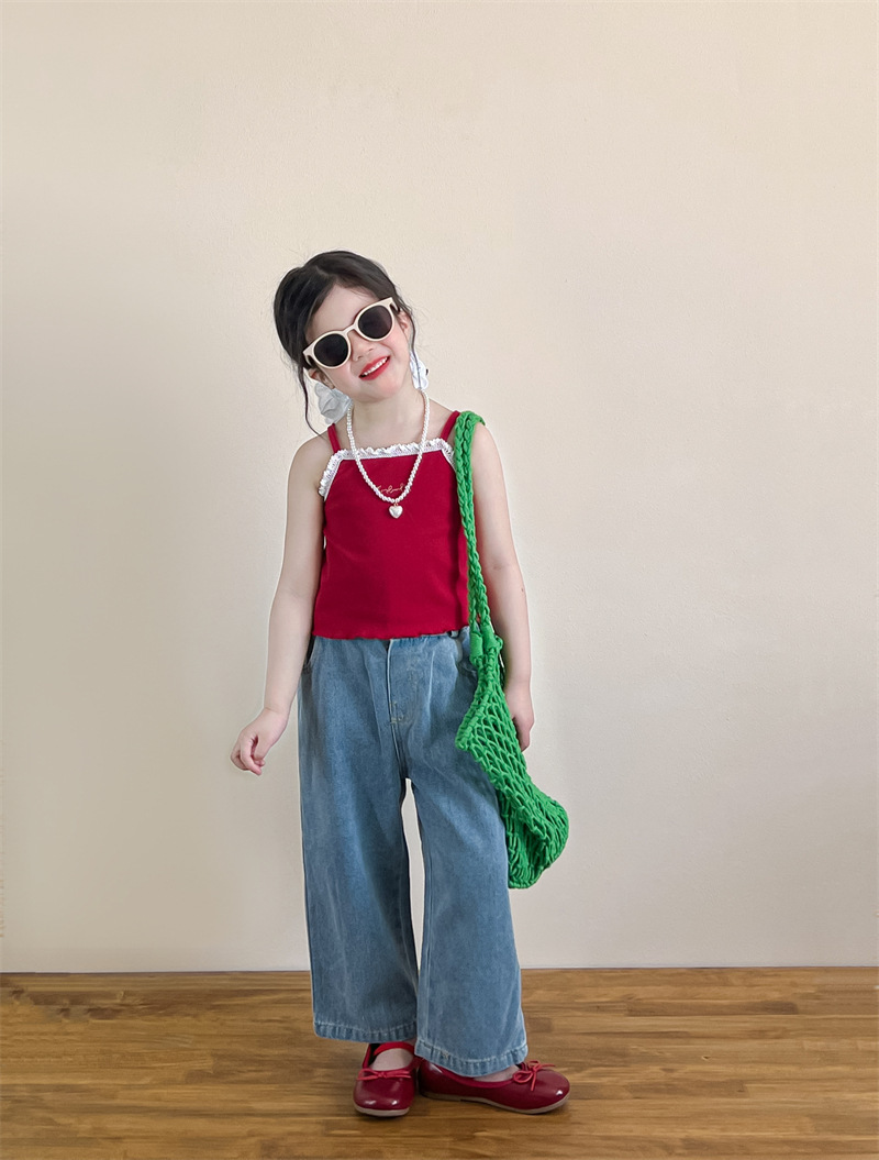 소녀의 여름 달콤한 우아한 자수 레이스 레드 슬링 화이트 버클 블라우스 청바지 별도 샷